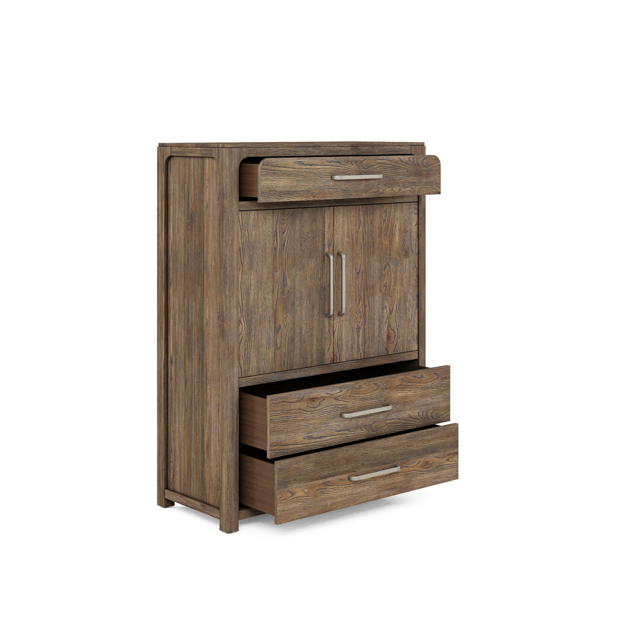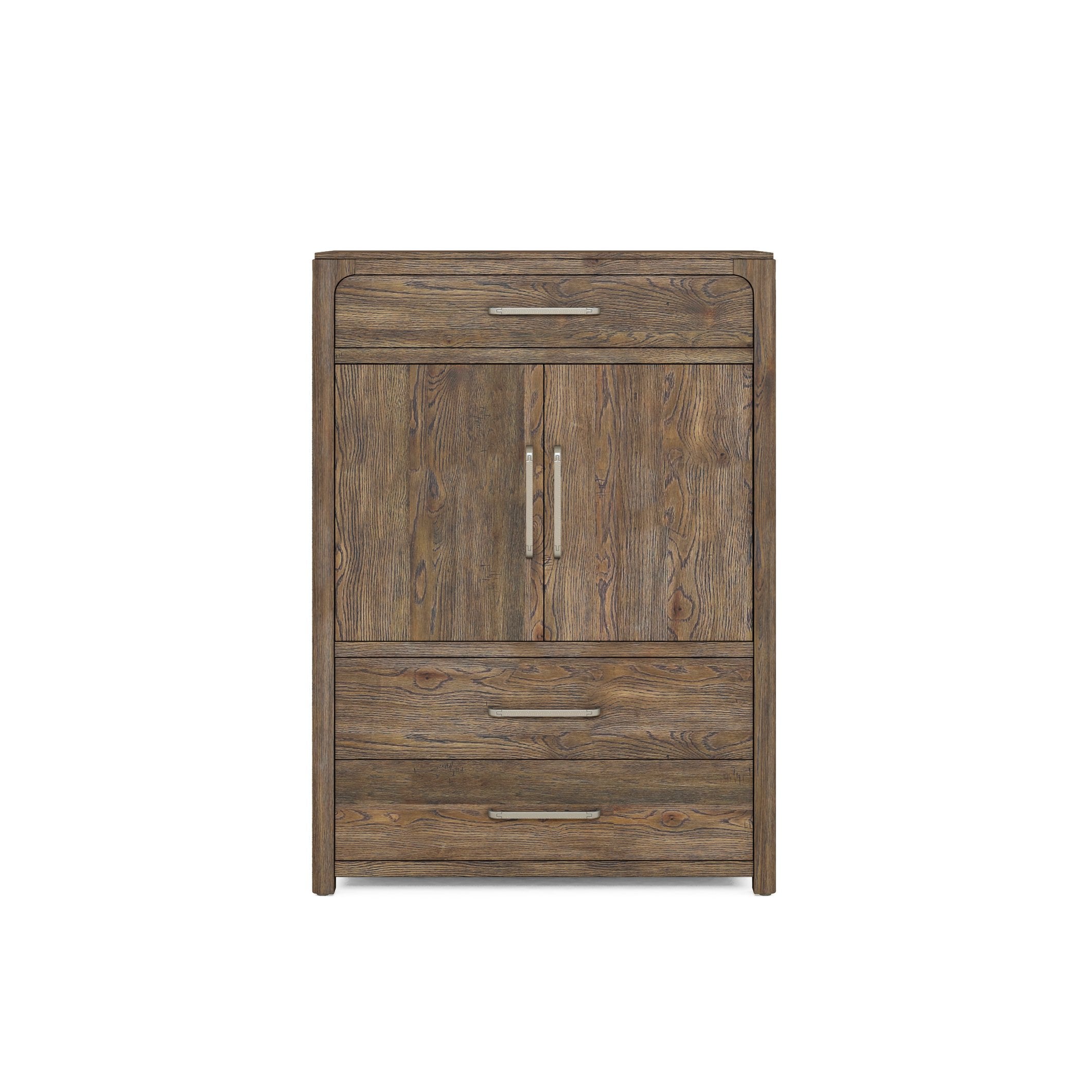 Bring the drama with a collection defined by boldly simple forms that reflects the aesthetic of a global traveler. Hefty wood in an oiled oak style is angular and eye-catching, accented by subtly arched details reminiscent of doorways around the world that lead to mystery and intrigue. This look honors natural materials with a knotty, highly visible wood grain highlighted by subtle metallic finishes and finely tailored upholstery, for a look that’s equal parts eclectic and chic.
