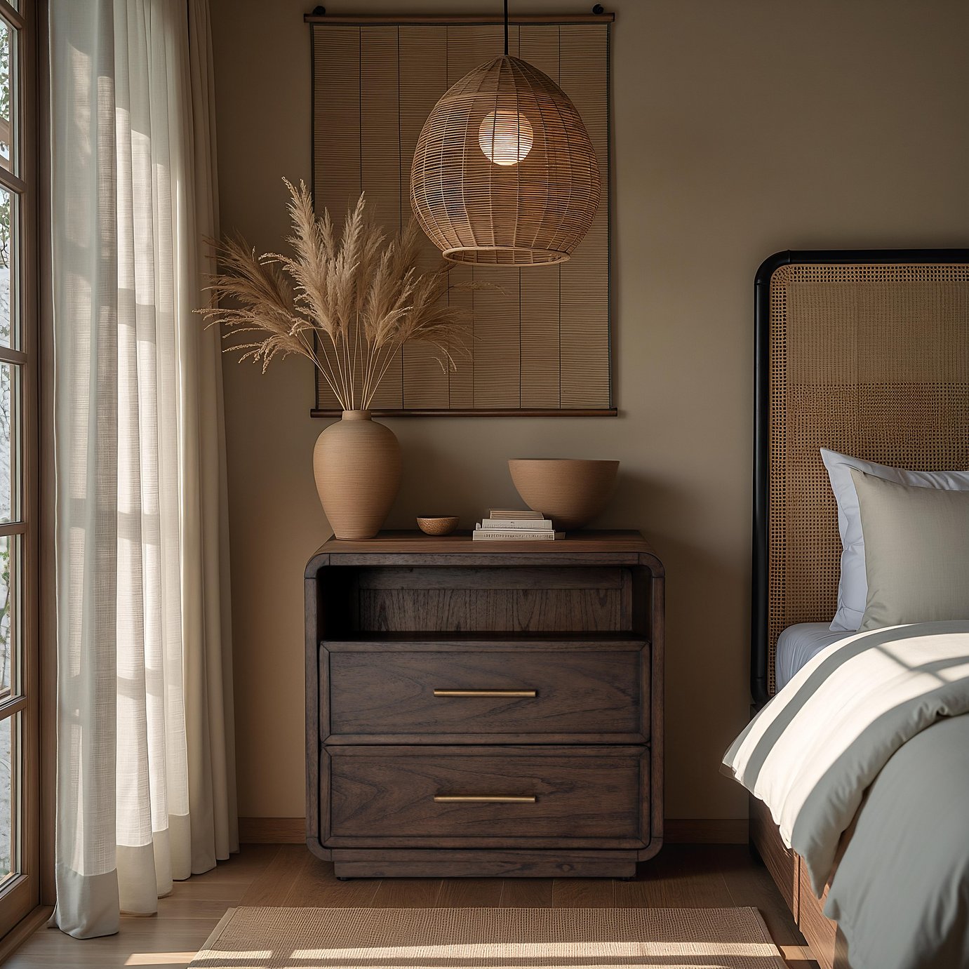 - Suitable For: Keeping bedside essentials organized in homes, hotels, or upscale commercial spaces. Its two drawers and open shelf offer storage for books, electronics, or décor.