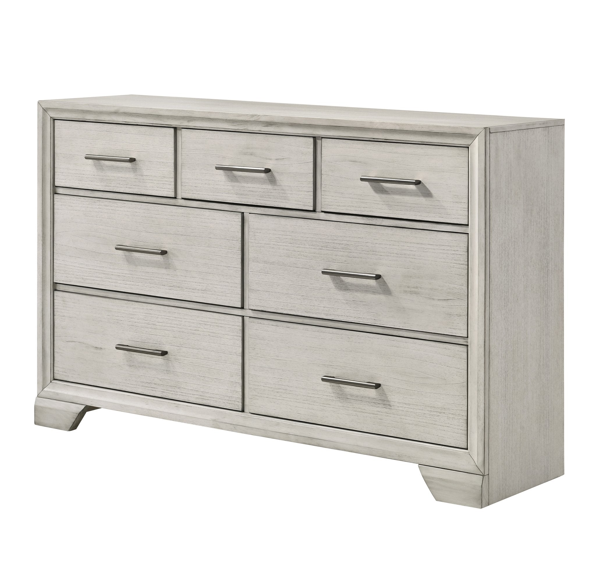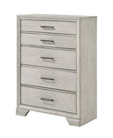 Bring organized, contemporary style to your bedroom with this five-drawer solid wood chest finished in a soft White Mist. Clean lines and a subtle, vibrant wood grain give it a modern yet warm look, while mixed metal knobs and handles add a refined contrast. Spacious drawers and a durable construction provide practical storage for clothing and accessories, making this chest both attractive and functional.