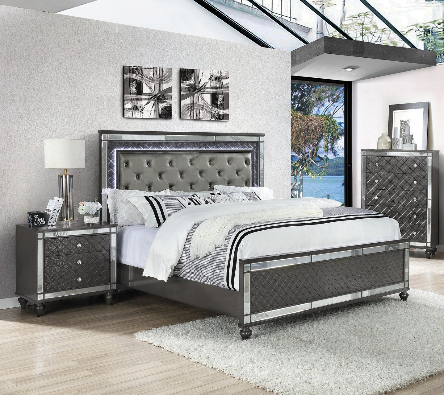 Add a touch of modern glamour to your bedroom with this contemporary 5-drawer chest. The reflective mirror-plating, tapered legs, and faux-crystal knobs create a chic focal point while five spacious drawers keep clothing and accessories neatly organized. Built from solid wood with a gray finish and subtle linear detailing, this chest balances sparkle and structure for an elevated yet functional storage solution.