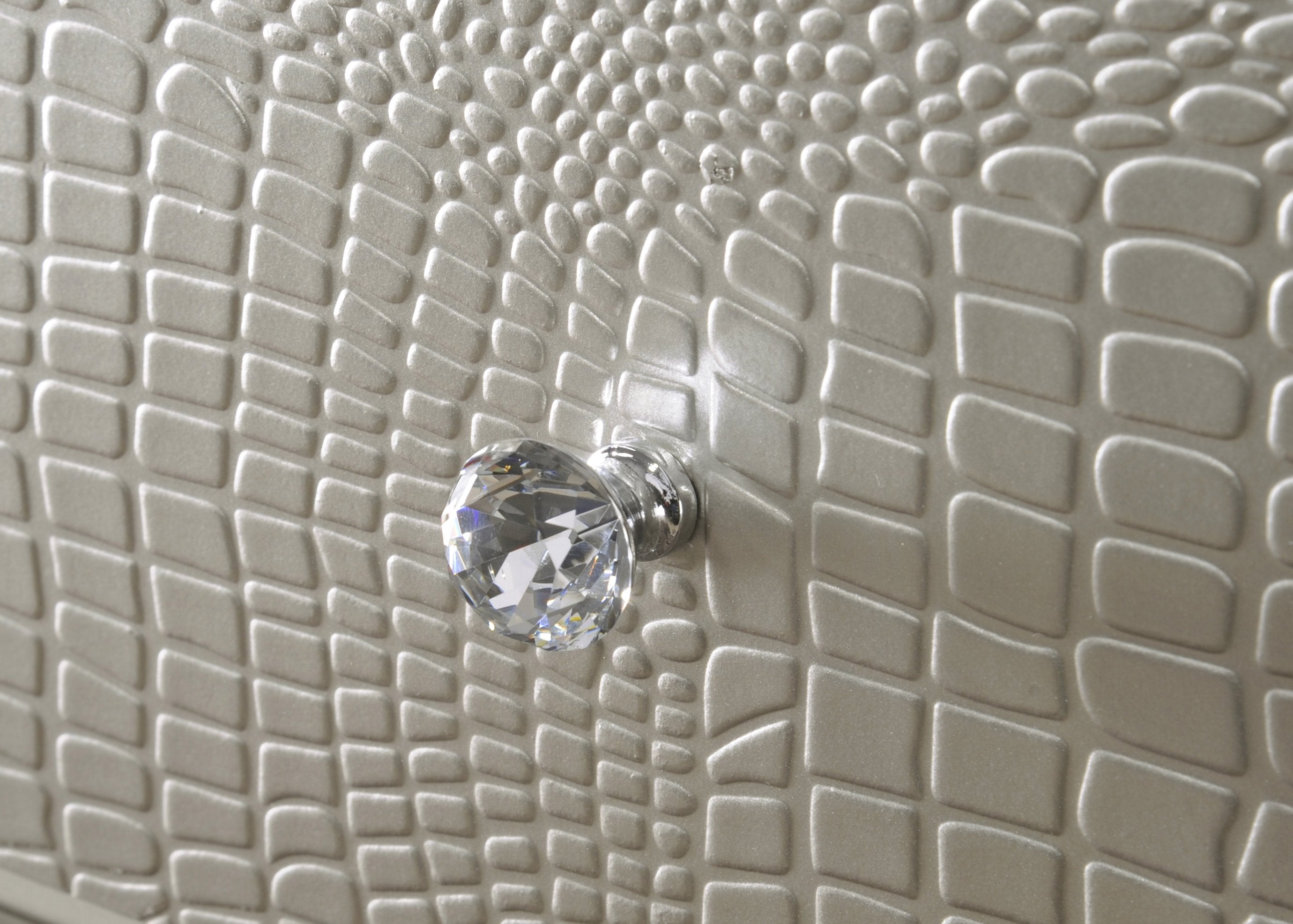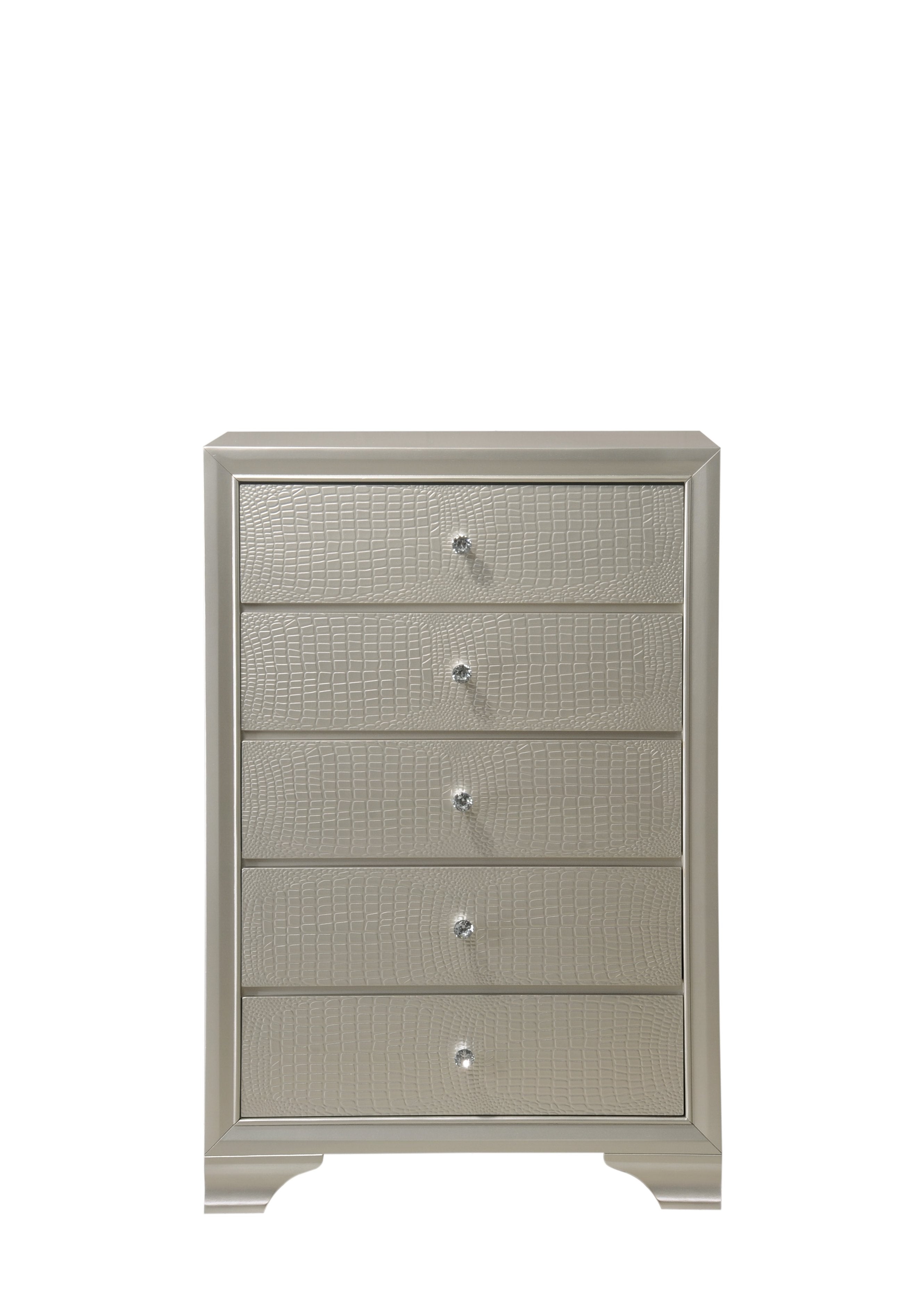 Elevate your bedroom with a modern glam five-drawer chest that combines luxe detailing and practical storage. The embossed champagne crocodile finish, gleaming hardware, and felt-lined top drawer create a refined focal point while sturdy dovetail construction ensures lasting performance. Ideal for dressing areas, master suites, or guest rooms, this chest pairs seamlessly with matching bedroom pieces to complete a coordinated look.
