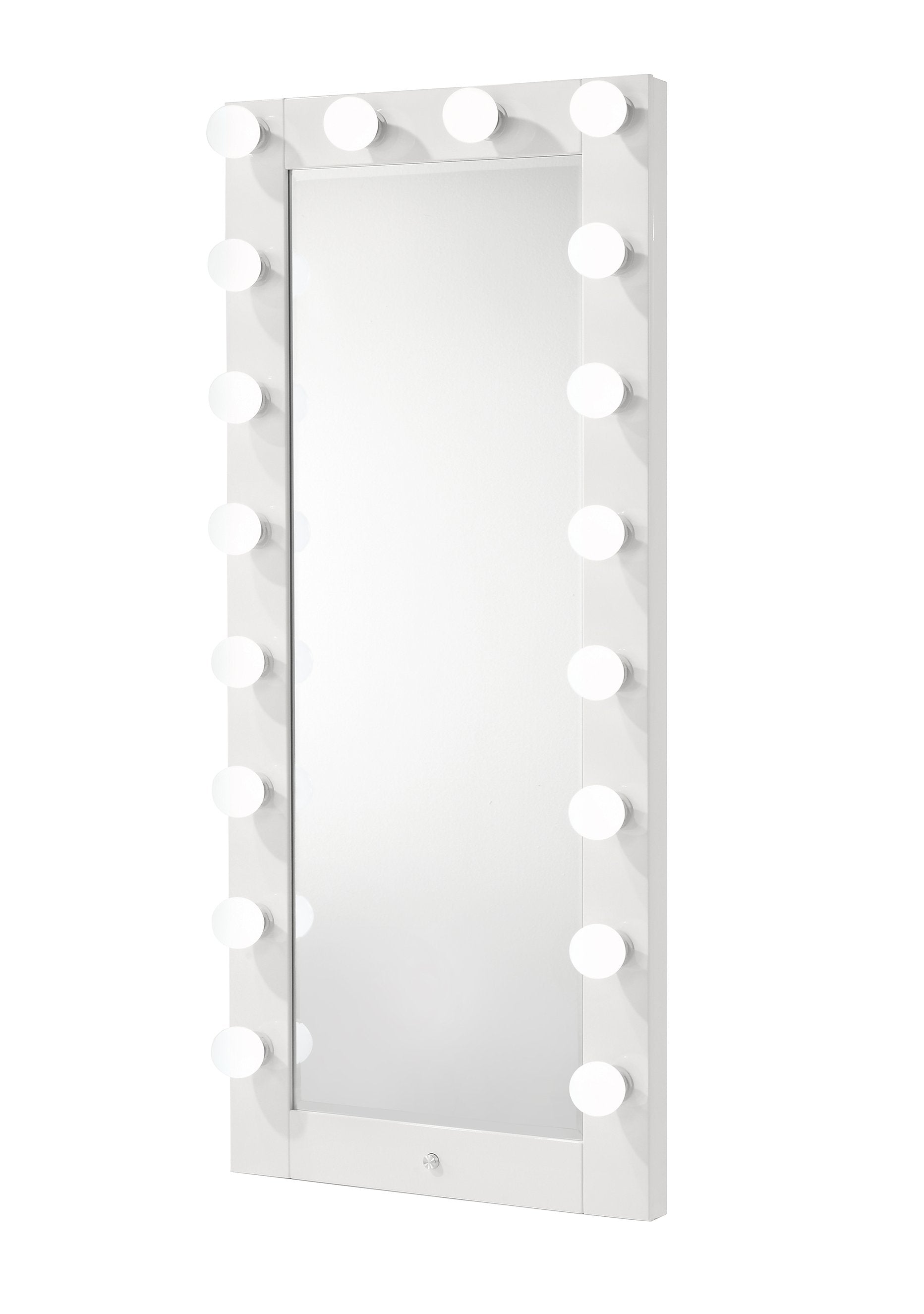 - Full-length beveled mirror with surrounding integrated lights for even illumination and clearer visibility when dressing or applying makeup.