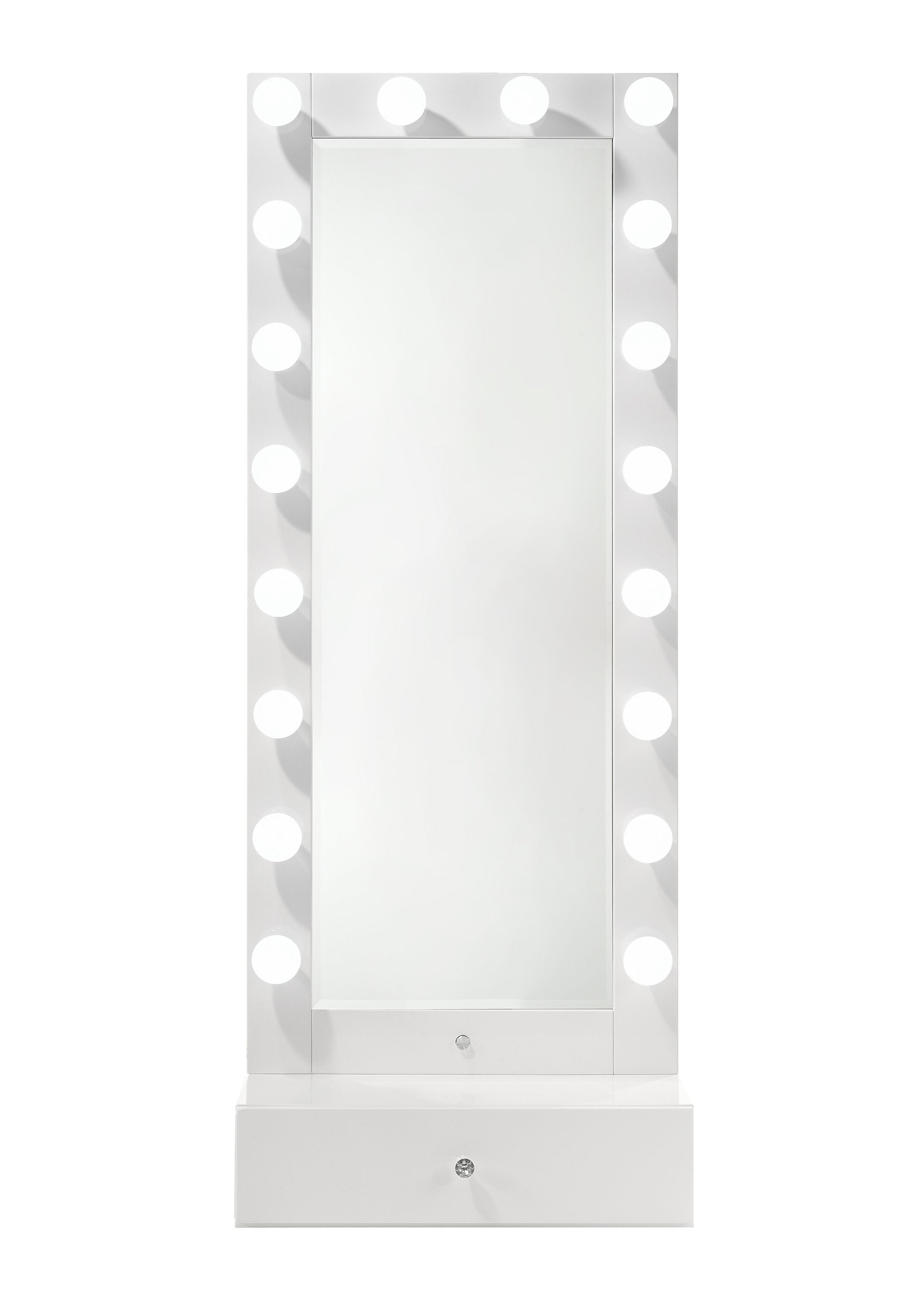Elevate your dressing area with a glamorous, functional statement piece that blends modern design with practical storage. This tall lighted mirror offers a full-length view, integrated lighting for flawless grooming, and a roomy drawer to keep accessories organized — all finished in a high-gloss white with a beveled edge and a crystal-style knob for a refined, boutique look.