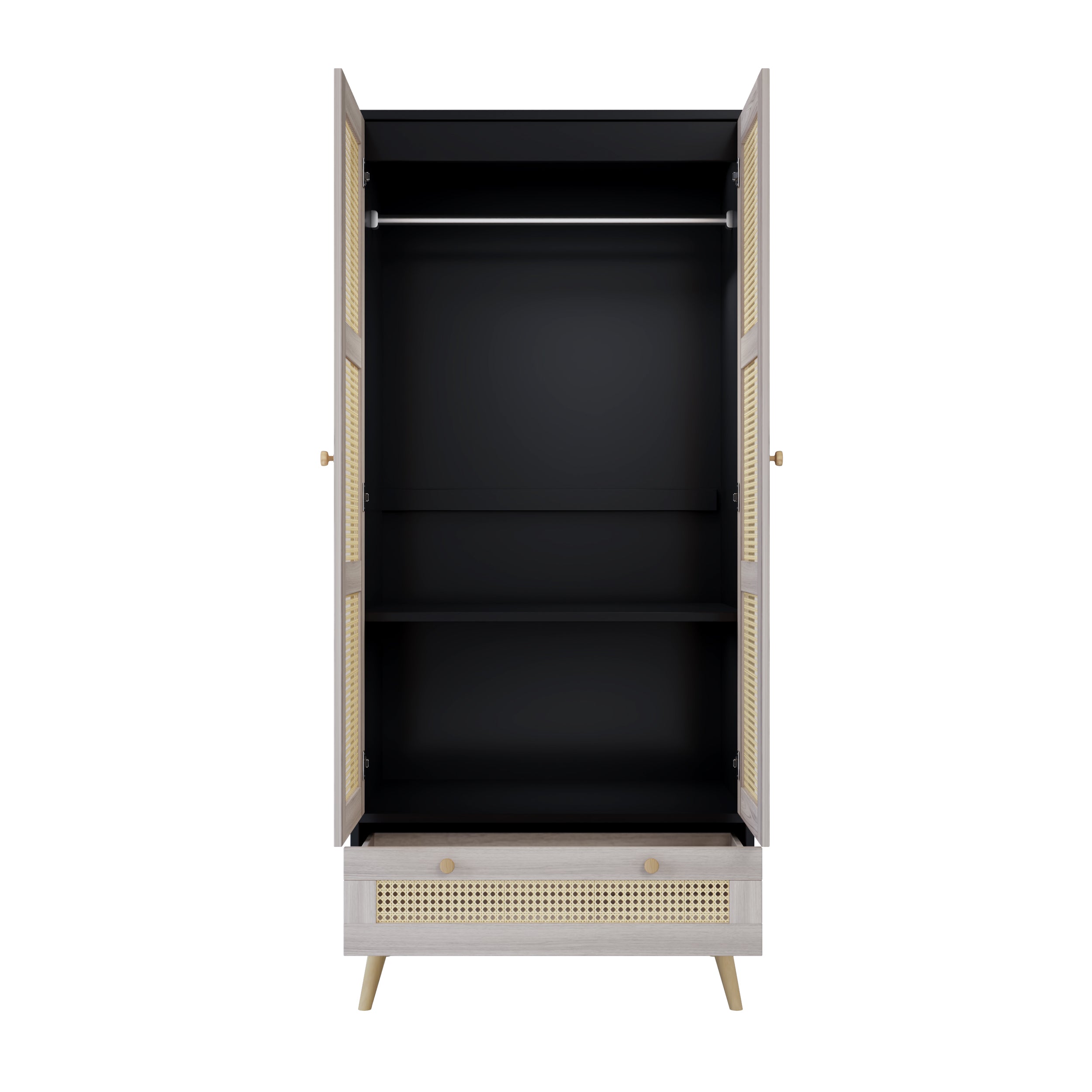 Bring stylish, functional storage to your bedroom or entryway with this boho-inspired armoire. Combining natural rattan accents with a sleek black frame, it offers organized wardrobe capacity in a compact footprint — perfect for apartments, guest rooms, or as a supplemental closet. Thoughtful details like a full-length hanging rod, adjustable shelving, and a smooth-gliding drawer make daily use effortless while protecting and showcasing your garments.