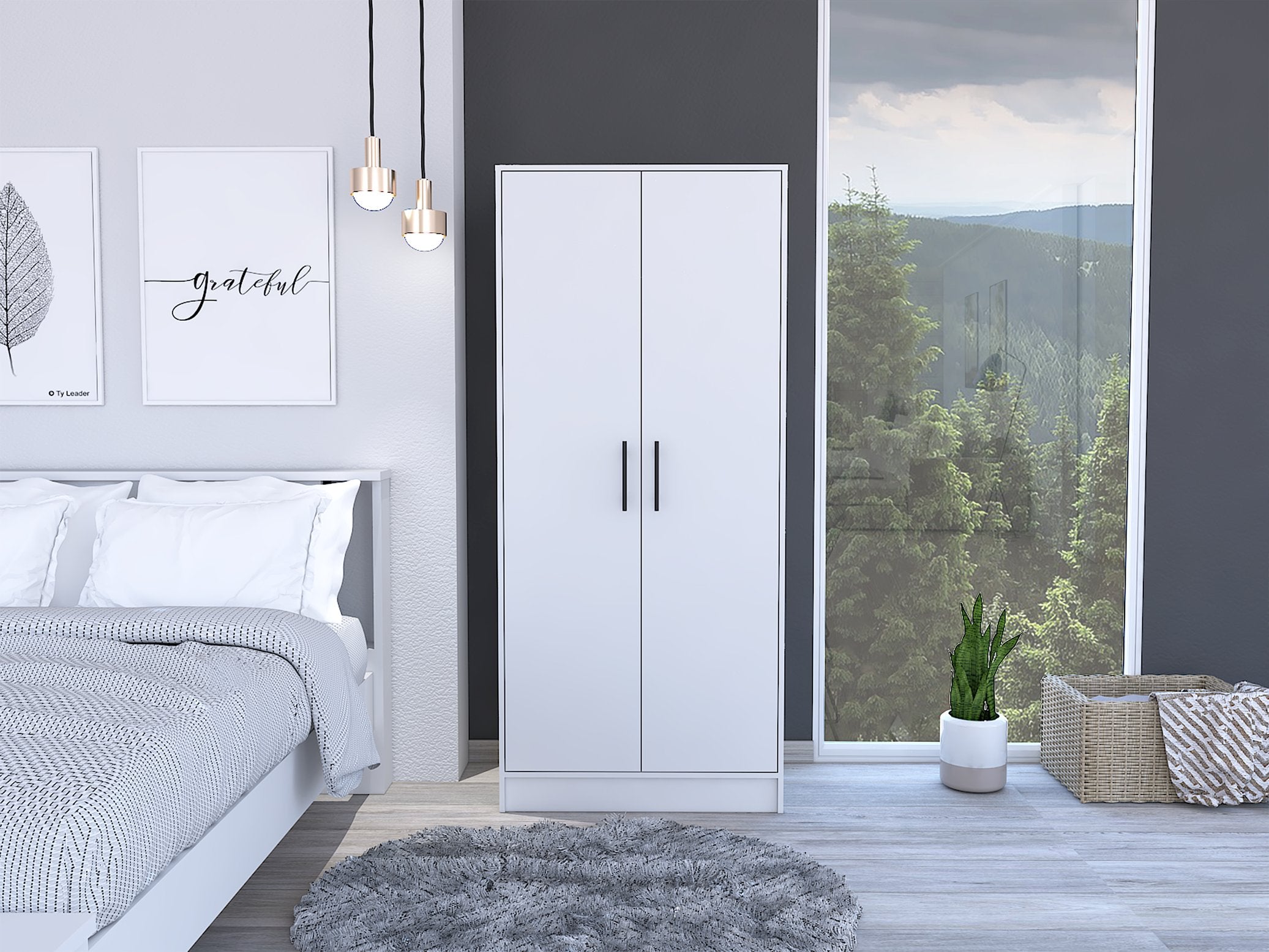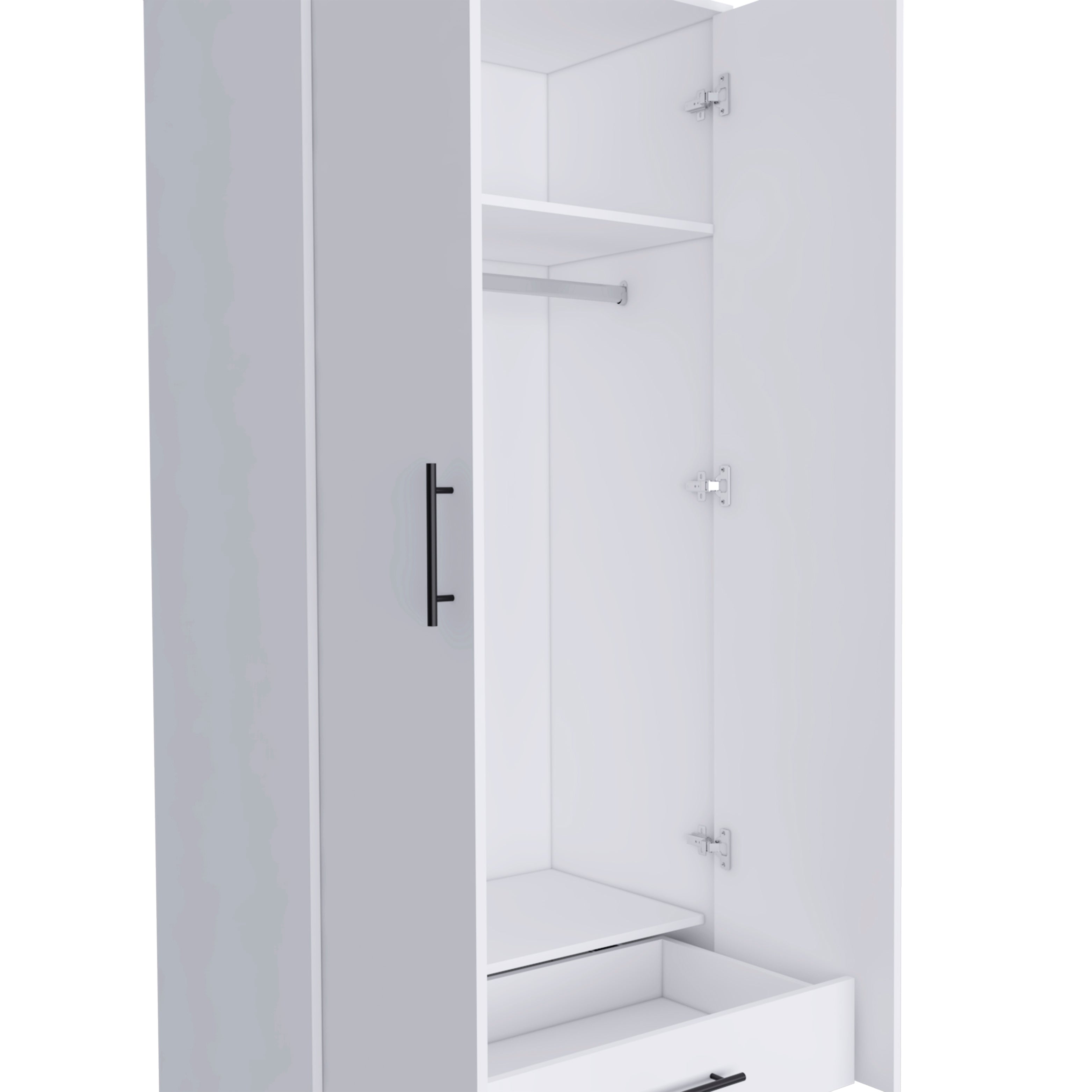 Bring order and style to your bedroom with this clean-lined white armoire, designed to maximize storage with a combination of shelving, hanging space, and a convenient drawer. Its neutral finish and simple profile fit a variety of décors while providing an efficient wardrobe solution for small spaces or as supplemental storage.
