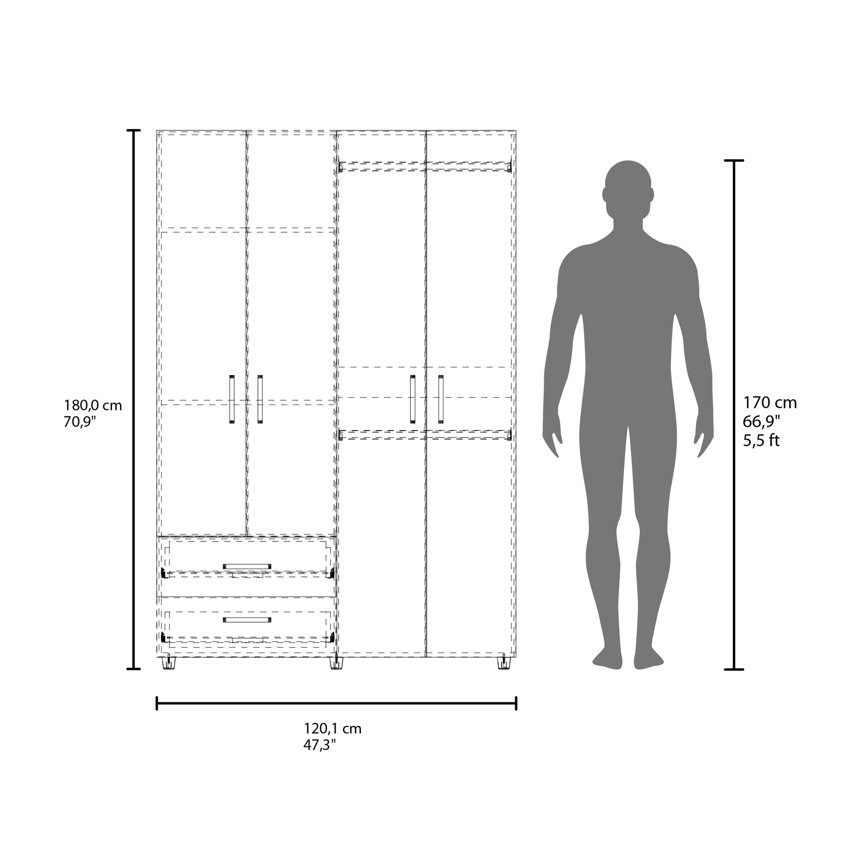 - Storage configuration: Four doors, two drawers, and two hanging rods provide a mix of concealed hanging and folded storage for versatile organization