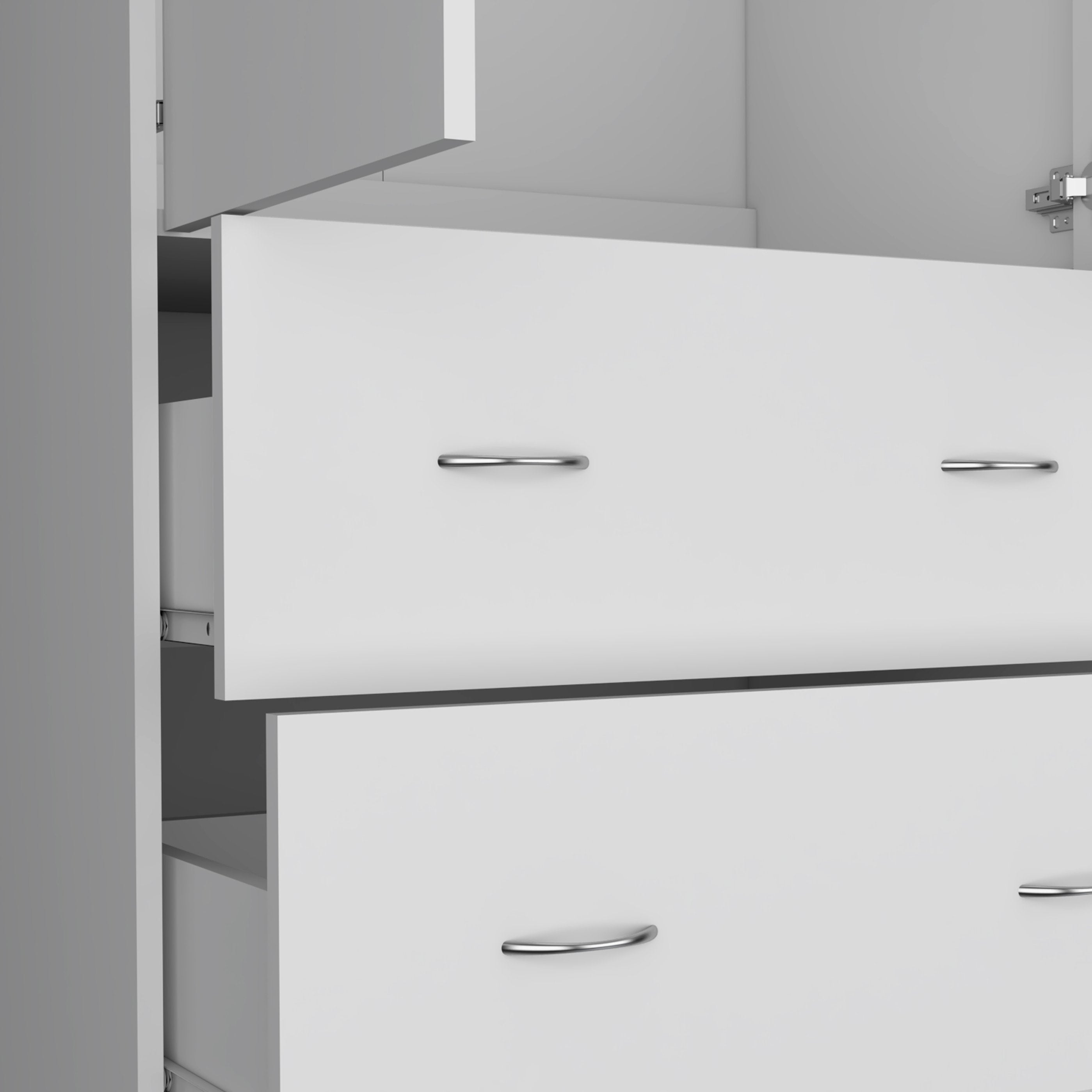 - Storage configuration: Two doors open to a hanging rod for garments plus two full-width drawers for folded items, accessories, or linens.