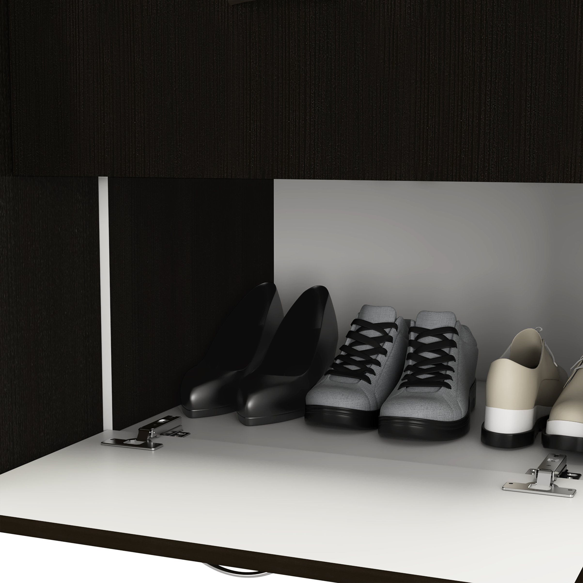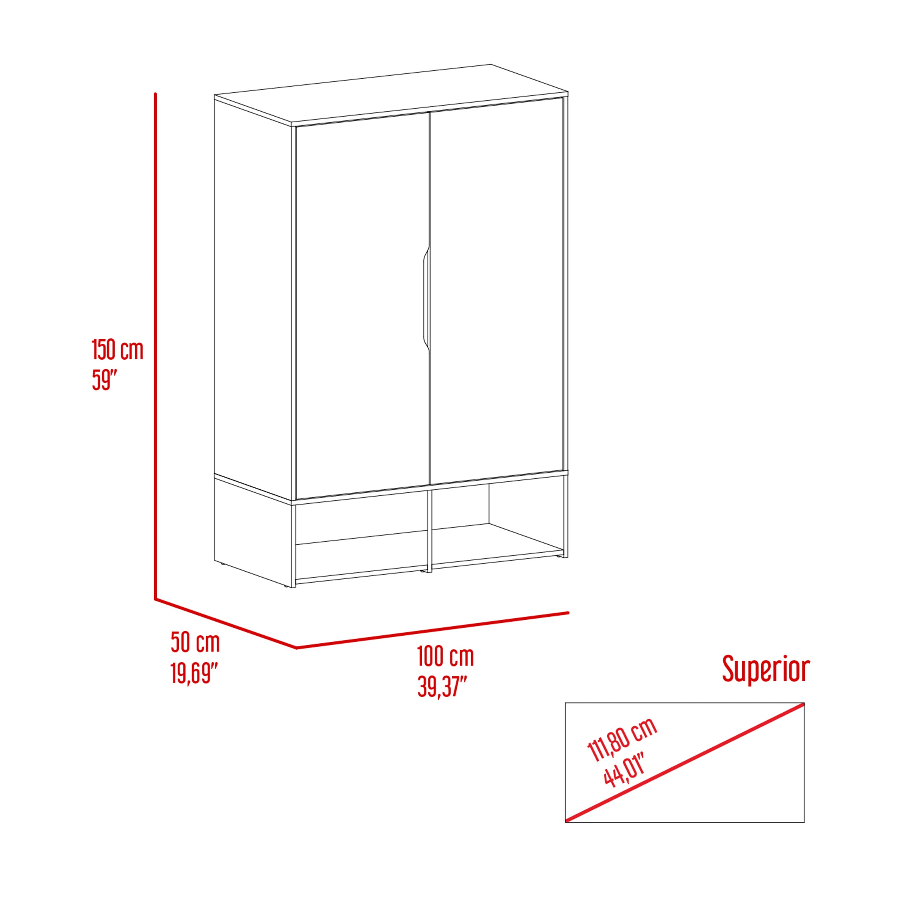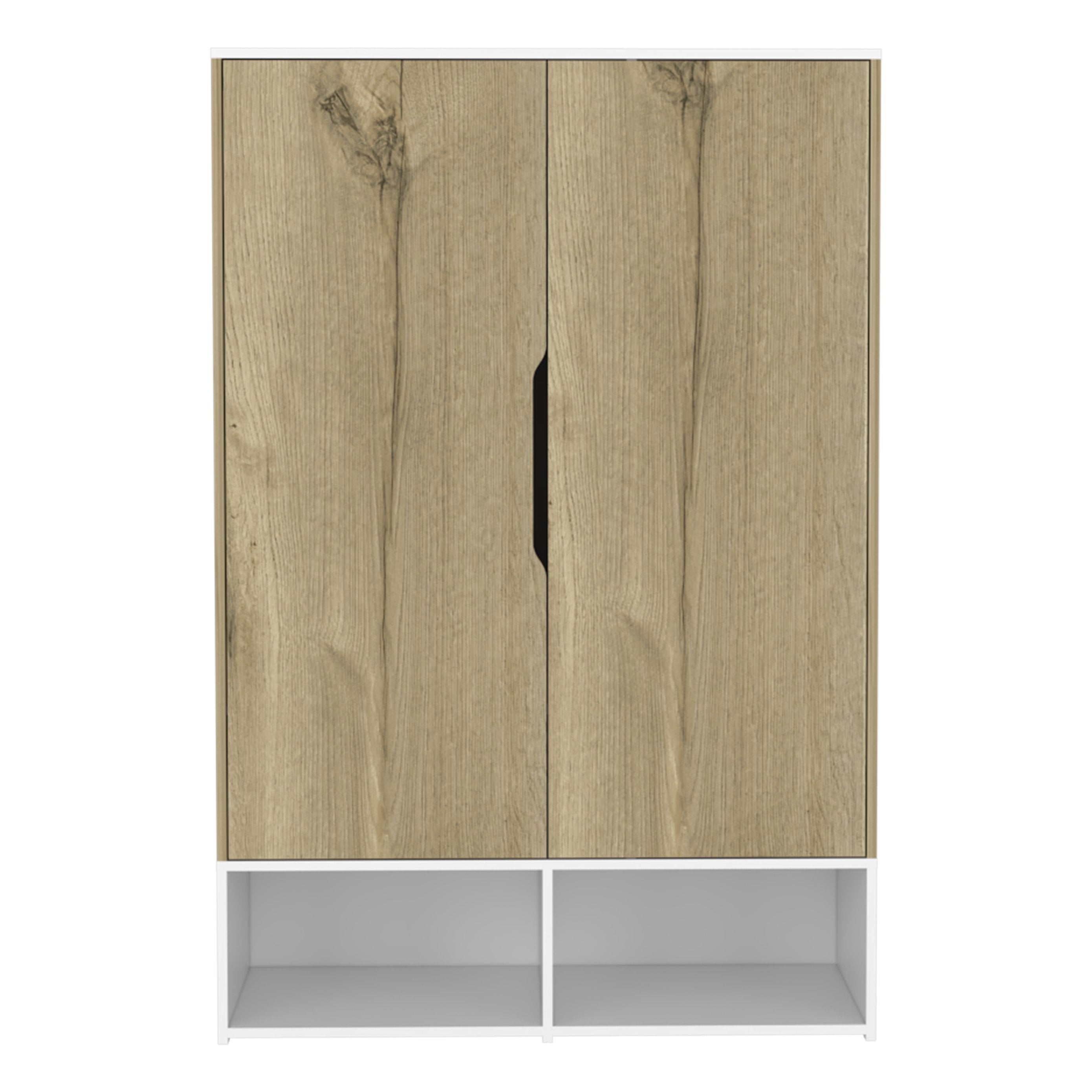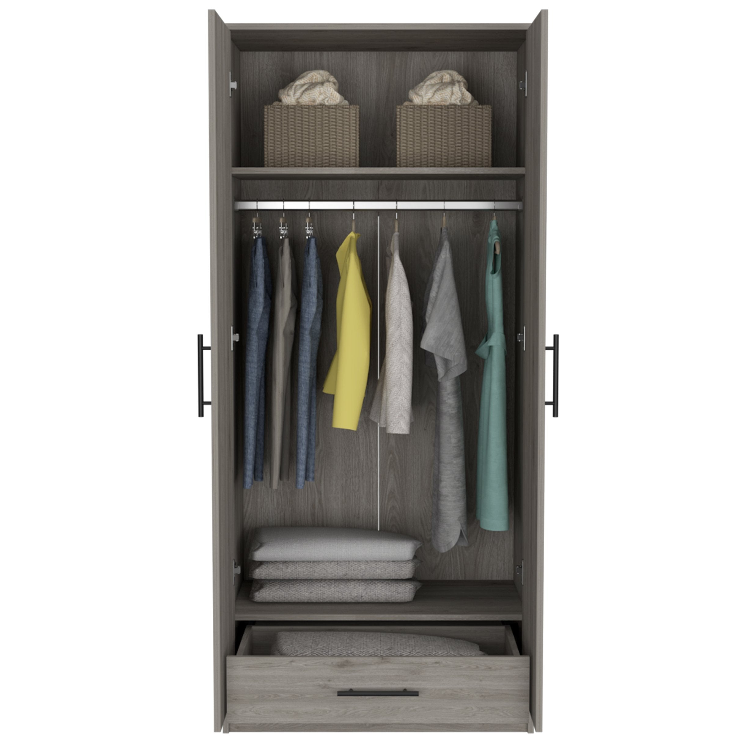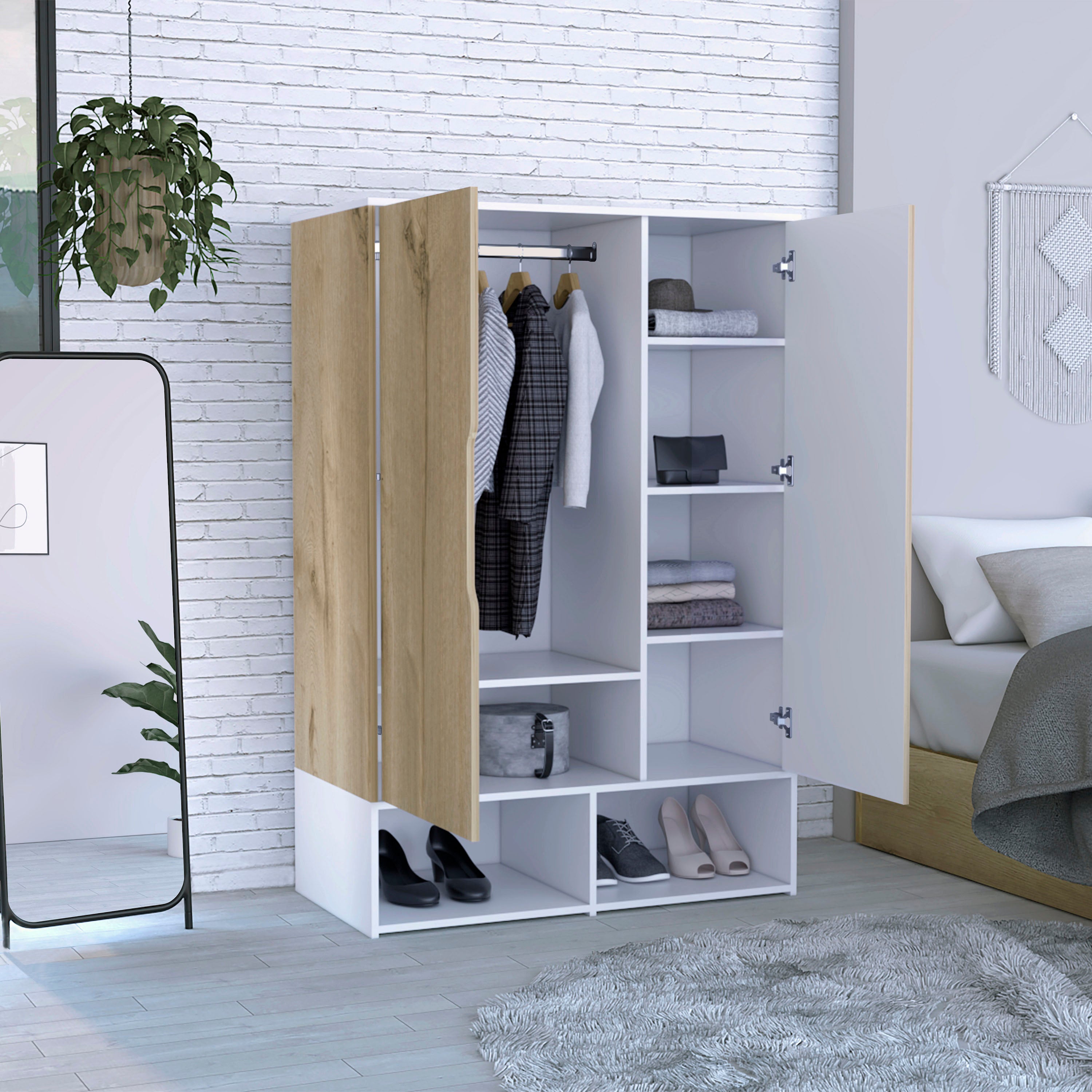 - Storage layout: Two full-width doors open to a hanging rod for shirts, jackets, and dresses, plus a low internal shelf suitable for shoe storage