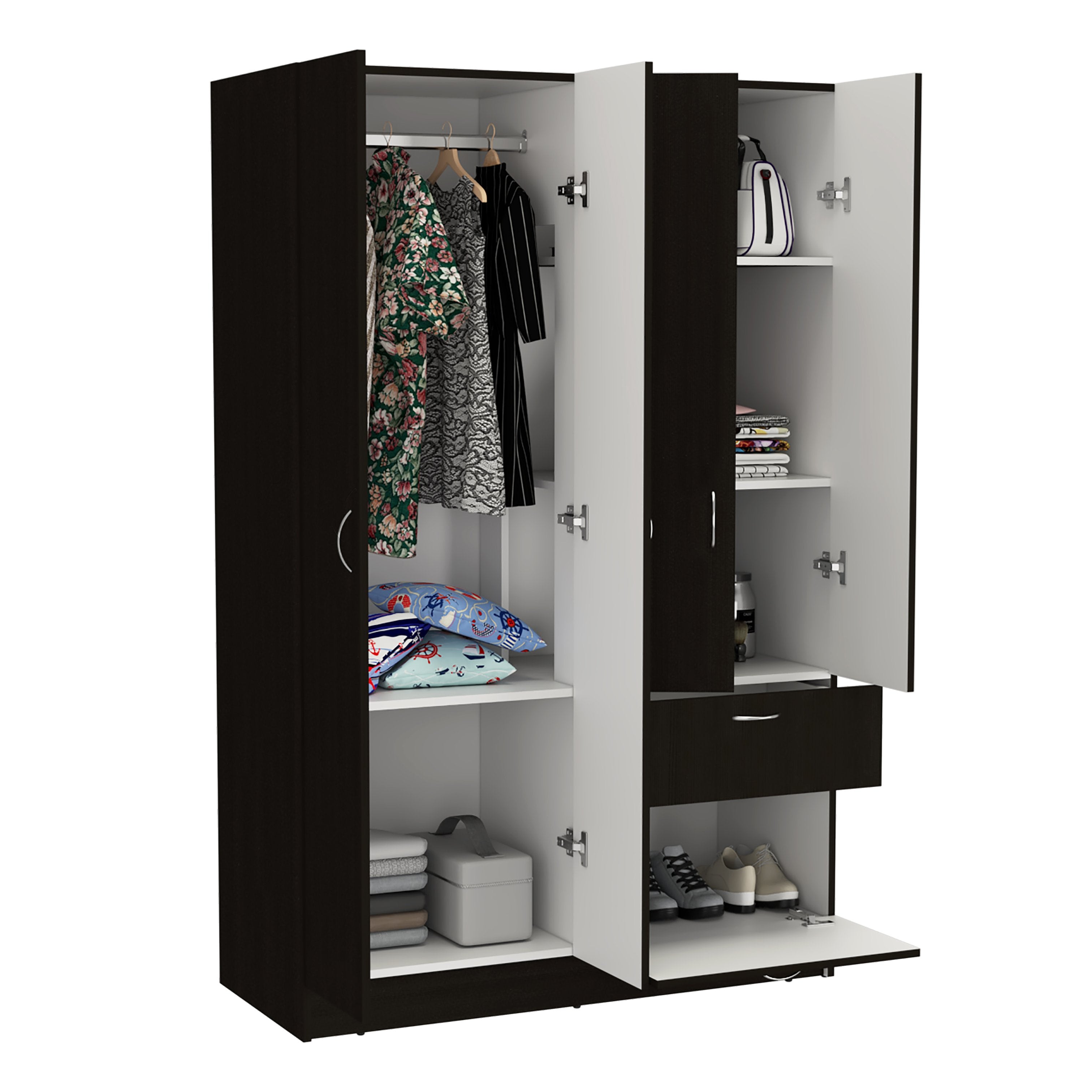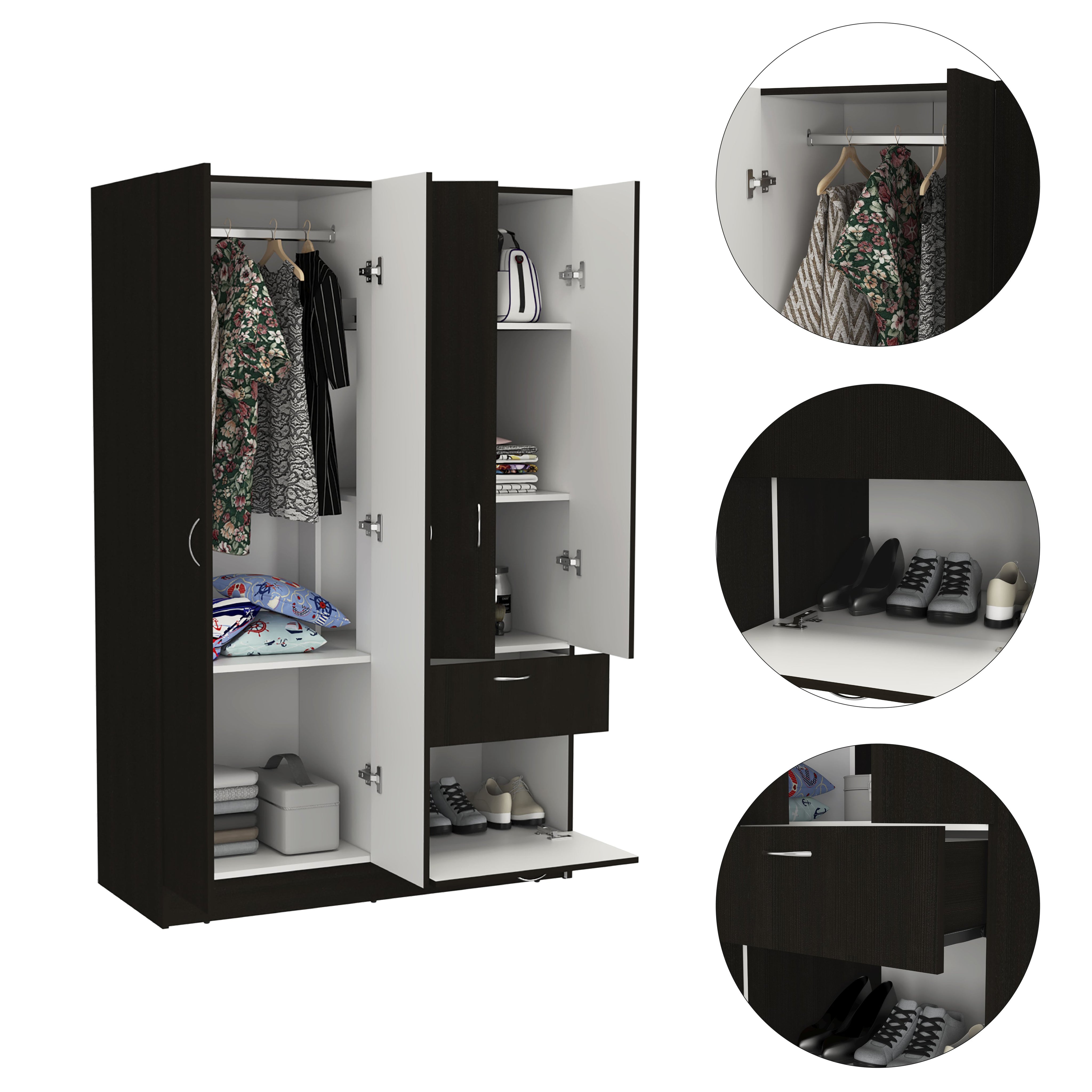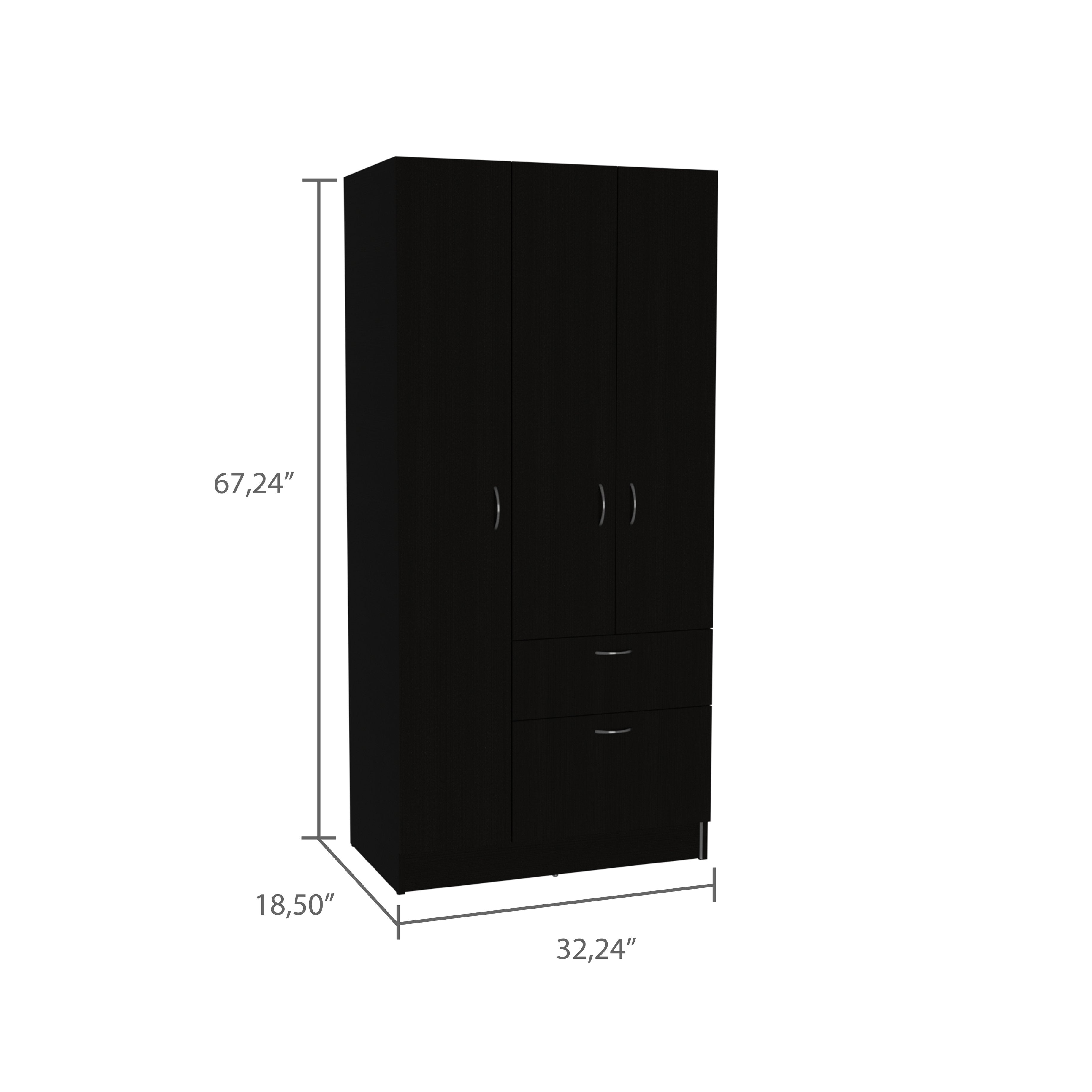 Organize your wardrobe with this sleek black armoire that combines storage, functionality, and a clean modern look. Ideal for bedrooms, guest rooms, or apartments, it keeps clothing, shoes, and accessories neatly tucked away while enhancing your space with a minimalist silhouette.