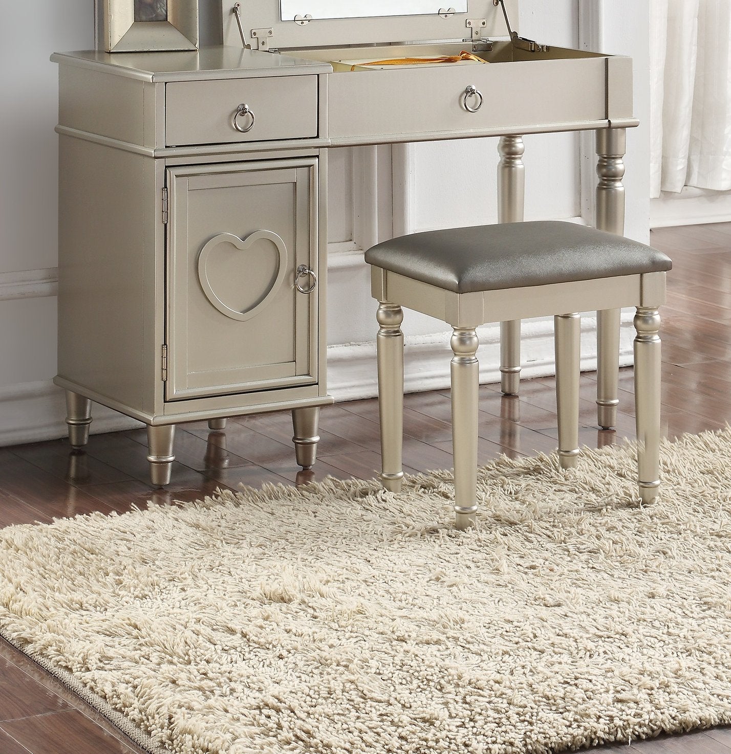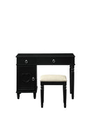 Give your child's room a charming and functional makeover with this black bedroom vanity set. The flip-up glass mirror reveals hidden storage for cosmetics and accessories, while the included padded stool offers a comfortable place to sit. Decorative heart accents on the side drawer and lower door panel add a playful touch, and rubberwood construction with ring-pull handles ensures durable everyday use.