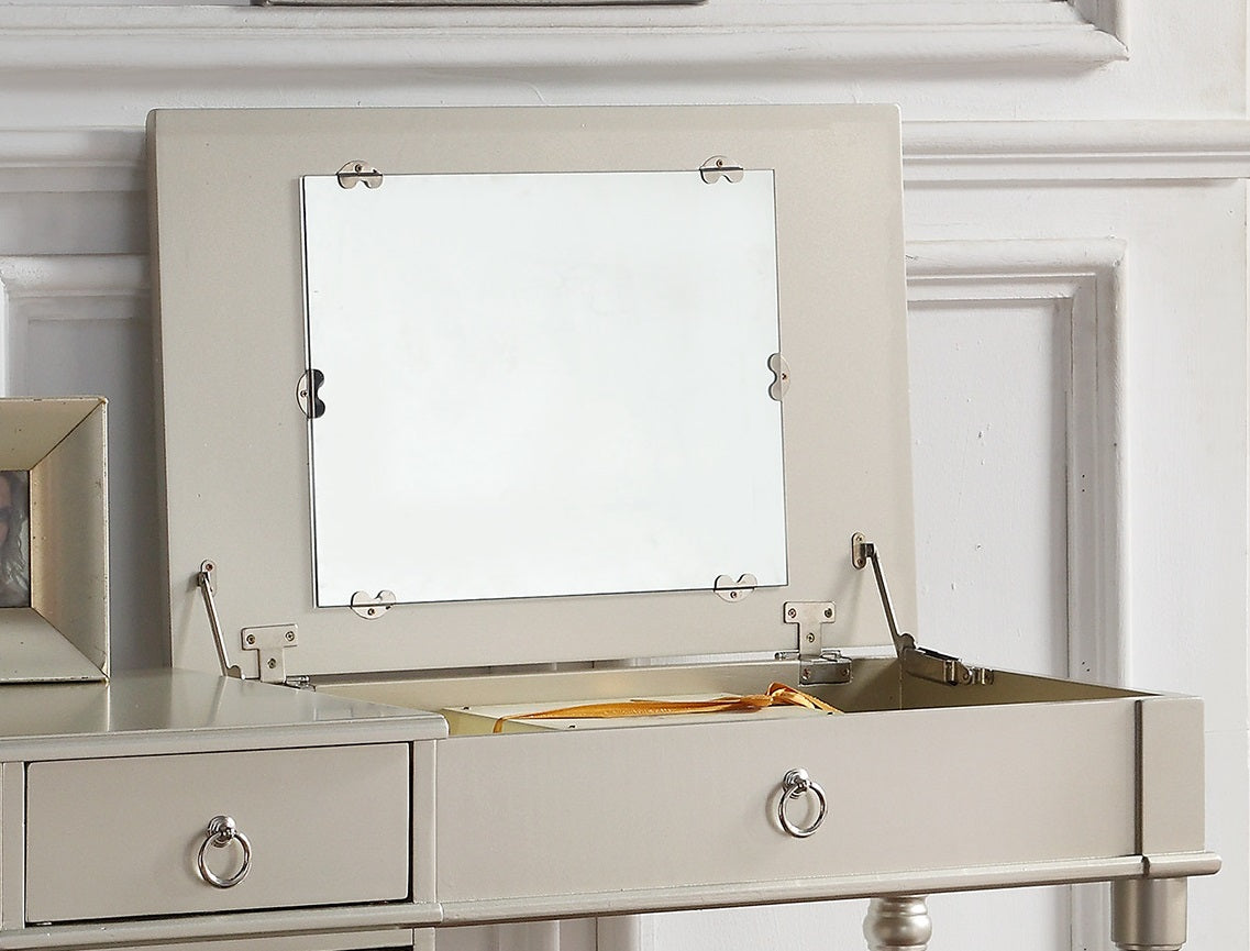 - Flip-top glass mirror with interior storage compartment for tidy organization of makeup and accessories.