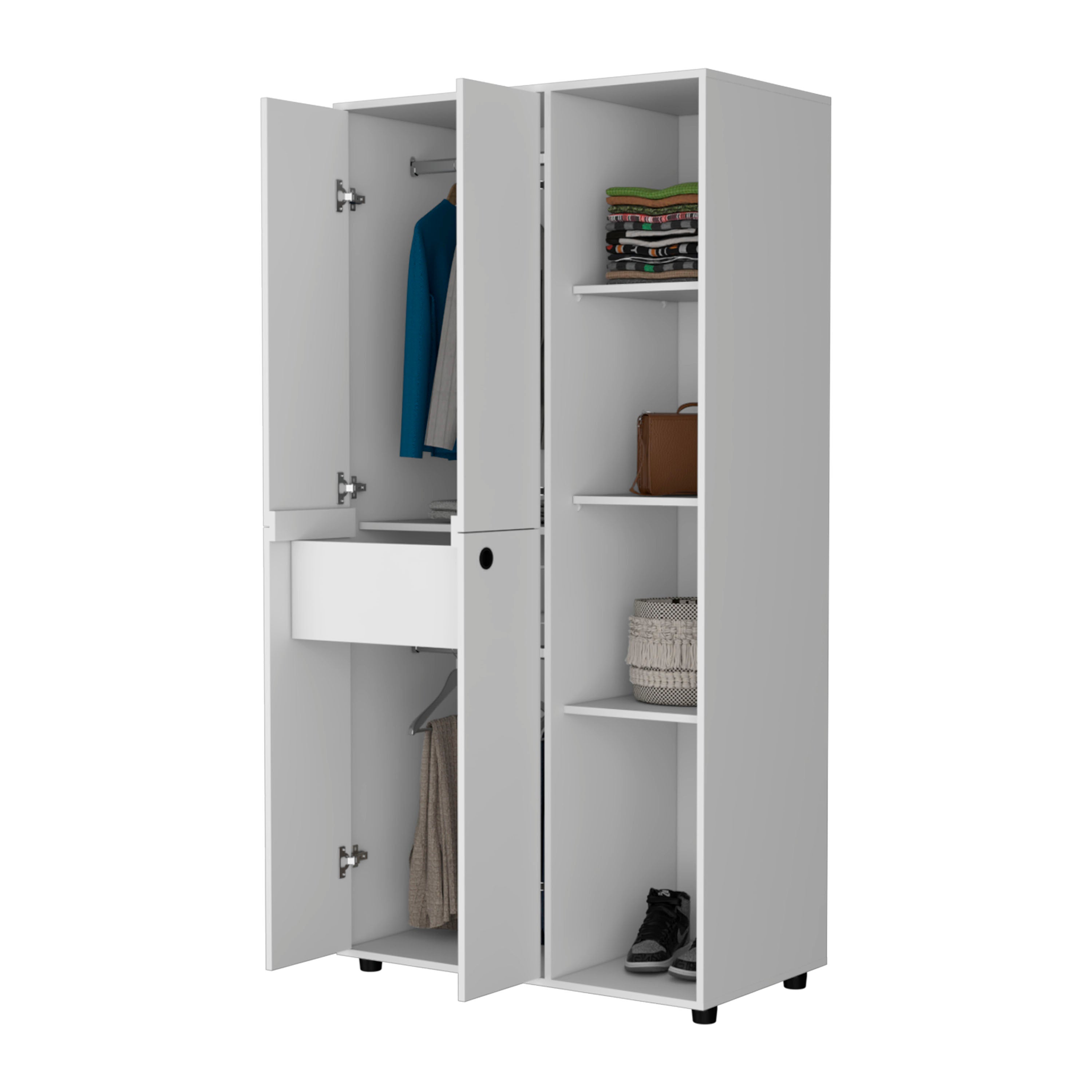Organize your bedroom or entryway with the Bethel armoire — a clean, contemporary storage solution that blends wardrobe functionality with compact design. Finished in white particle board, it offers a tidy, versatile setup for hanging clothes, stashing folded items, and displaying everyday essentials while keeping clutter out of sight.