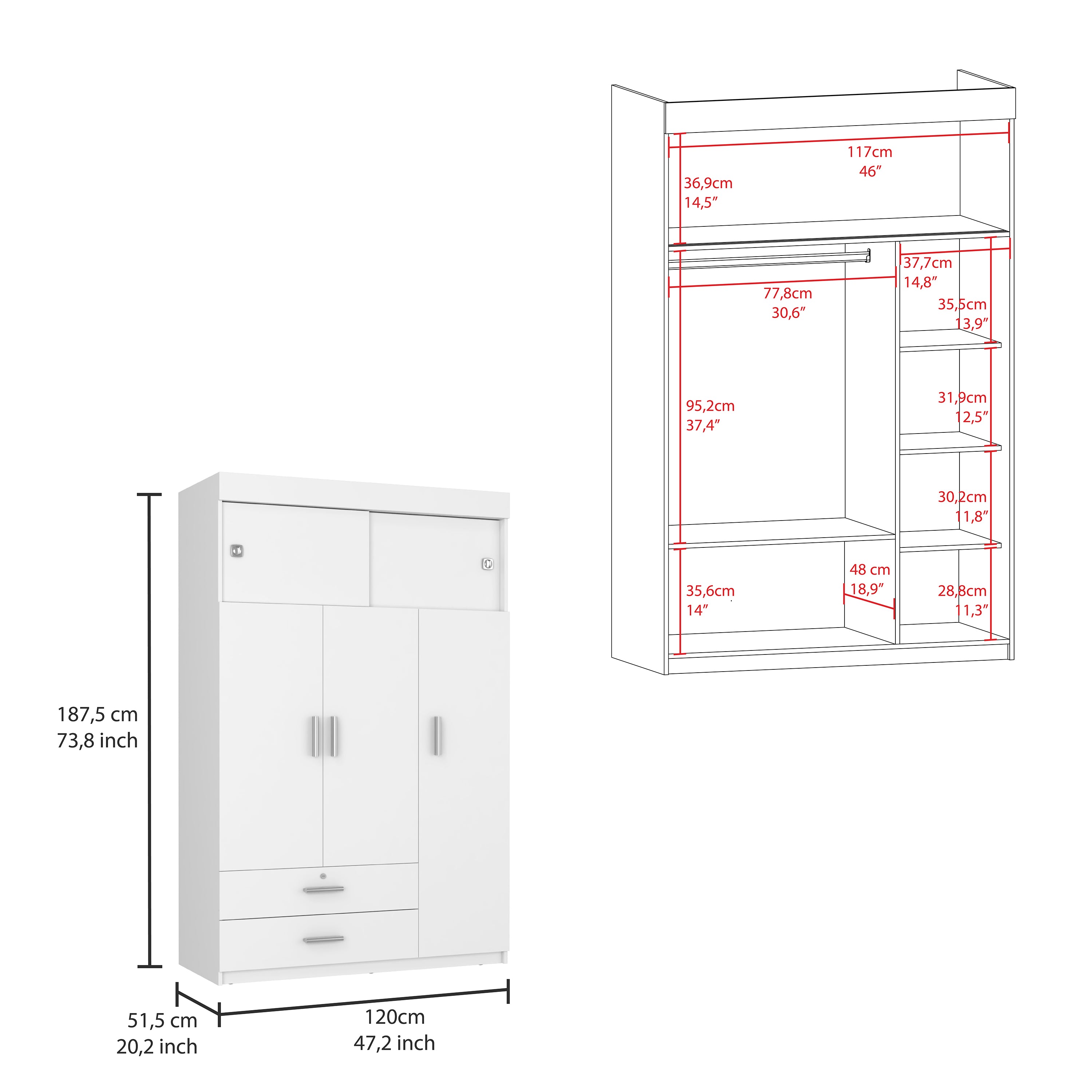 - Storage configuration: Three-door cabinet with one double-door section featuring a hanging rod plus two spacious bottom drawers