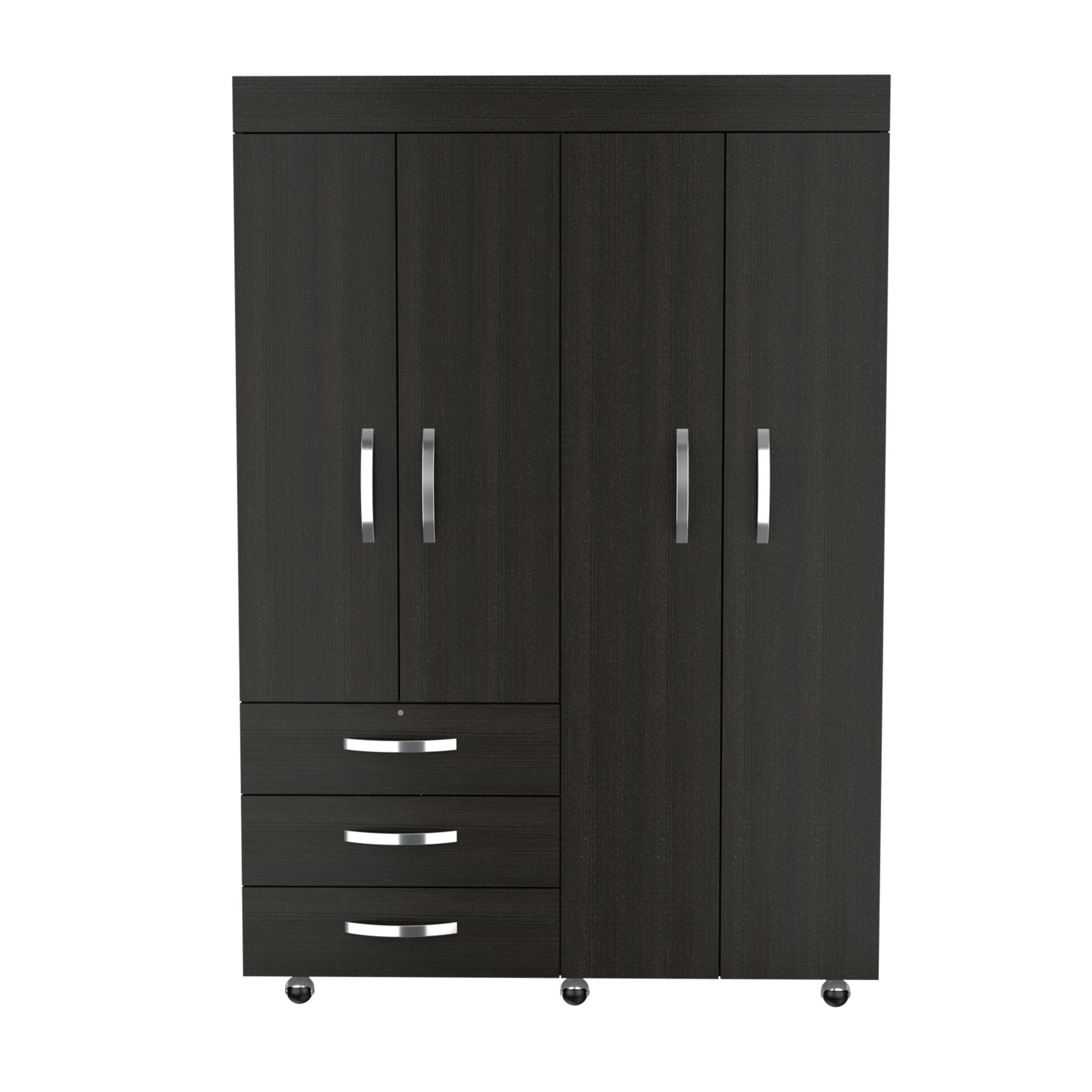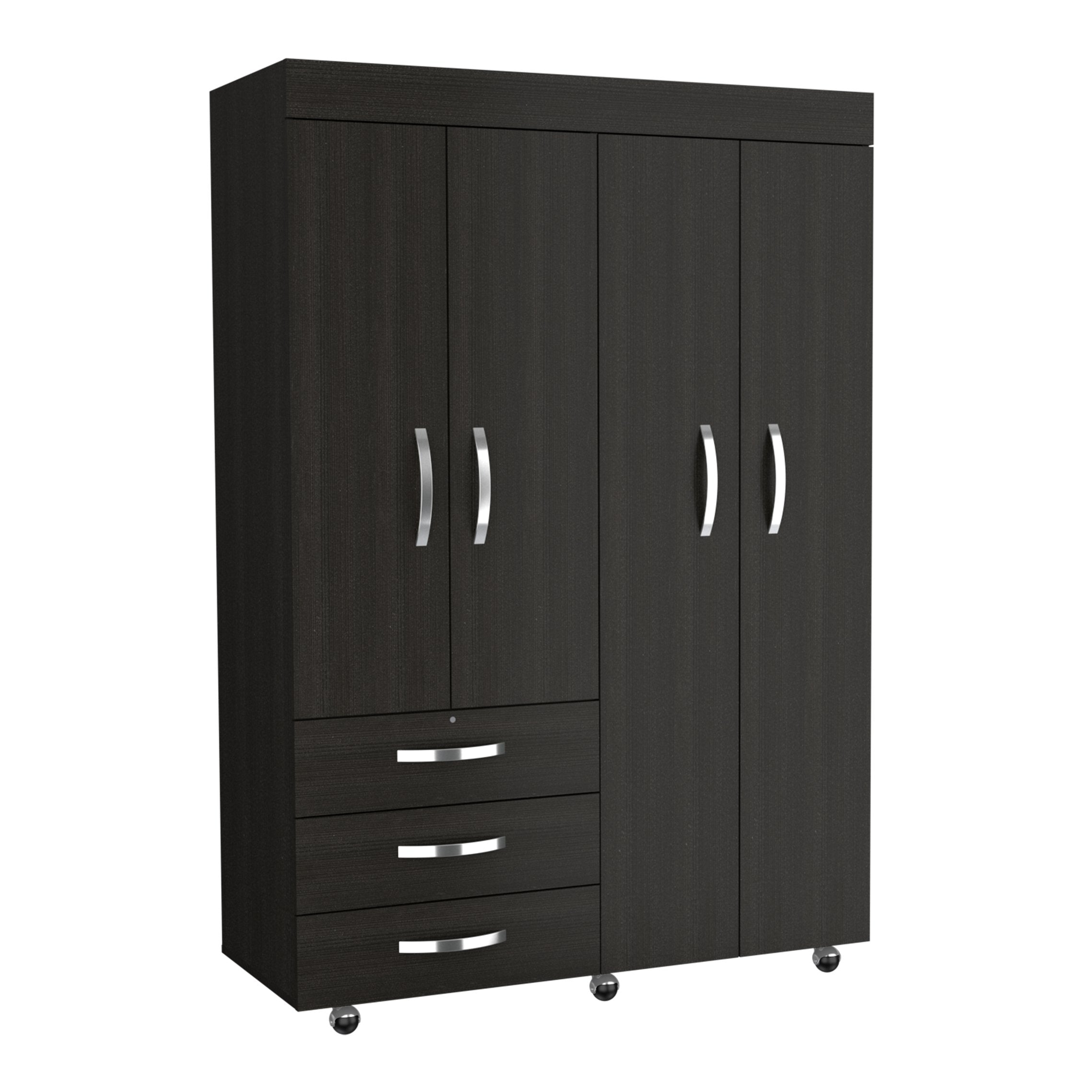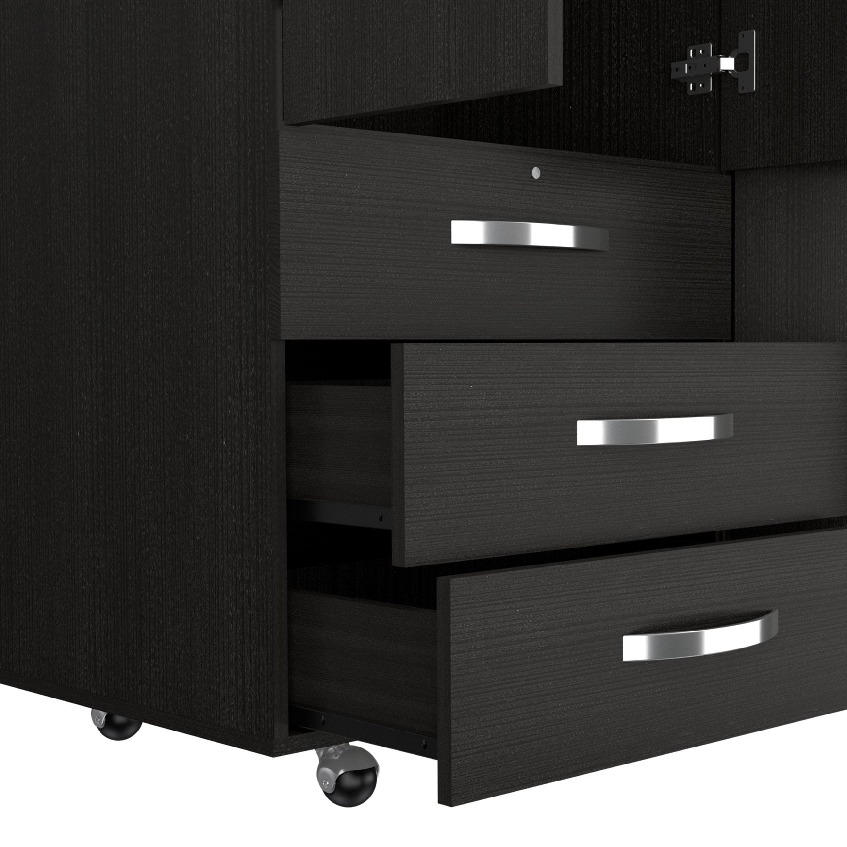 Bring order and style to your bedroom or dressing area with this versatile mobile armoire. Finished in sleek black, it combines generous hanging space, shelving, and drawers to store clothing, linens, and accessories while complementing modern and contemporary decor.