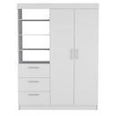 Organize your bedroom with the Kenya 3-Drawer Armoire — a clean, modern storage solution that combines hanging space, open shelving, and roomy drawers in a compact white finish. Built from durable particle board with sturdy metal handles, this wardrobe-style armoire keeps garments, accessories, and everyday essentials neatly arranged while complementing contemporary interiors.
