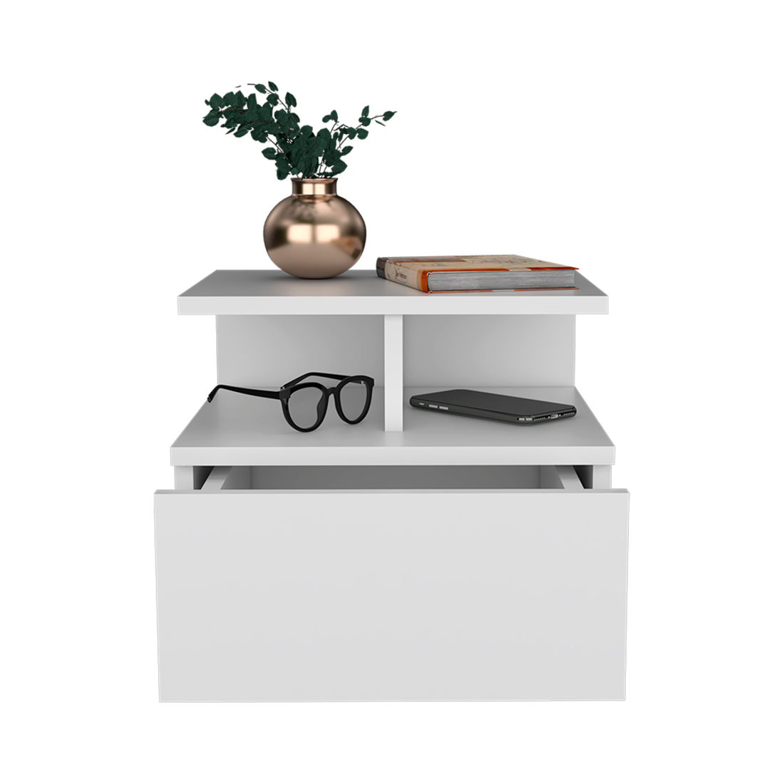 - Modern and unique in design, this floating shelf nightstand requires wall mounting and does not touch the ground.