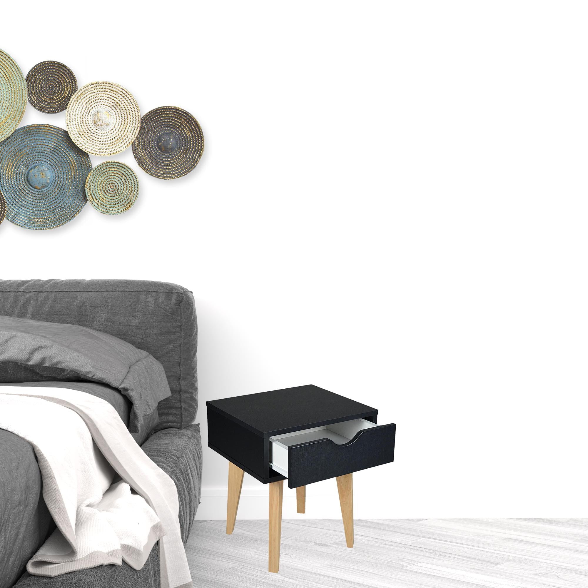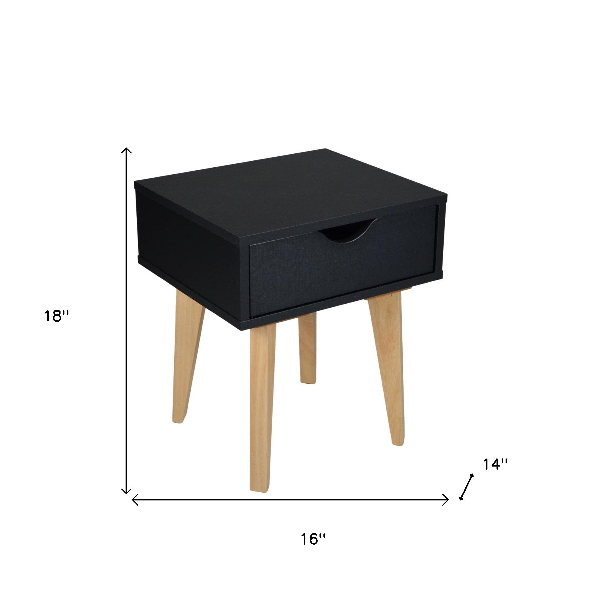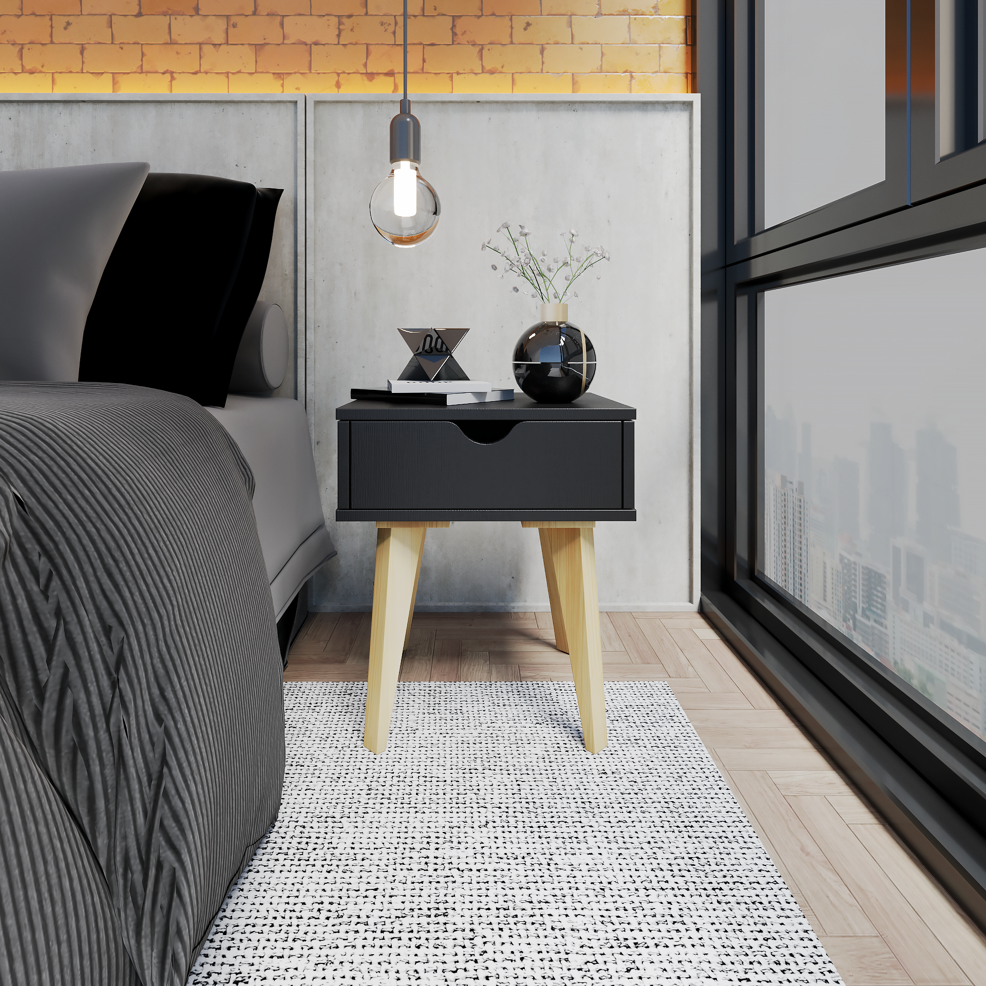 - Minimalist style nightstand in black that is offset nicely with natural color legs.