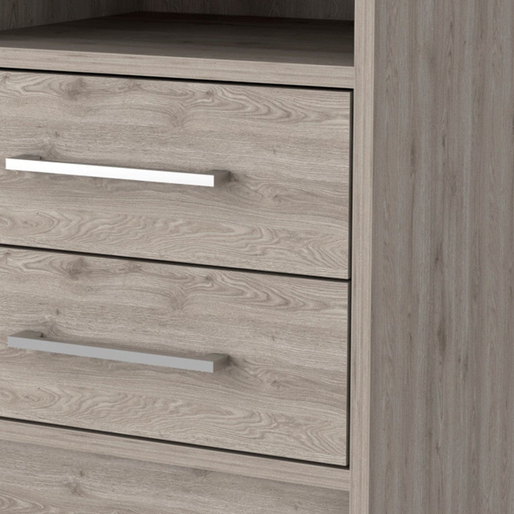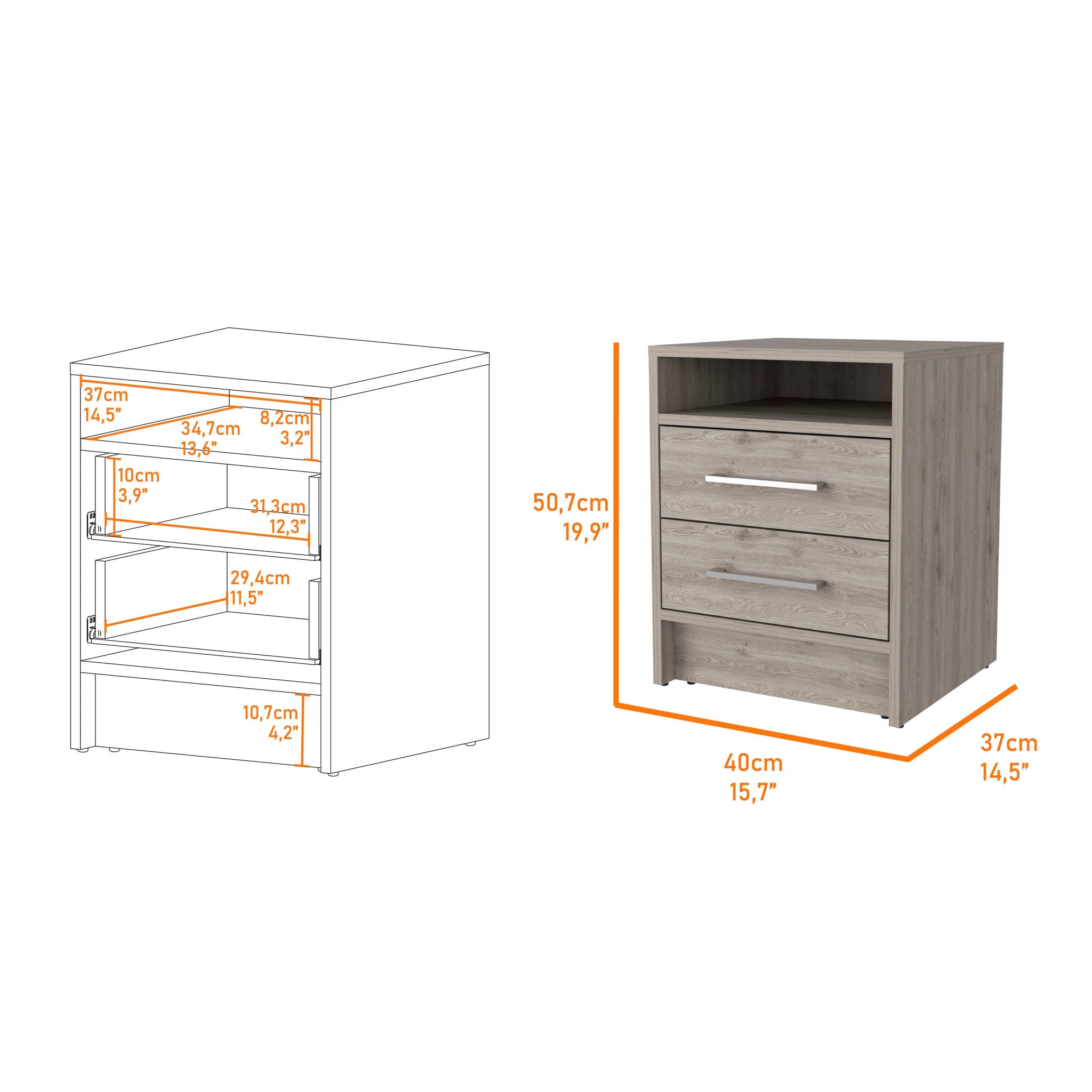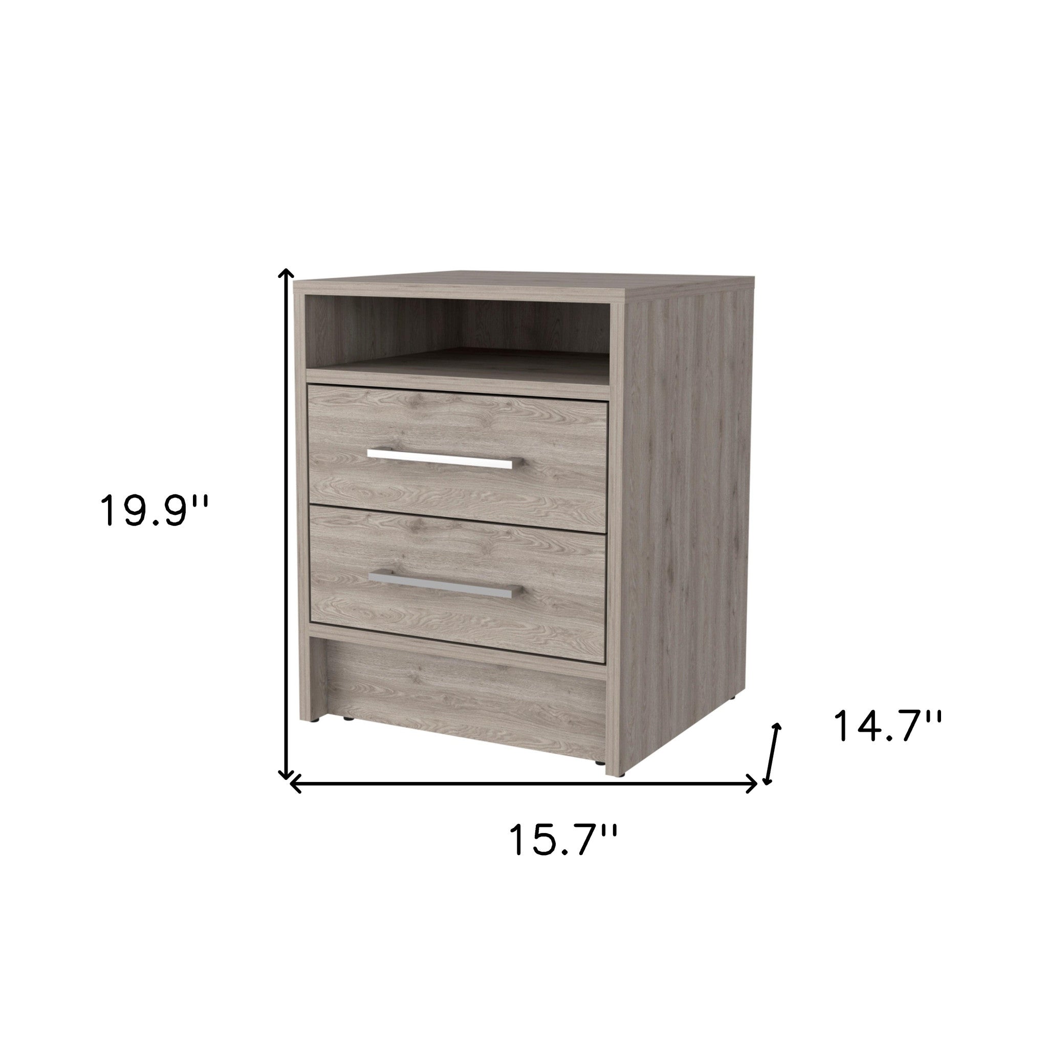 - Modern style nightstand with light gray frame and top crafted from manufactured wood and accented with metal handles.