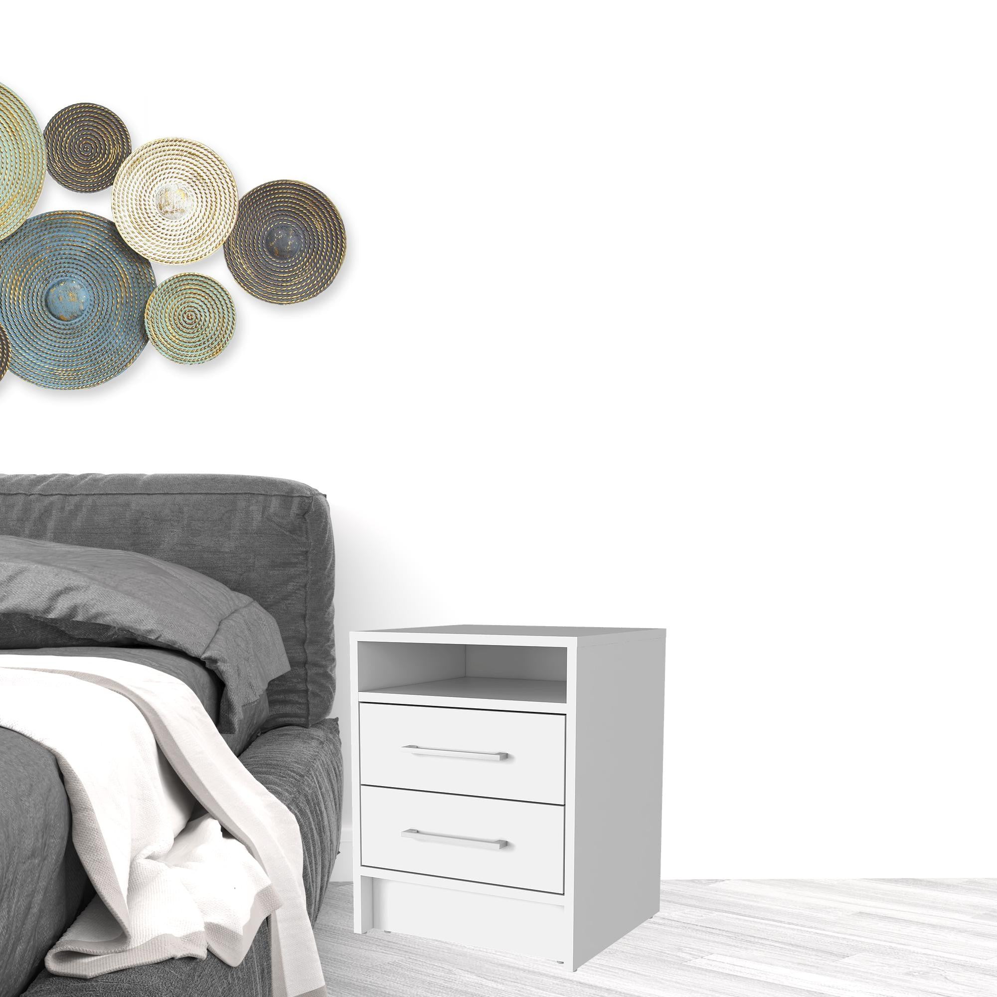 - Modern white rectangular nightstand made of manufactured wood with a metal handle/accent for a sleek and contemporary look.