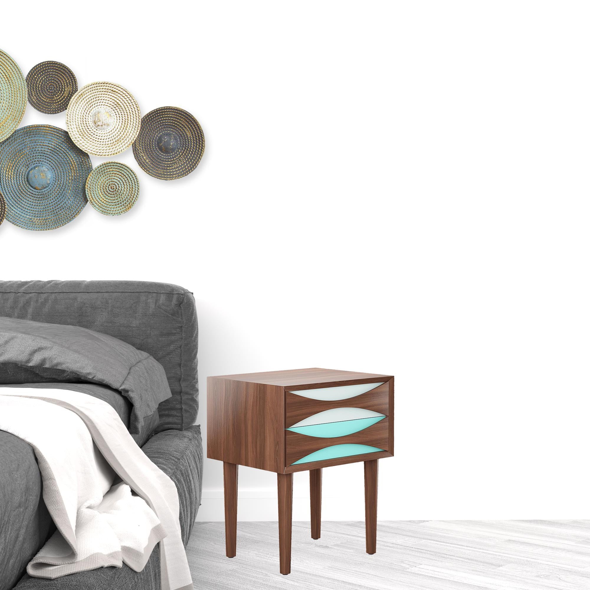 - Retro inspired two-tone walnut and aqua nightstand.