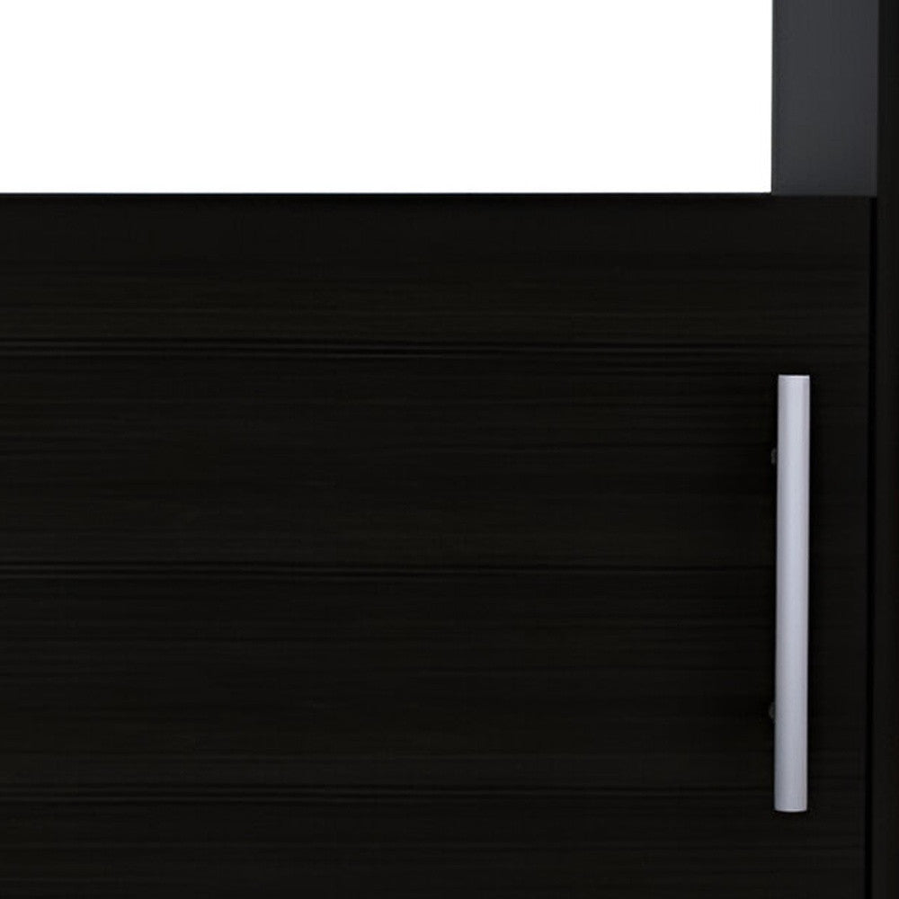 - Includes open shelving for display and storage.