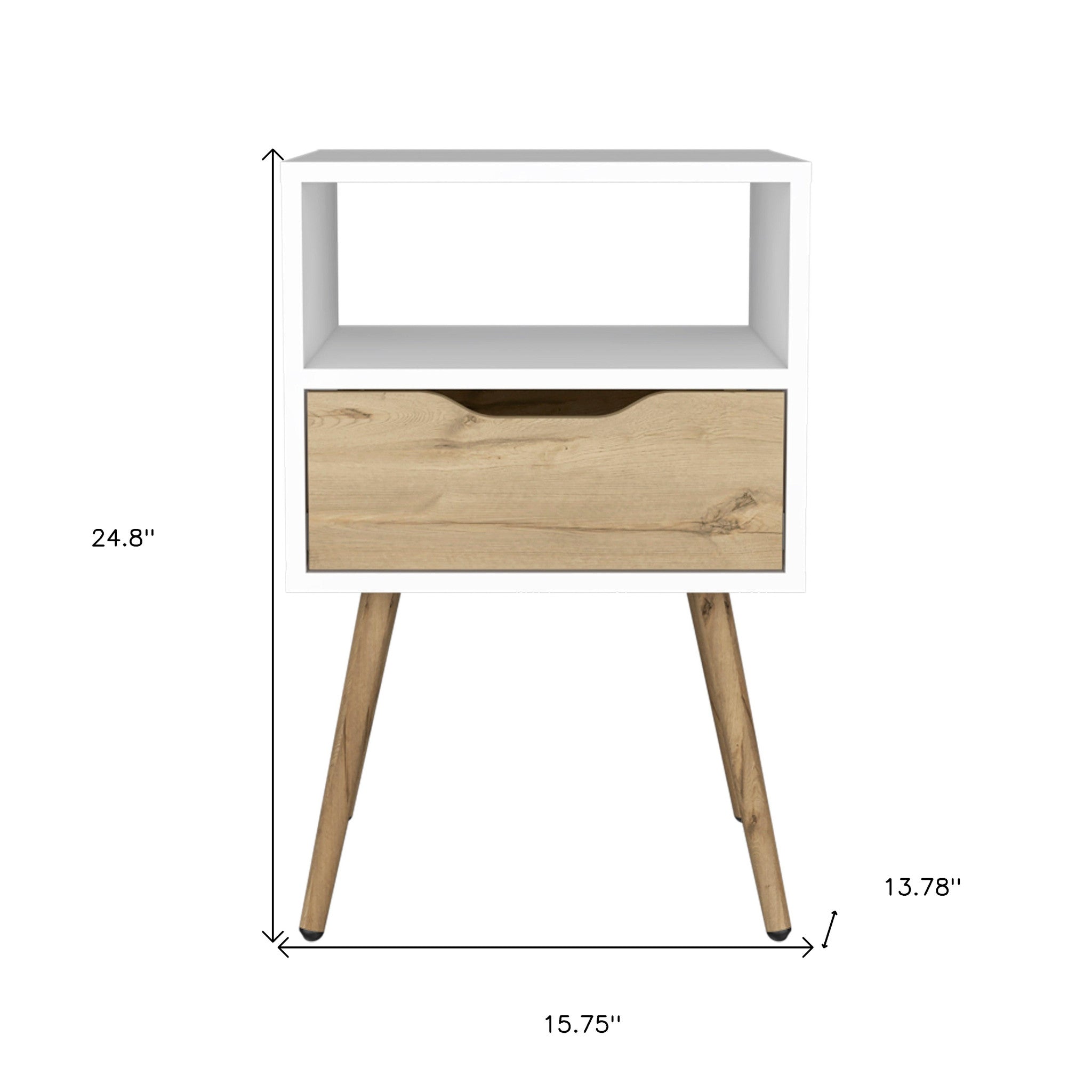- Modern style nightstand with a white top and natural wood frame and legs.