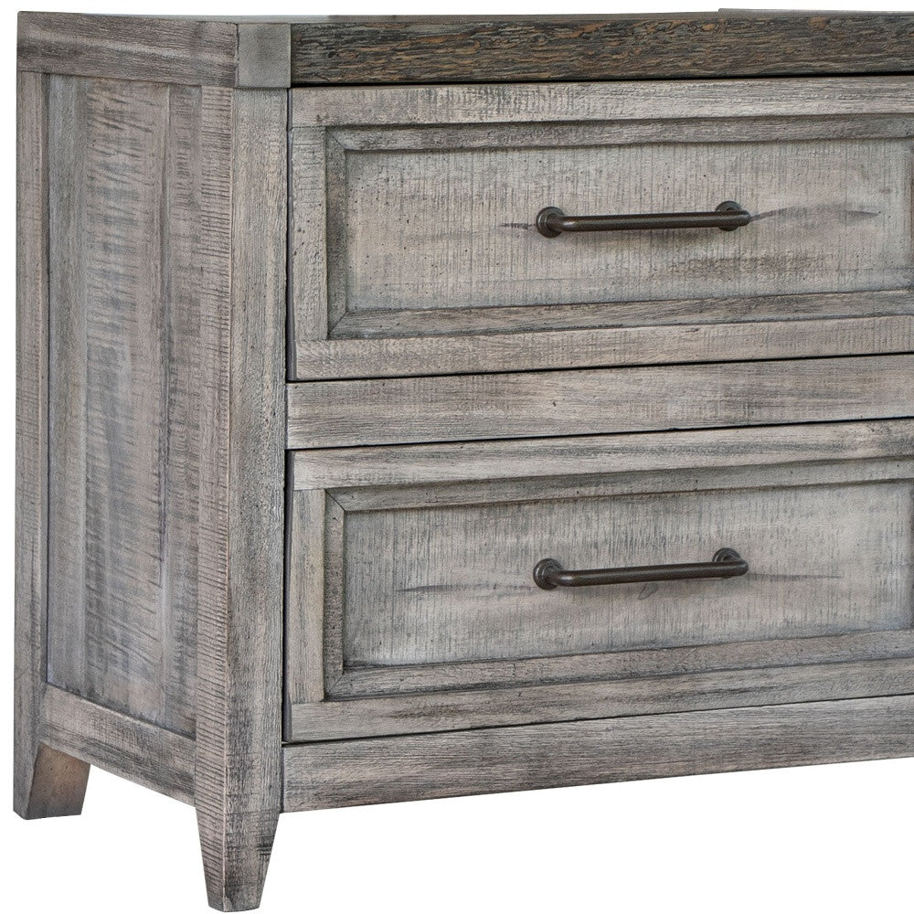 - Solid wood two drawer dresser or accent cabinet in a rustic and purposefully distressed gray brown finish with black accents.
