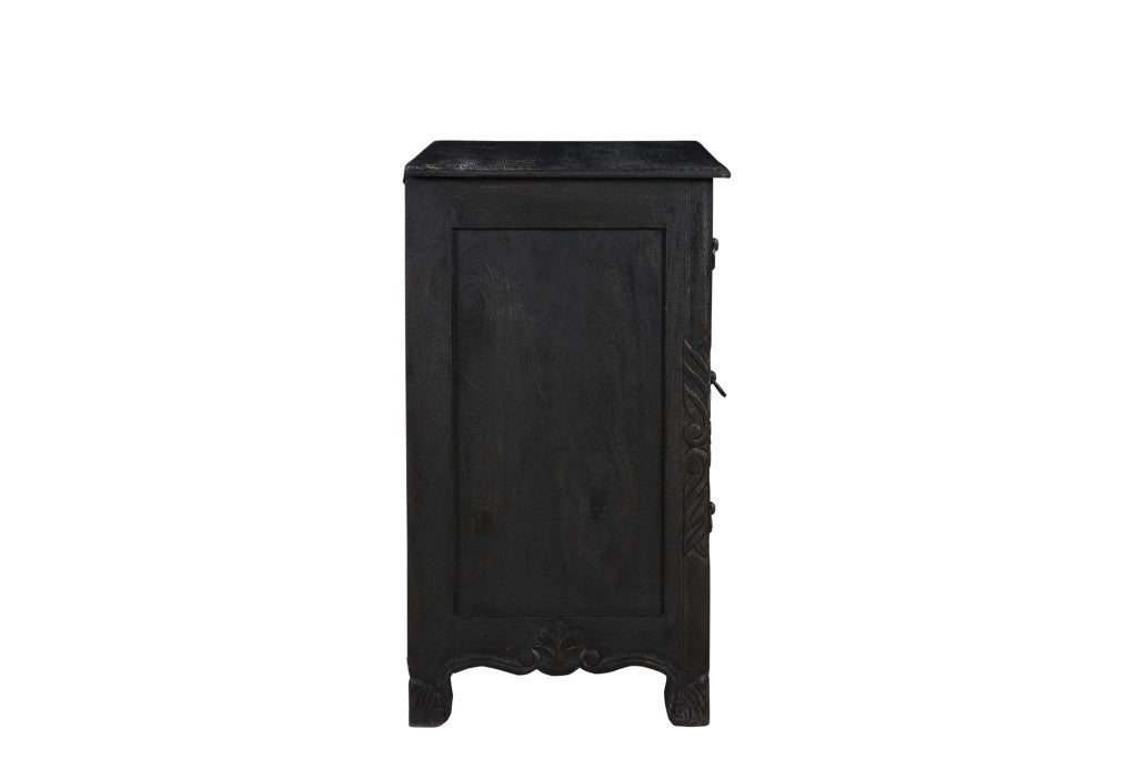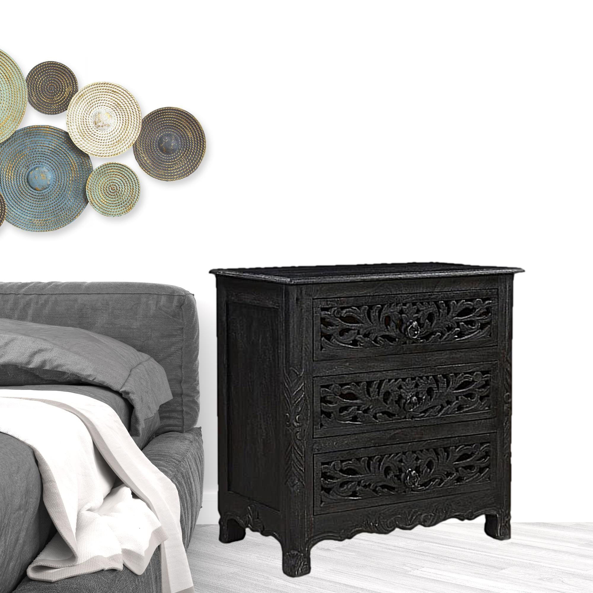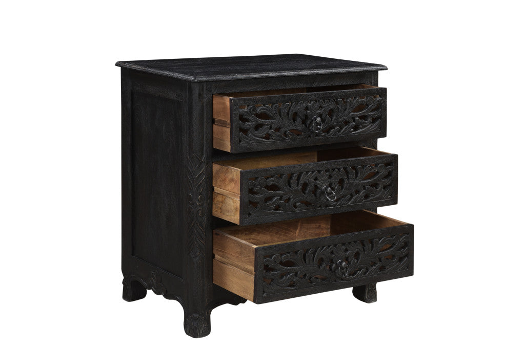 - Rustic-style nightstand made from solid wood that features intricate and beautiful carved scrolling and detail work.
