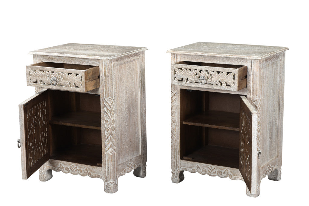 - Rustic-style nightstand made from solid wood that features intricate and beautiful carved floral detailing.