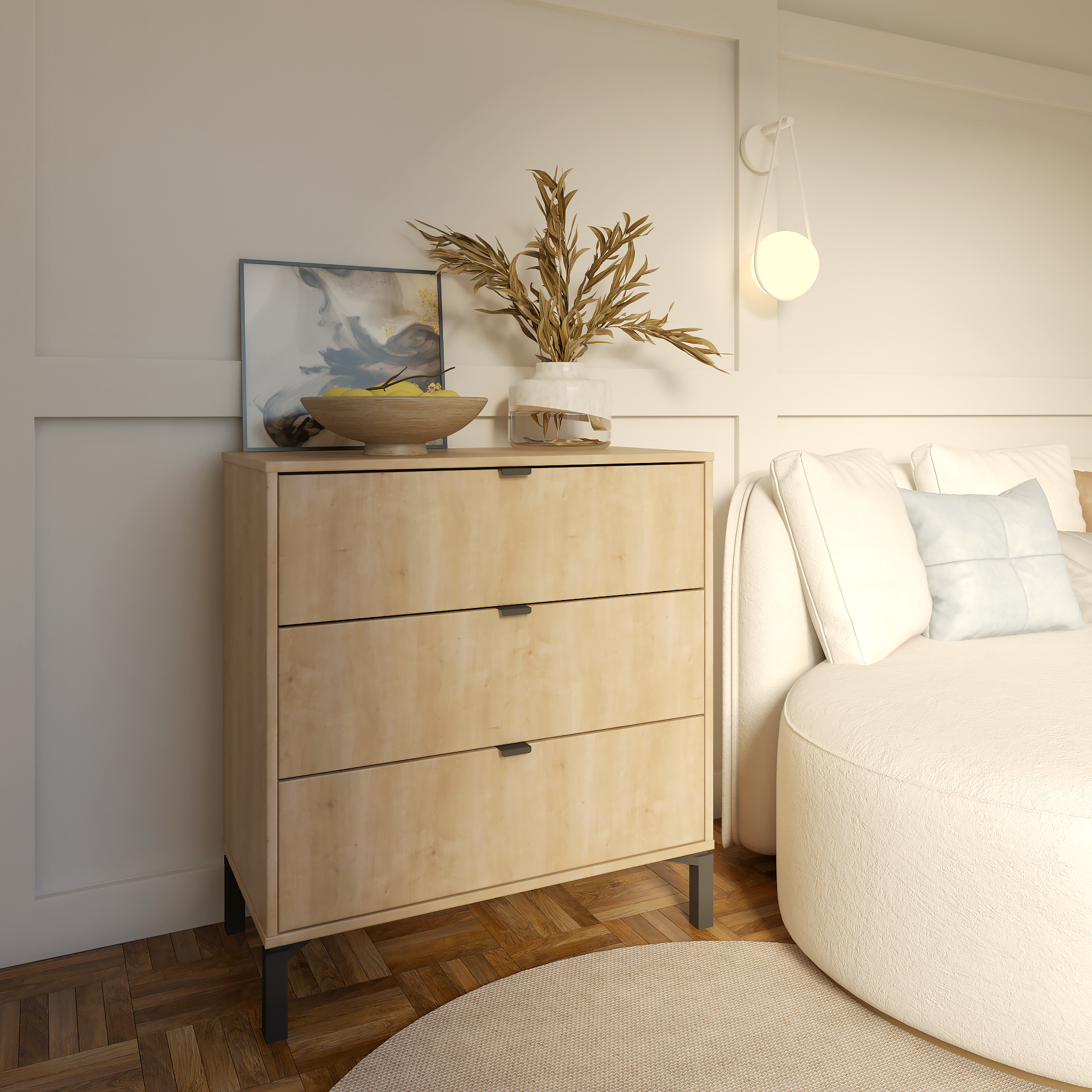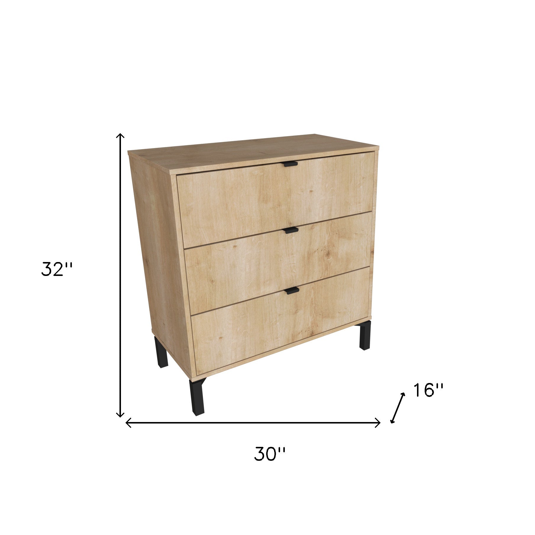 - Horizontal standard dresser with metal handles.