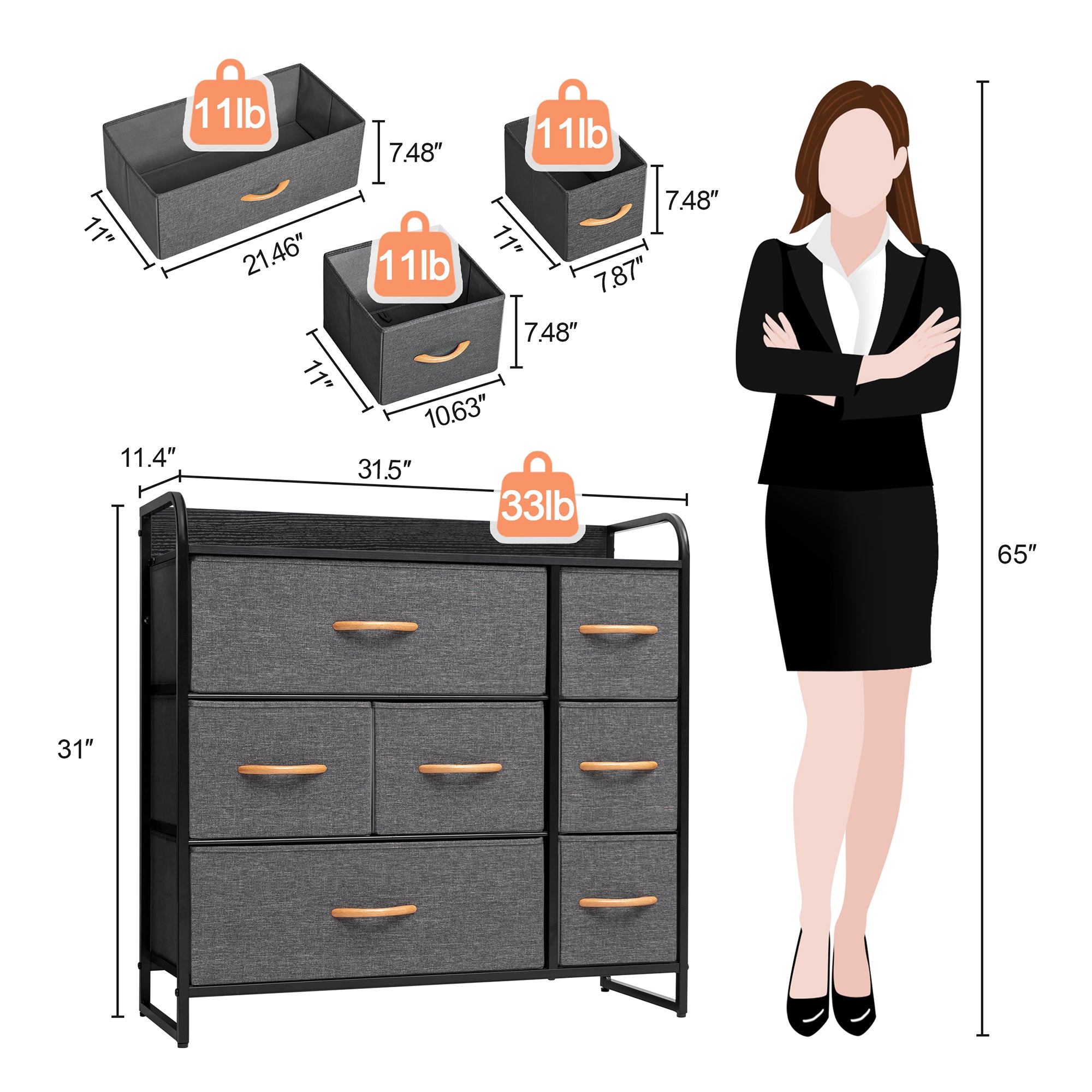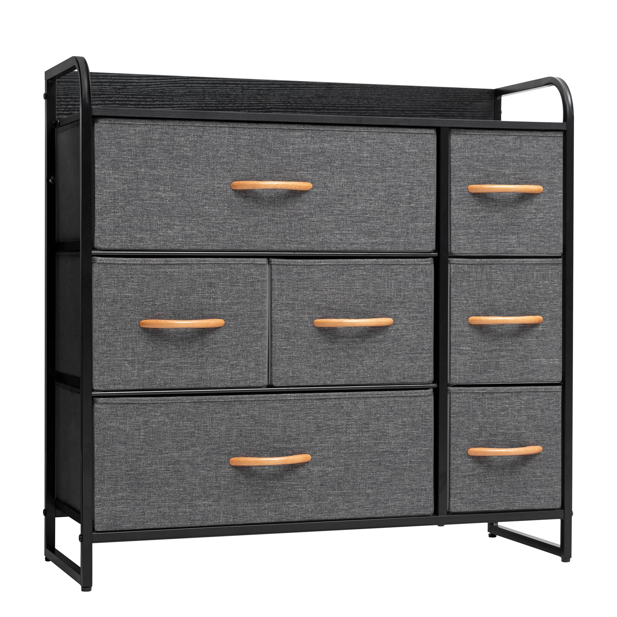 - Material Breakdown: Sturdy Steel Frame, Wood Top, Easy Pull Fabric Bins, Wood Handles