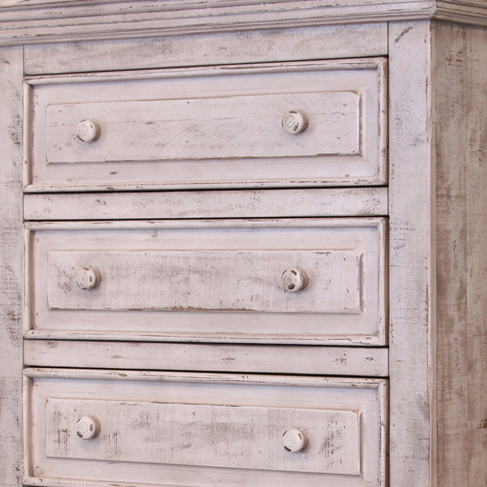 - Multi-step lacquer finish with a bright white distressed finish