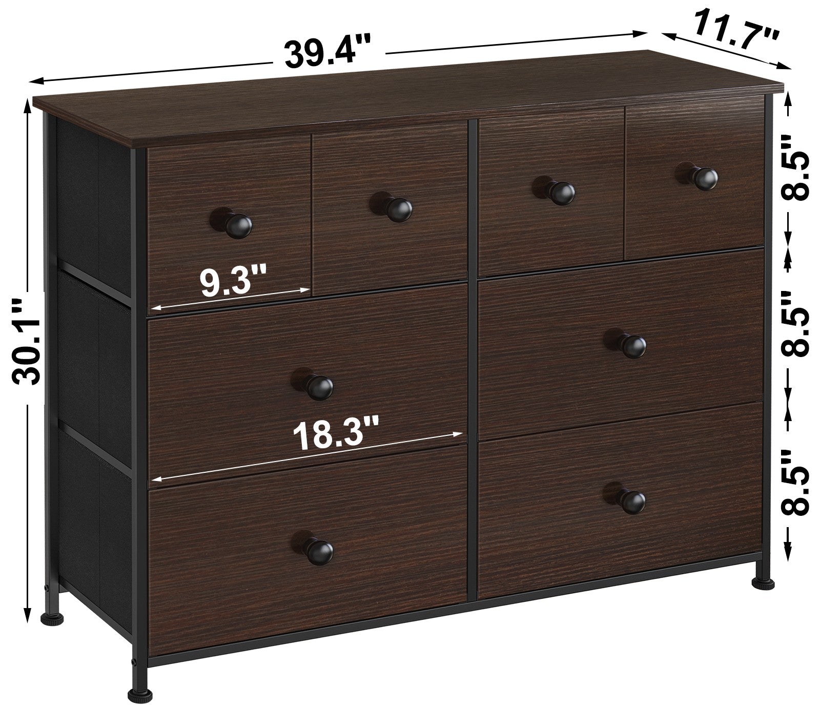 - Modern storage solutions fabric bin dresser with mdf top and drawer fronts.
