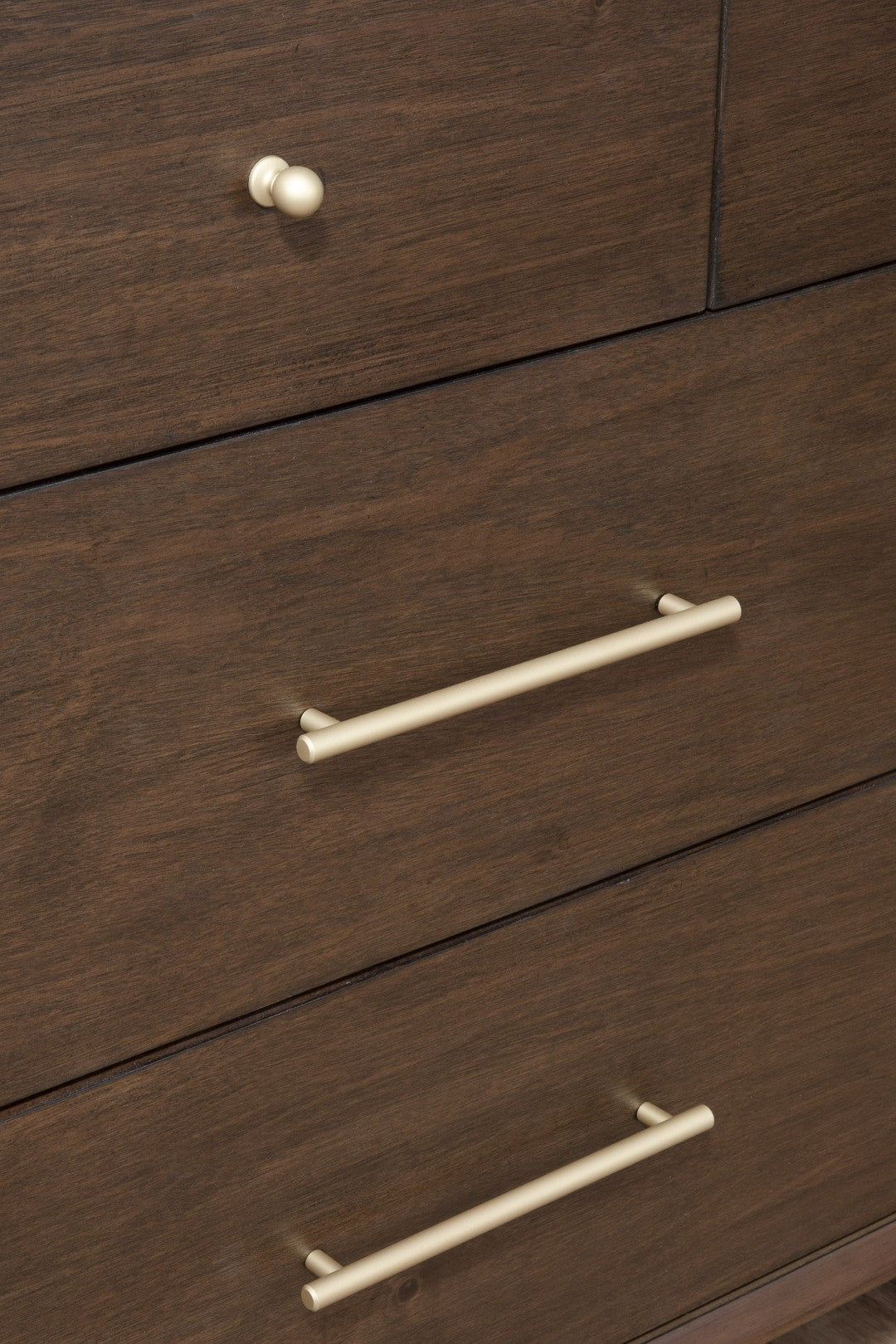 - High quality horizontal dresser with dovetail drawer joints. Includes played legs and gold metal accents.
