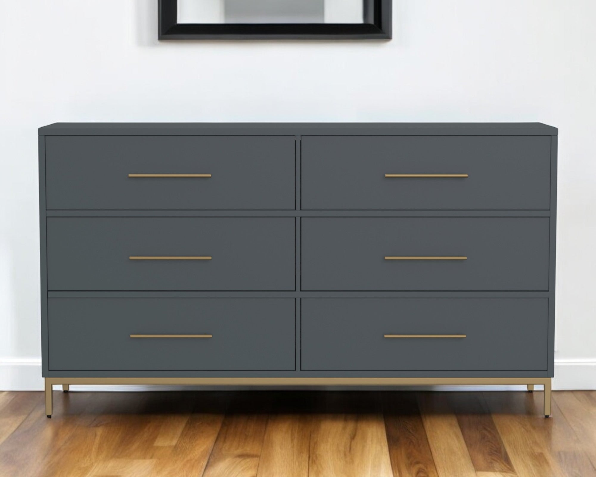 - Modern style features a dark slate gray accented with gold feet and drawer pulls for a chic color combination.