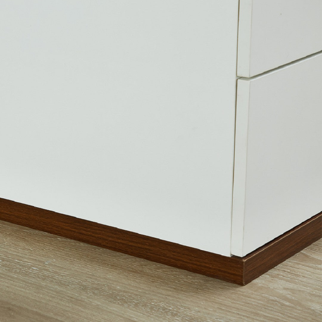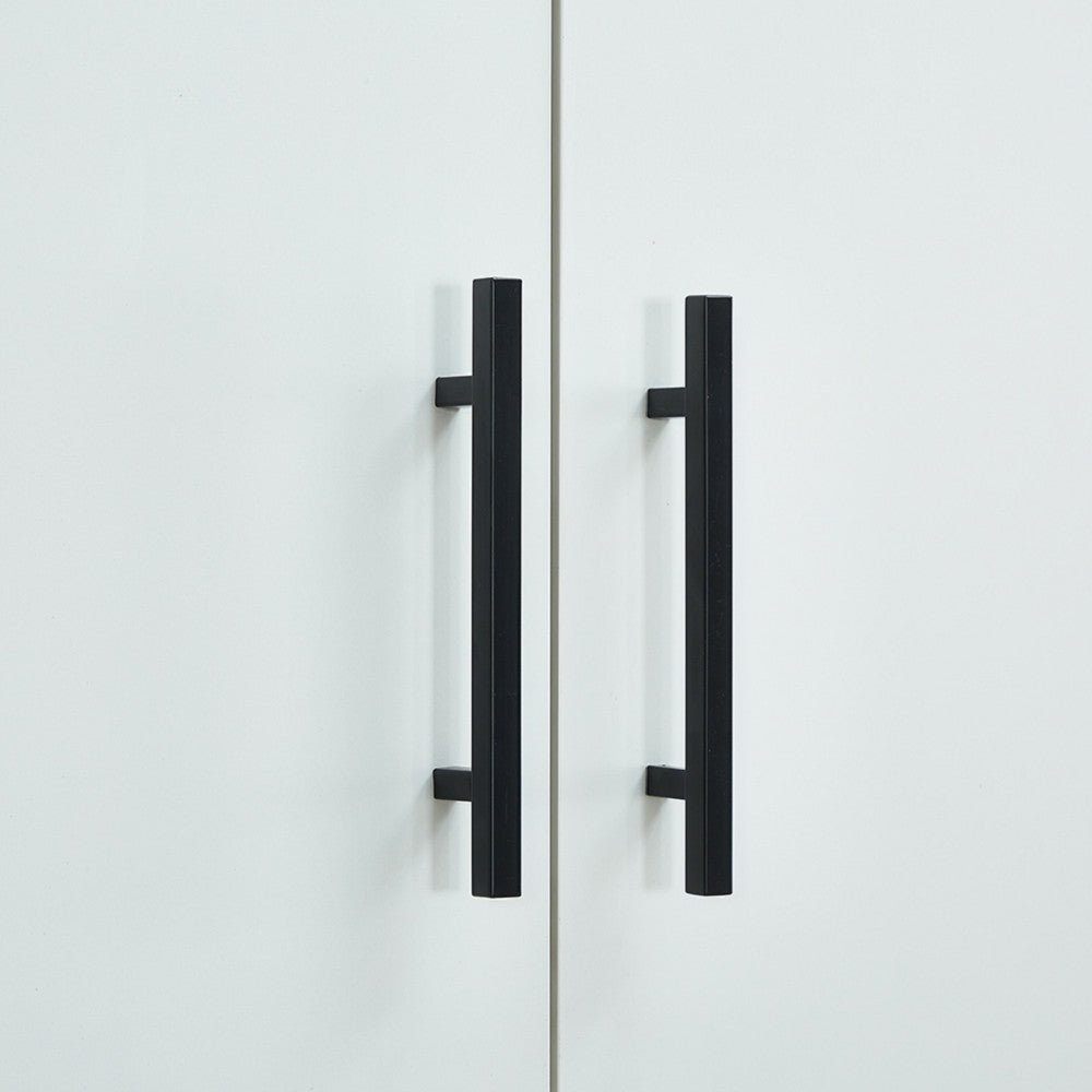 - Crafted from durable manufactured wood with a sleek white melamine finish that is accented by black metal hardware.