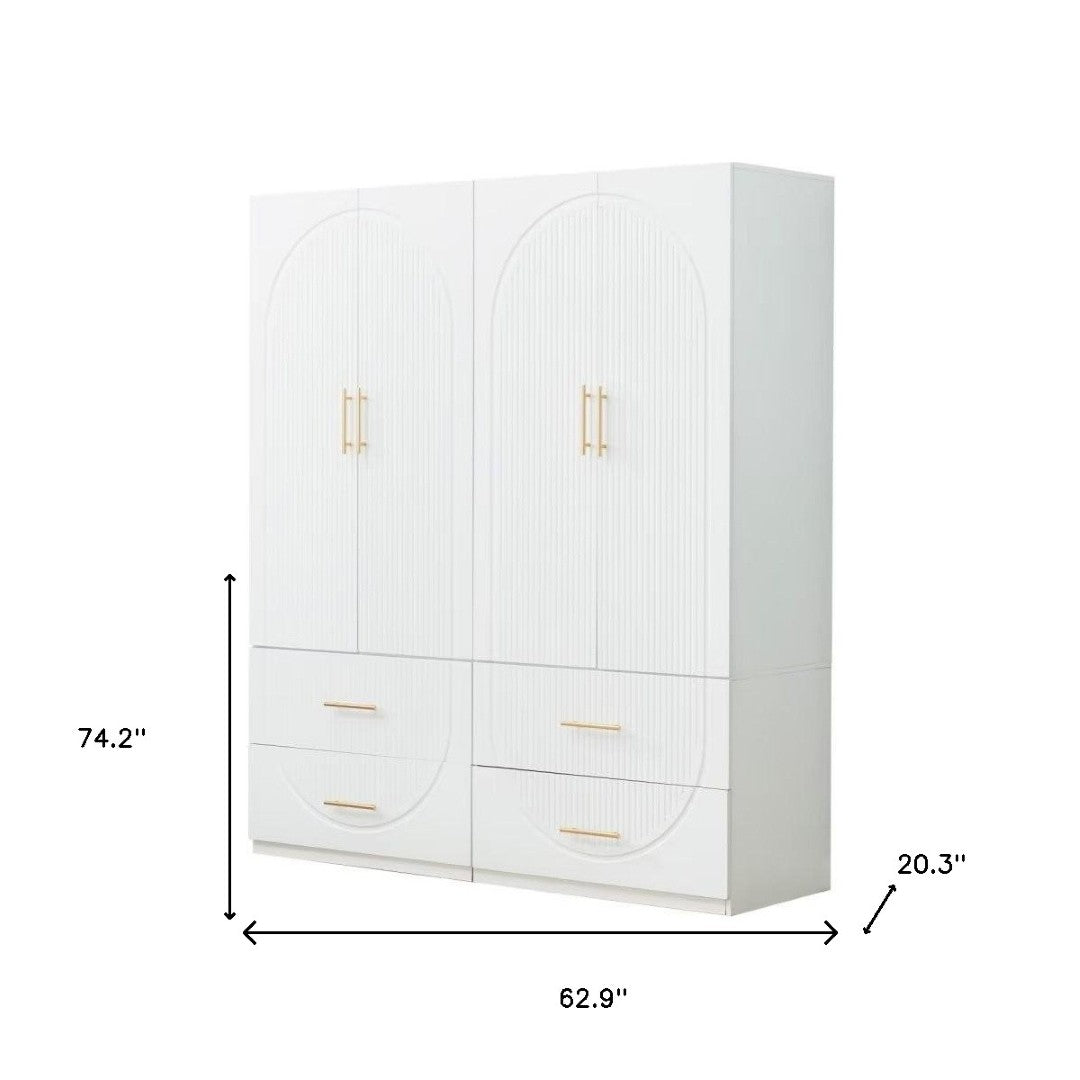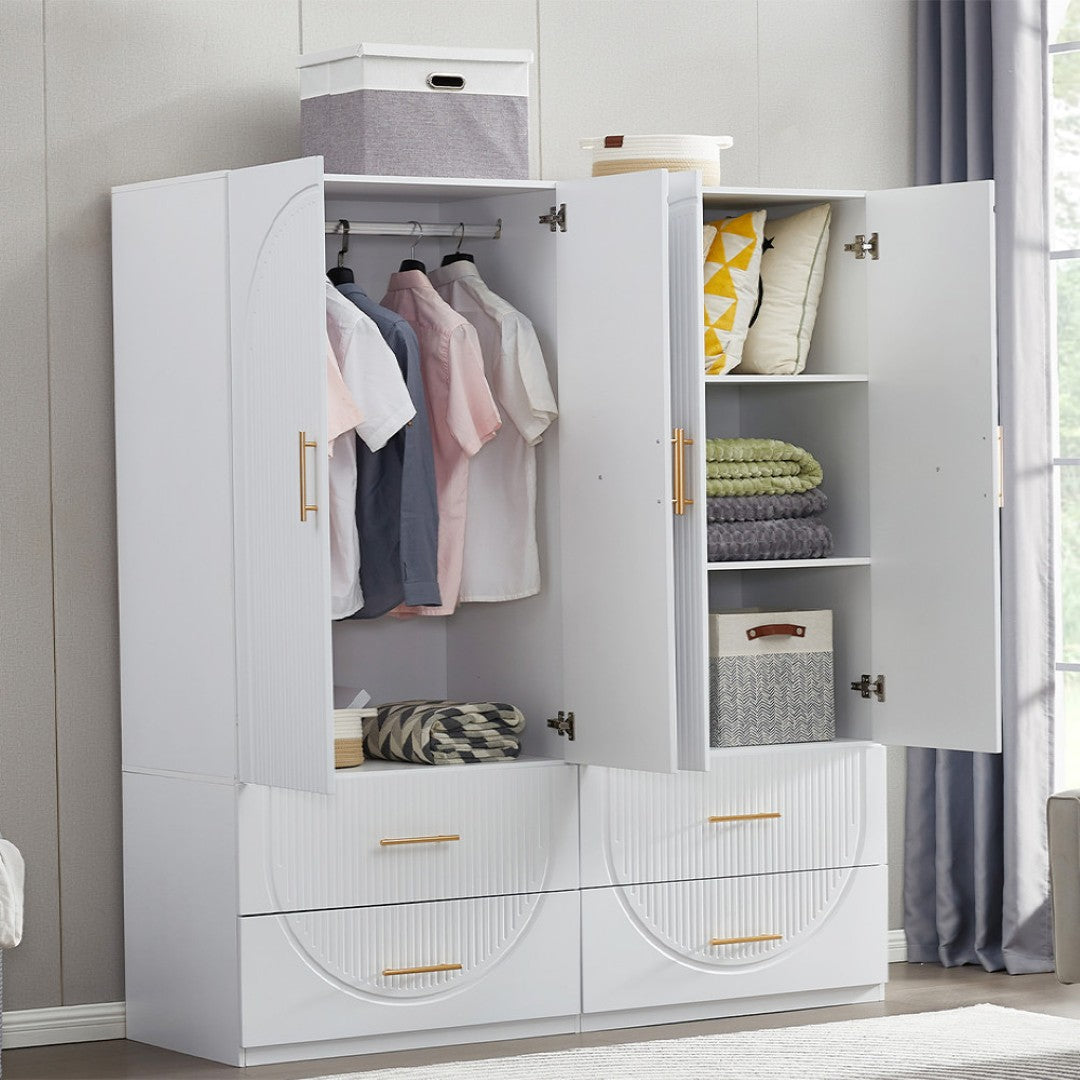 - This armoire includes both dresser drawers and wardrobe doors that open to reveal shelves or a space to hang clothes.