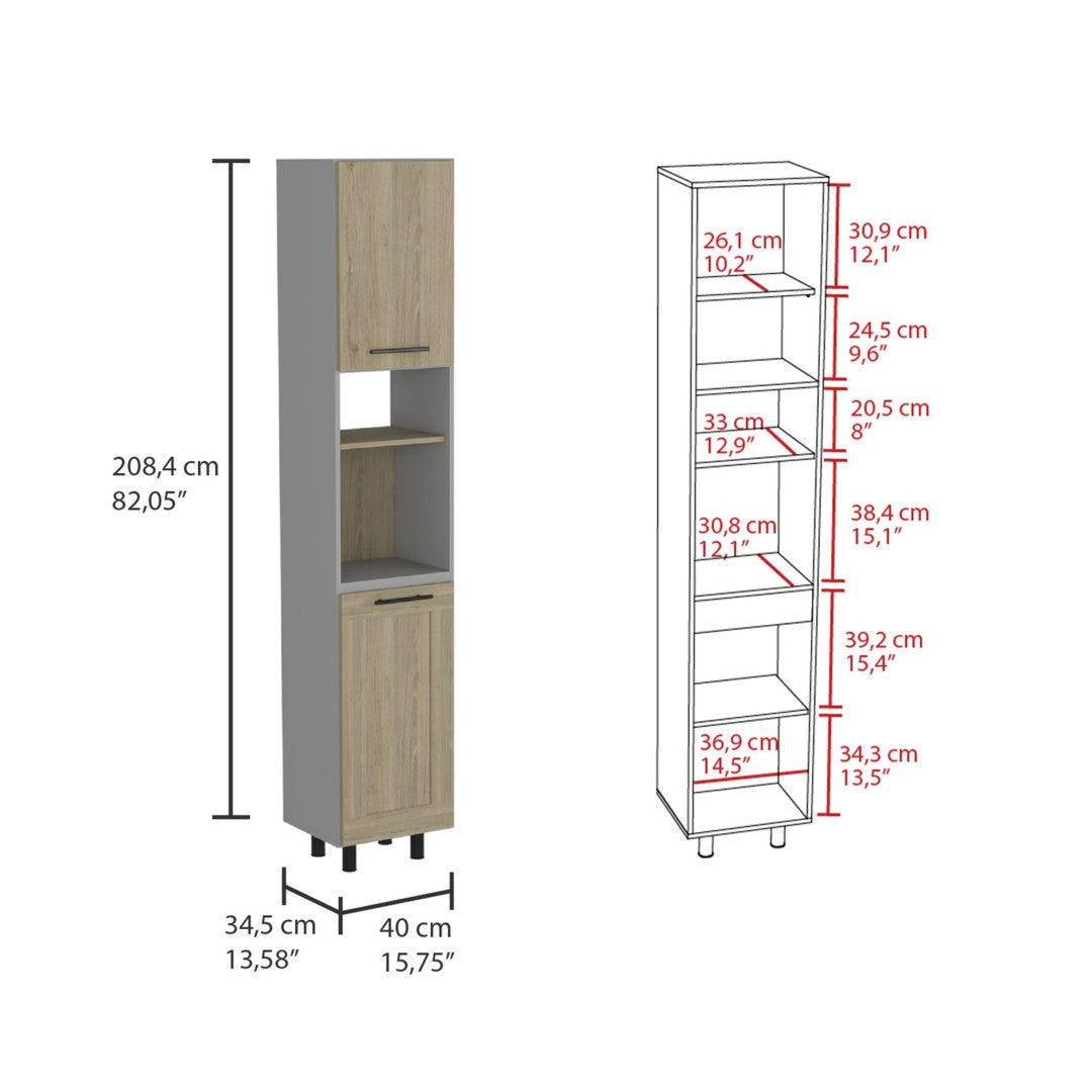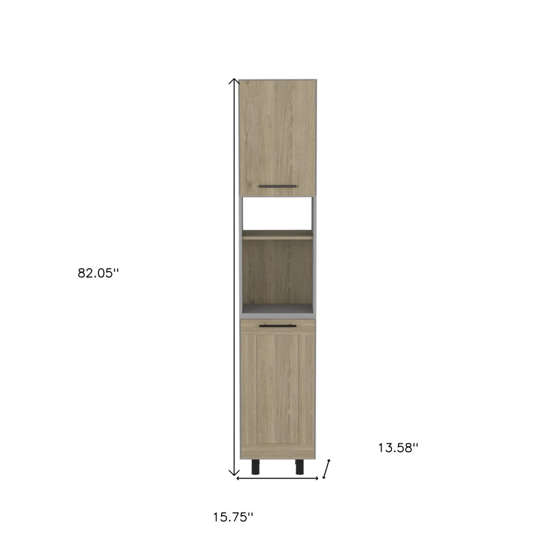 - Stylish pantry cabinet made from durable manufactured wood in a chic gray and oak finish.