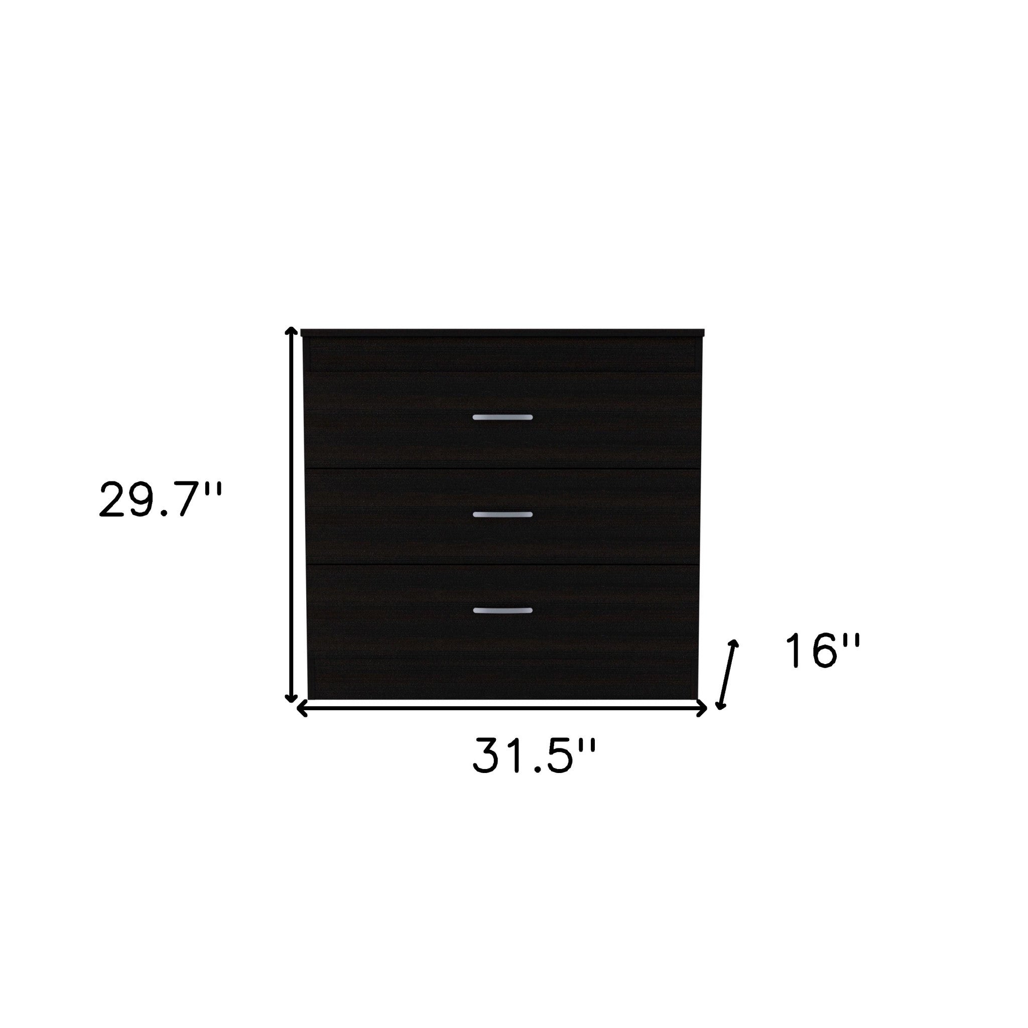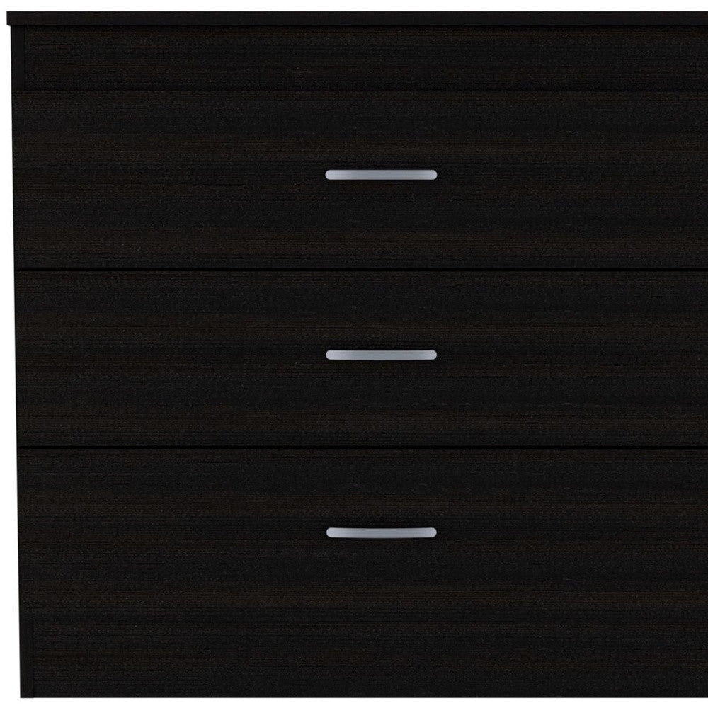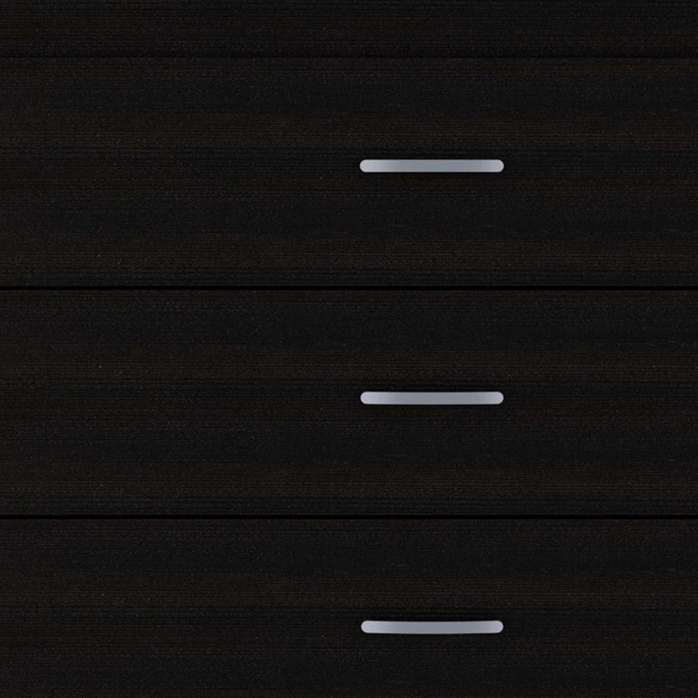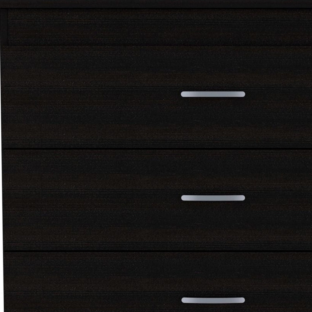 - Features a black faux wood finish with sleek and modern chrome finish horizontal drawer pulls.
