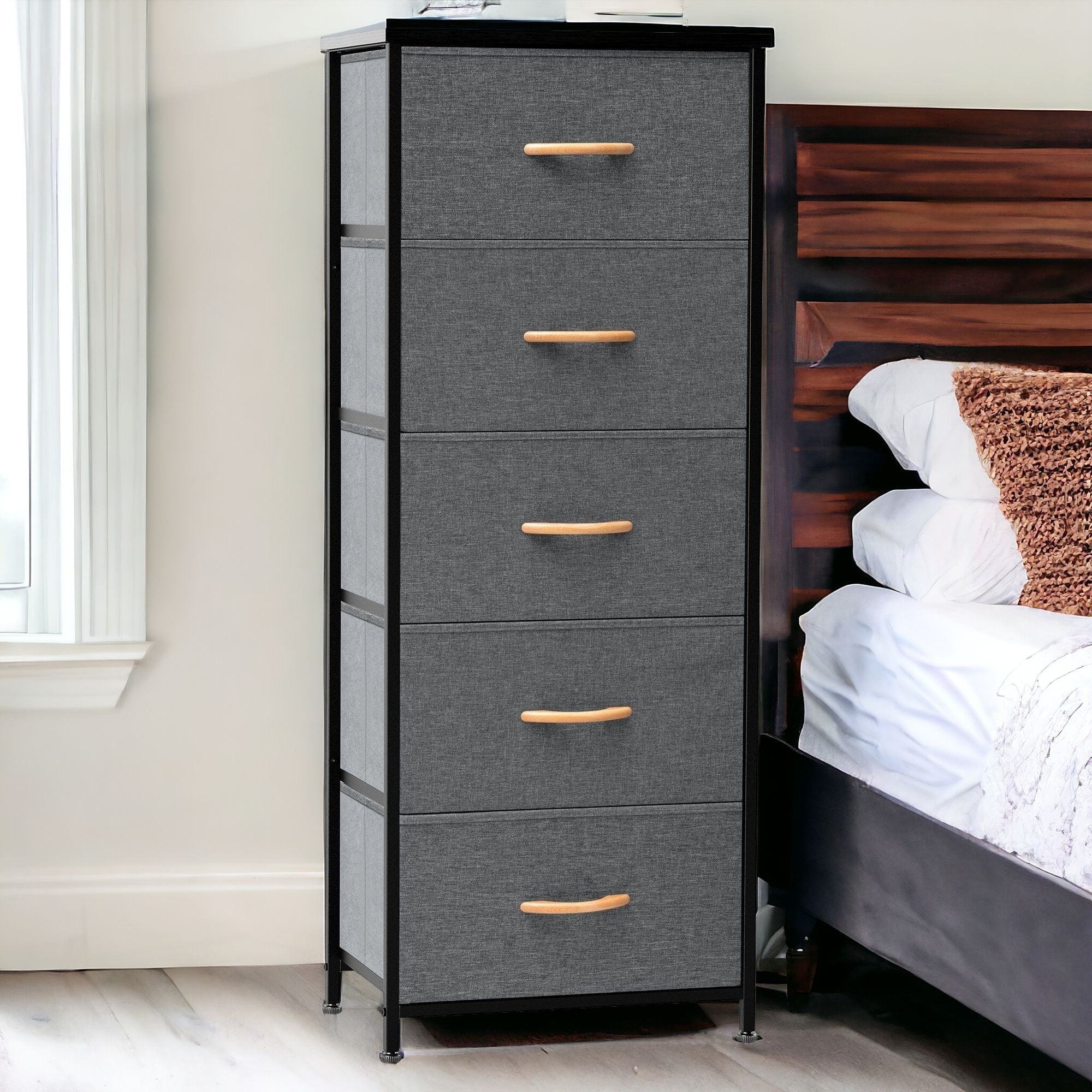 - Material Breakdown: Sturdy Steel Frame, Wood Top, Easy Pull Fabric Bins, Wood Handles