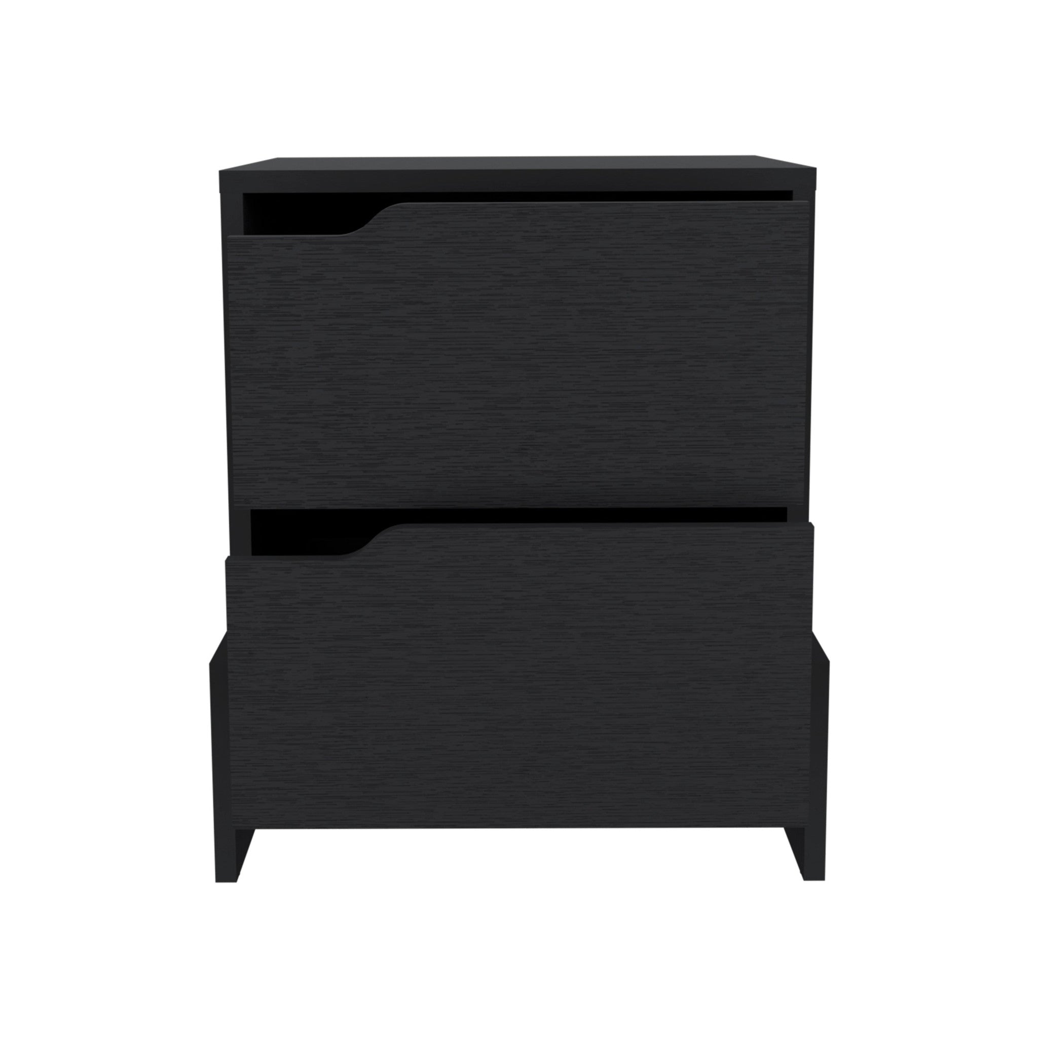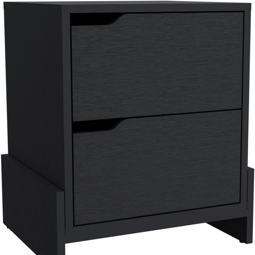 - Modern nightstand with a sleek black frame made from manufactured wood.