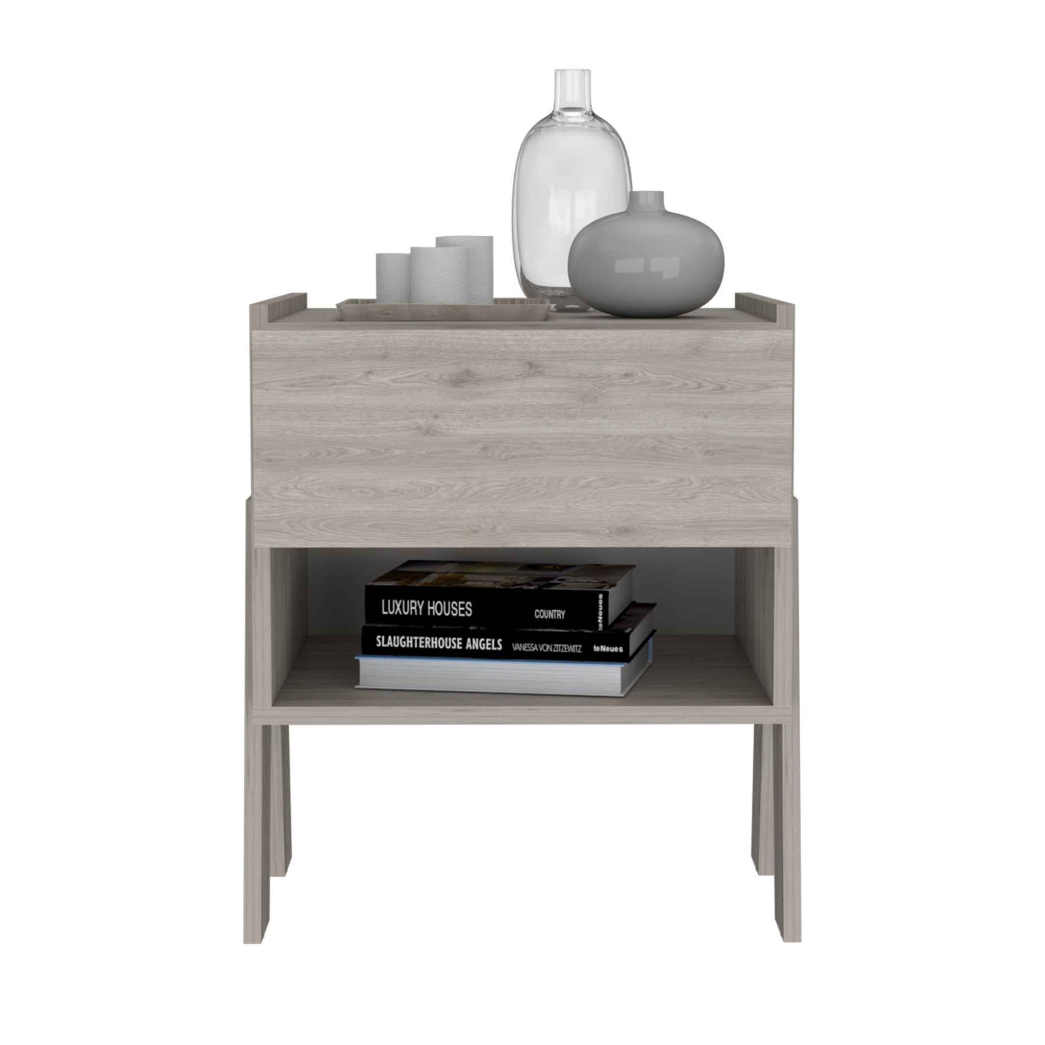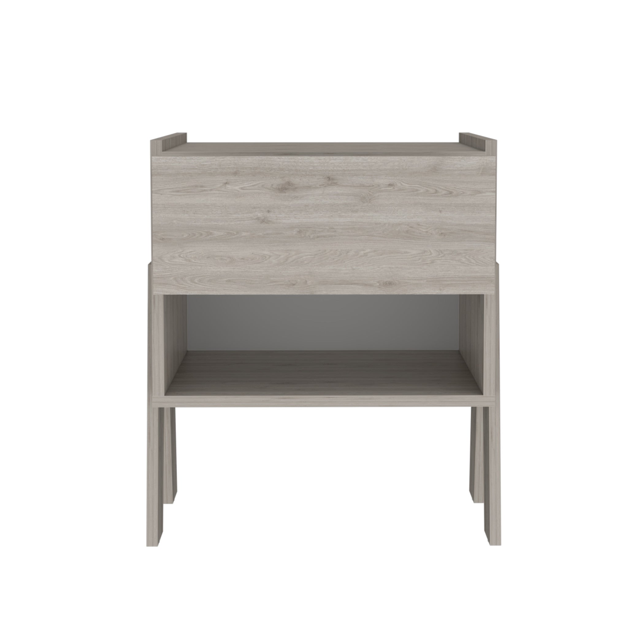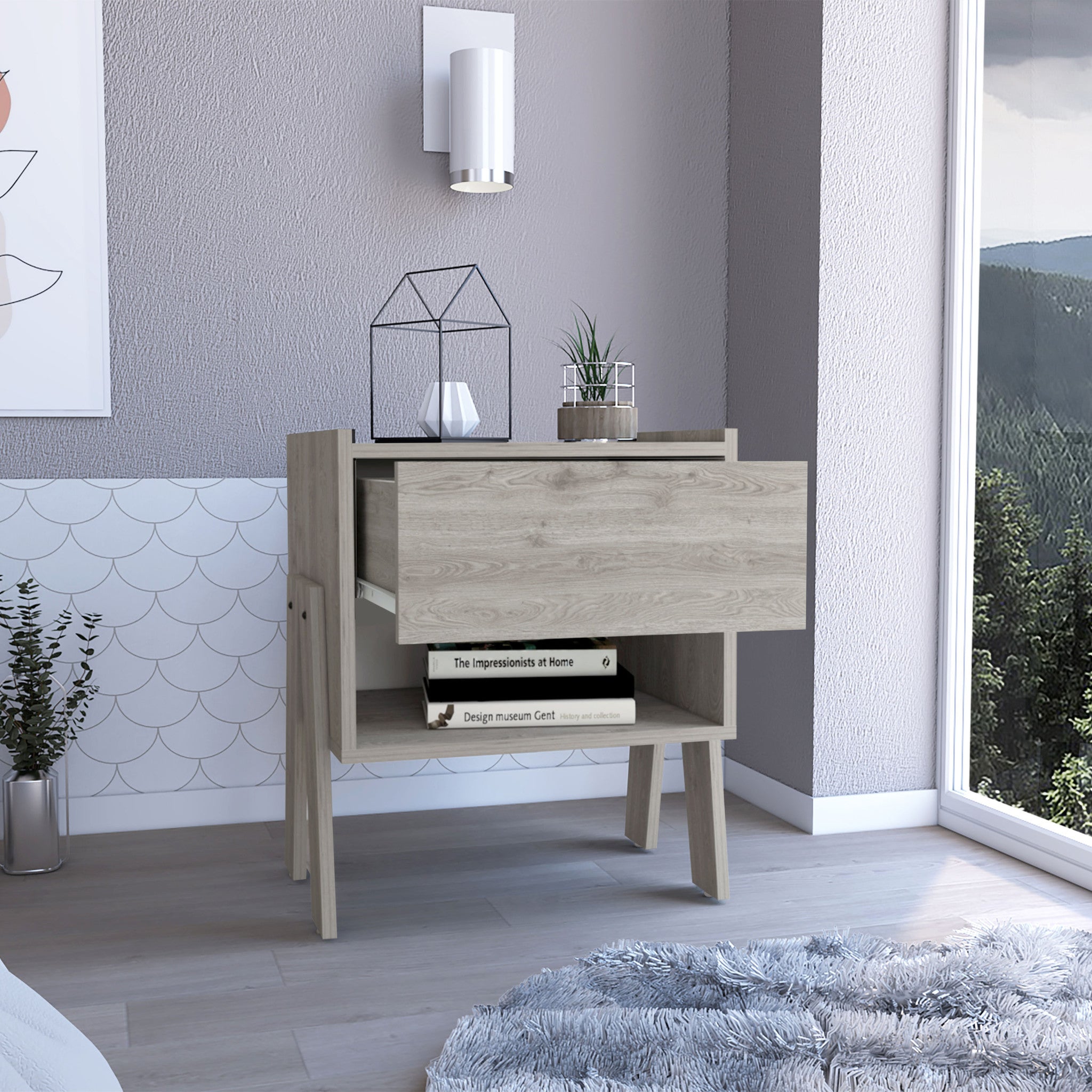 - Modern gray nightstand made of manufactured wood with metal accents and a removable handle.