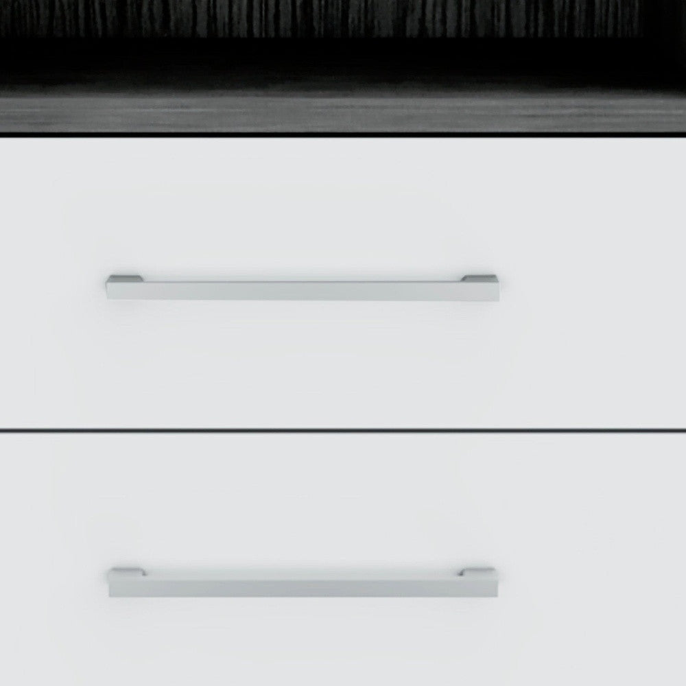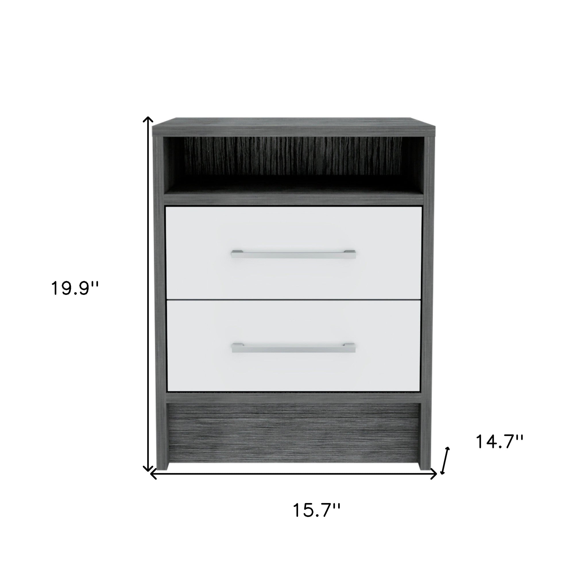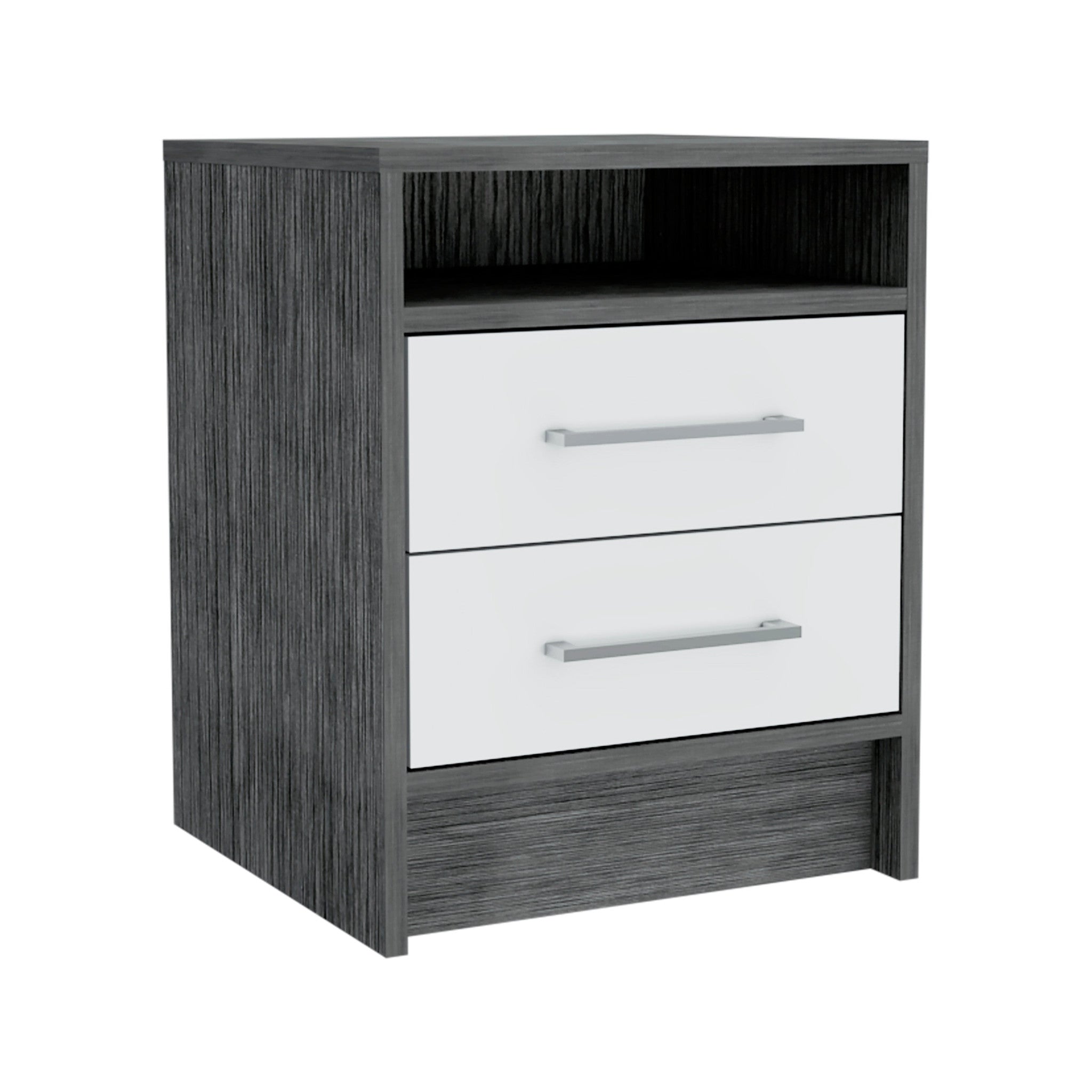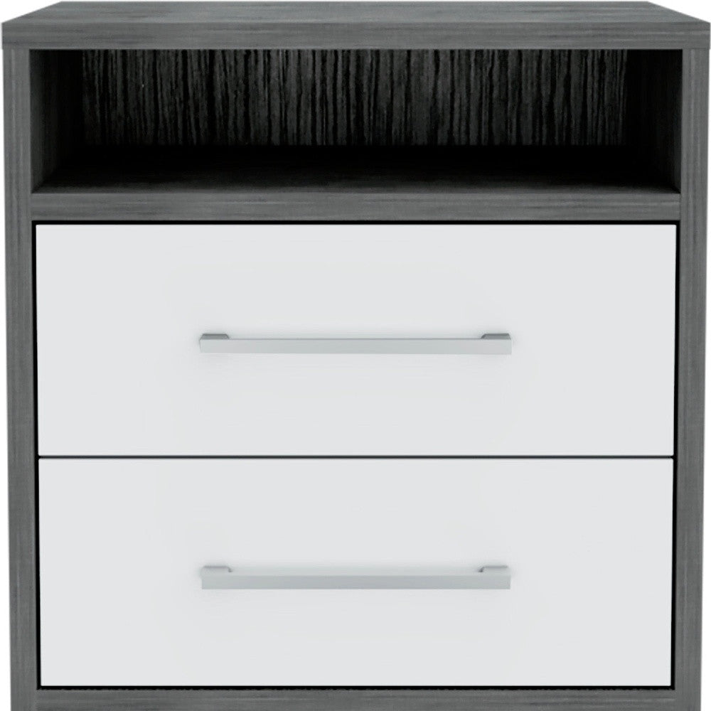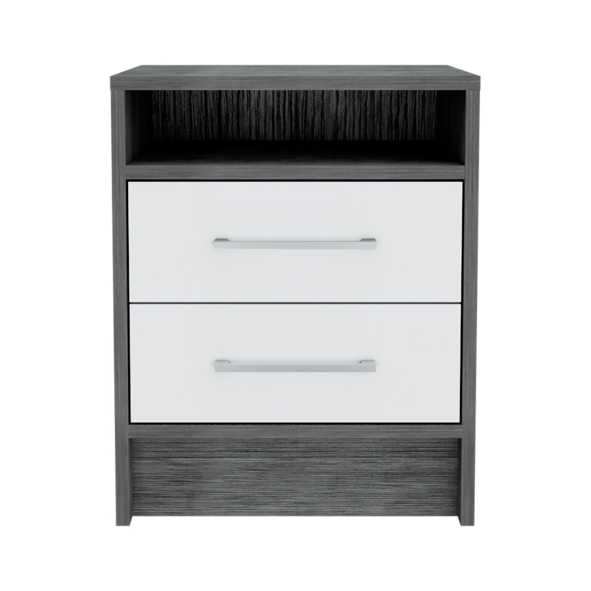 - Modern, gray nightstand made from manufactured wood with a metal accent handle.