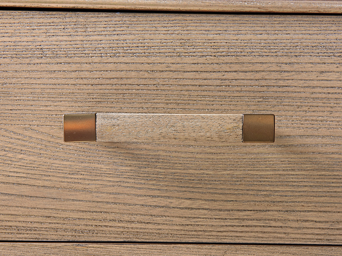 - **Custom Hardware**: Elegant bar pulls made of wood with metal end caps in an aged silver finish, enhancing both style and functionality.