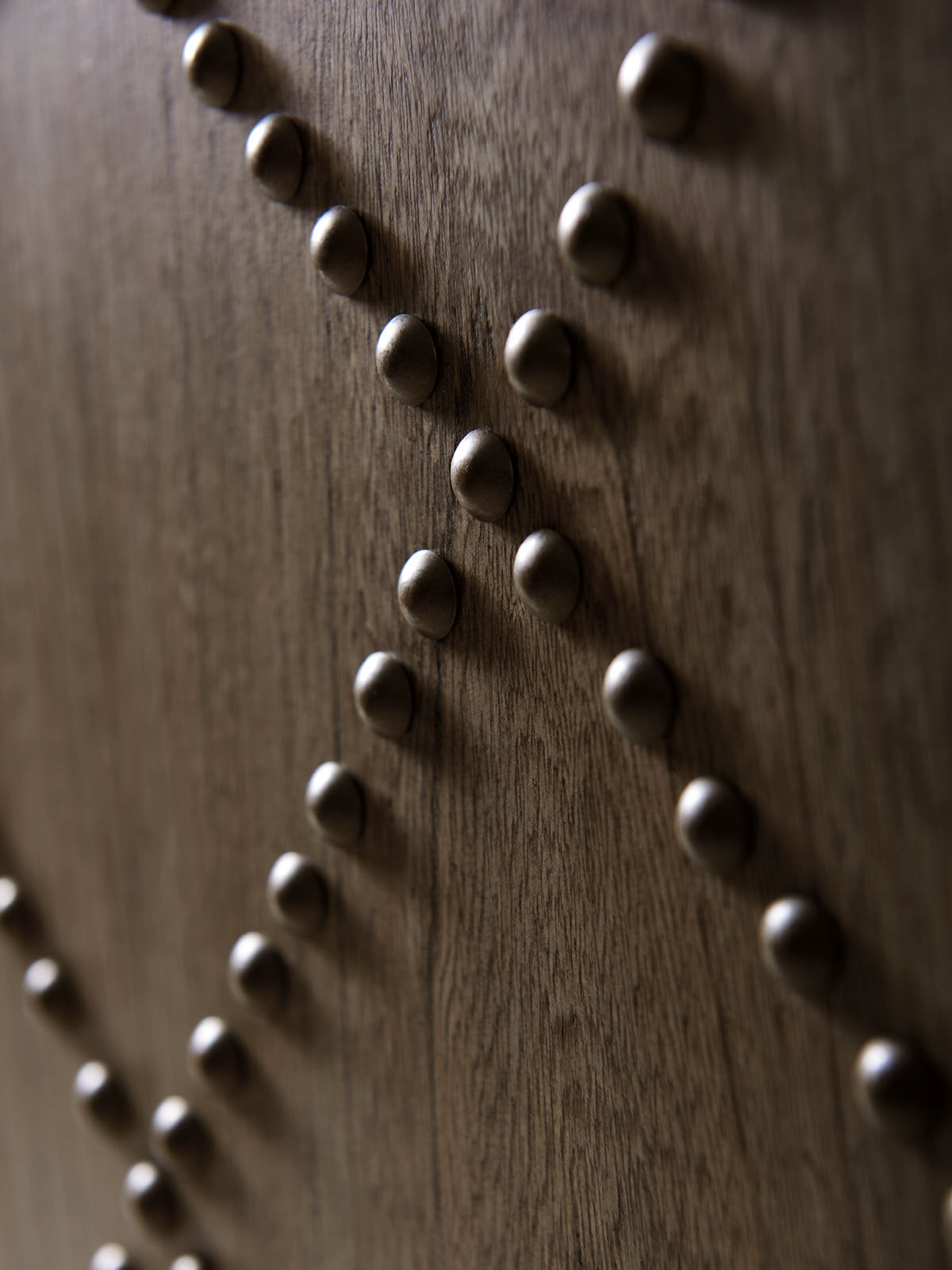 - Features two doors adorned with a diamond-and-cross pattern of decorative antique brass nailhead trim.