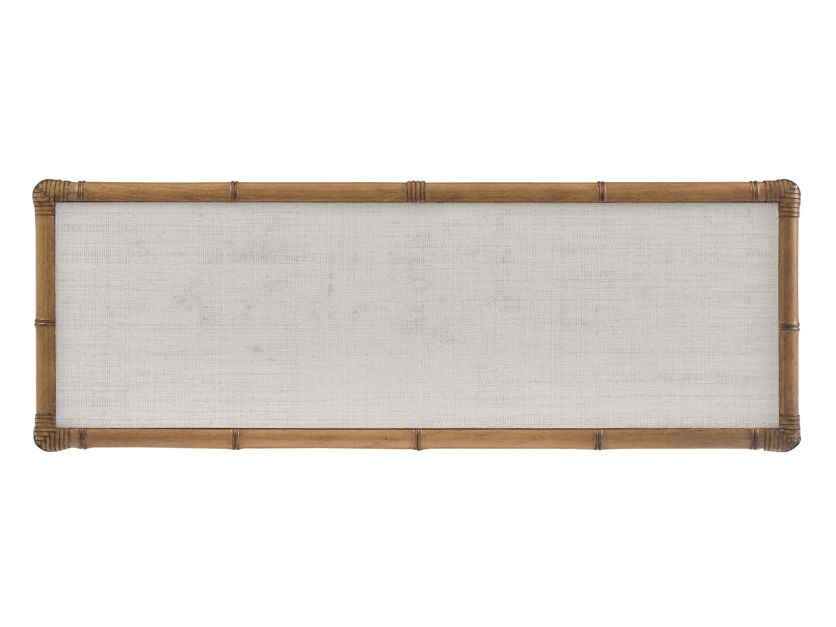 - Inset tempered ultra-clear glass top provides a sleek surface while protecting the woven raffia beneath.