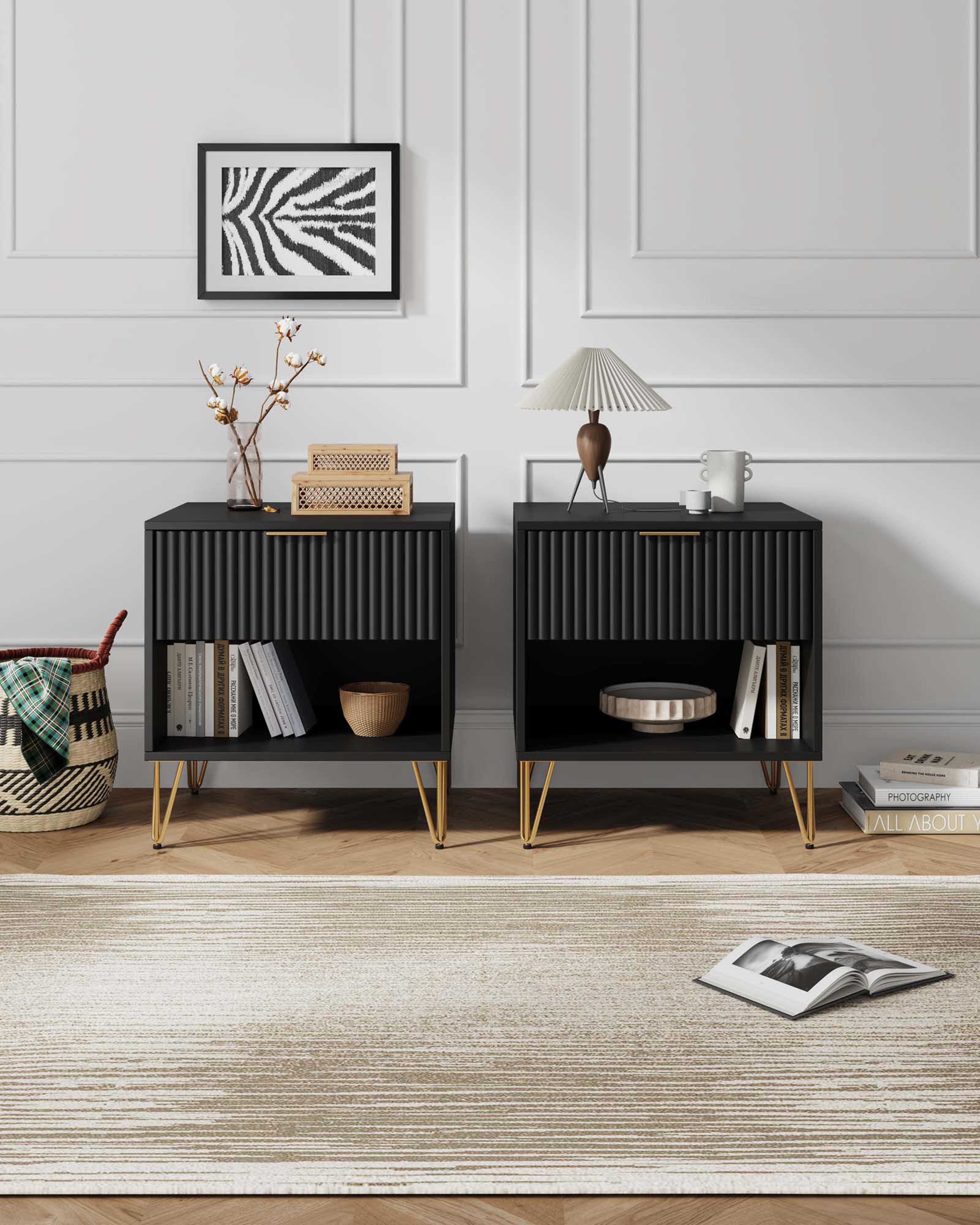 The Manhattan Comfort DUMBO Collection brings tasteful modern glam to your home! With its unique vertical ribbed drawer front, full extension and soft close , and stylish splayed metal legs, the collection is not only a true beauty but also made with quality! Stunning variety of s with sleek metal horizontal handles. DUMBO is what you have been looking for all this time! Make your house a home with the DUMBO Collection.- Modern-Contemporary with a taste of Glam - Nightstand for Bedroom and Living Room Use. Set of 2.