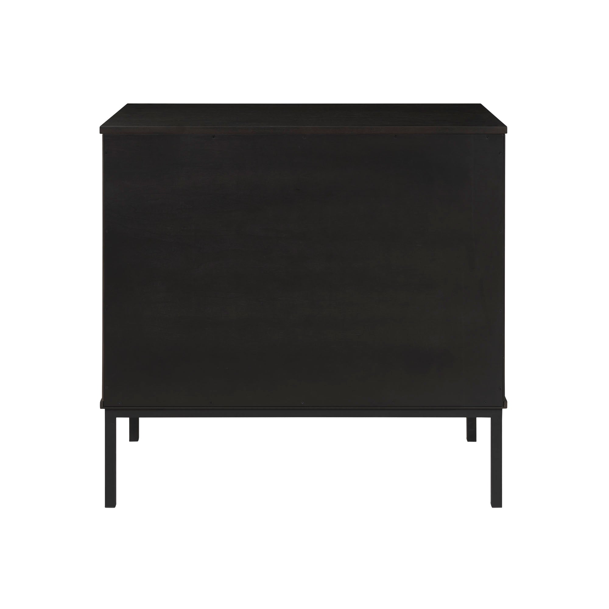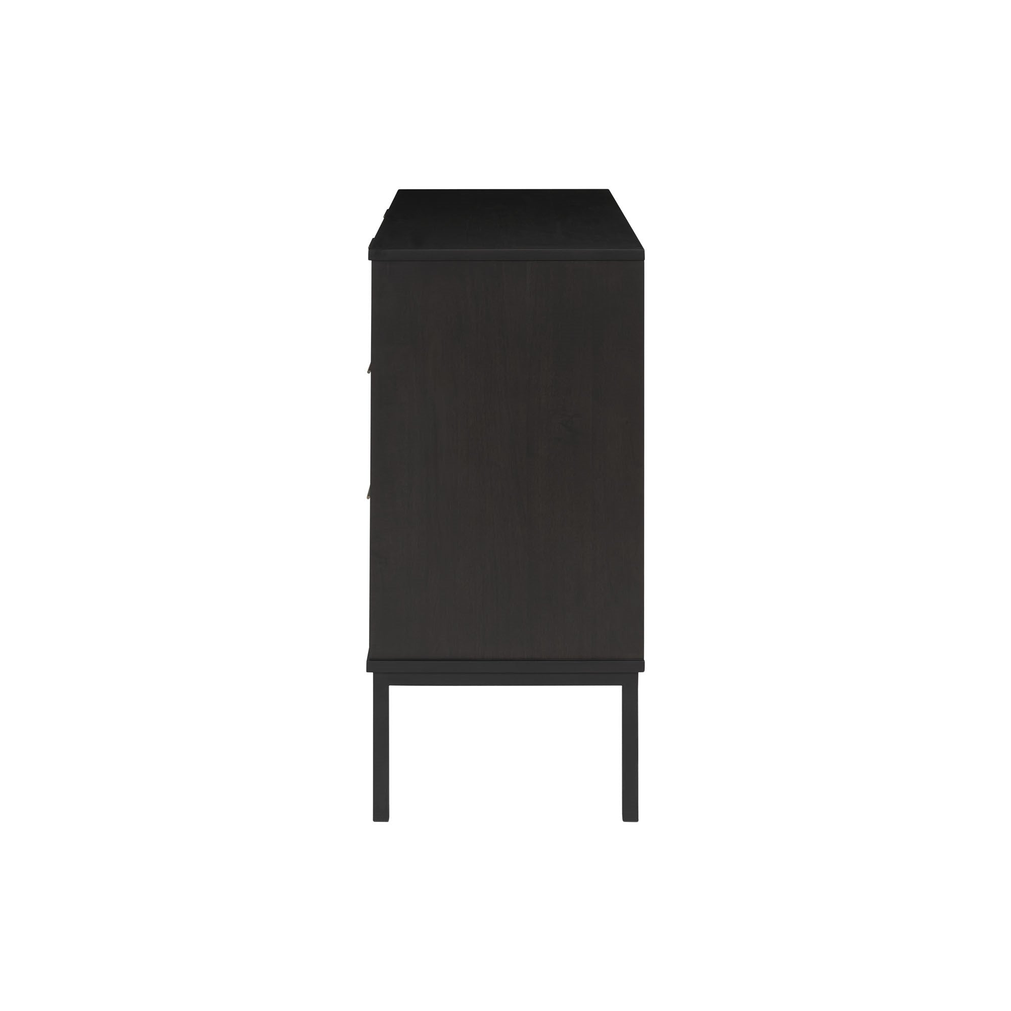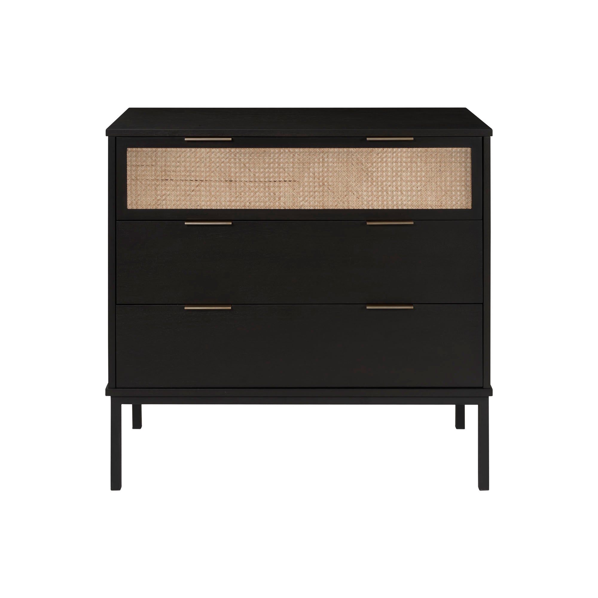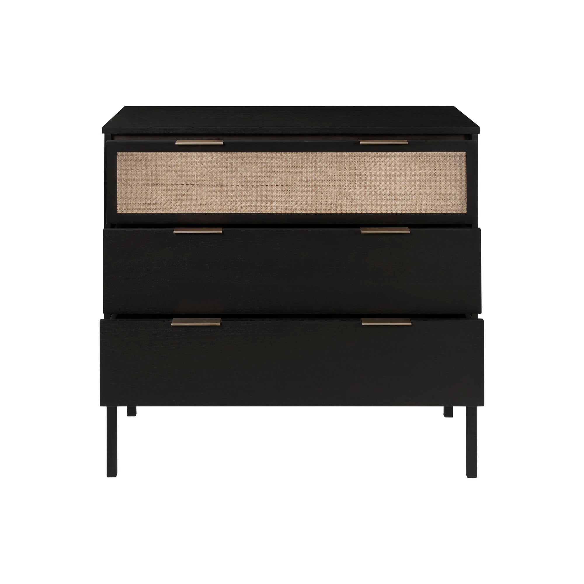 - Modern with Minimalist profile, the Caine Rattan Collection highlights cabinetry with 1-drawer panel constructed of decorative cane webbing and 2-drawers finished with Acacia wood veneer fashioned on slim, black powder coated steel legs. For durability, ball bearing drawer slides for the drawer are utilized and rubber pads are included for floor protection.