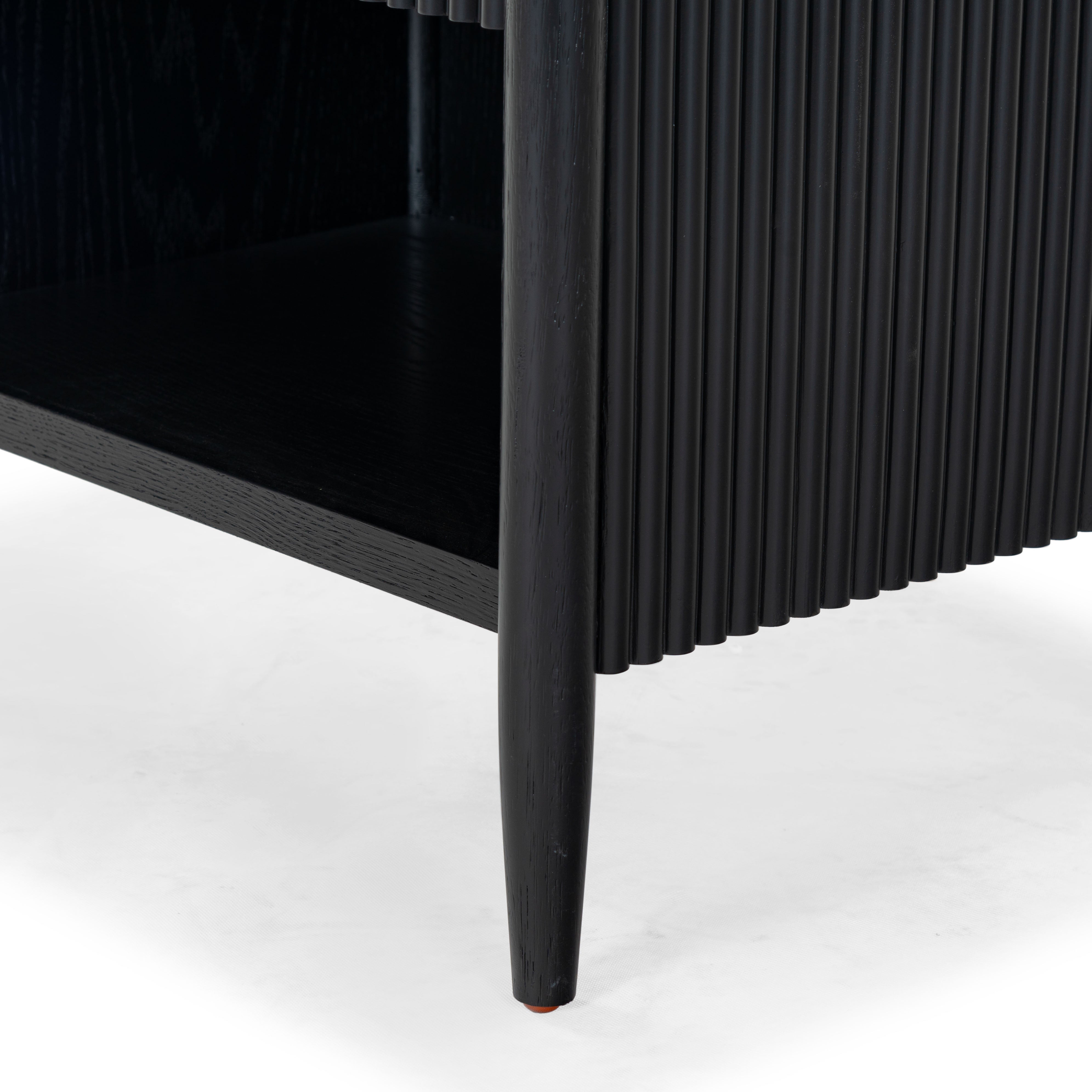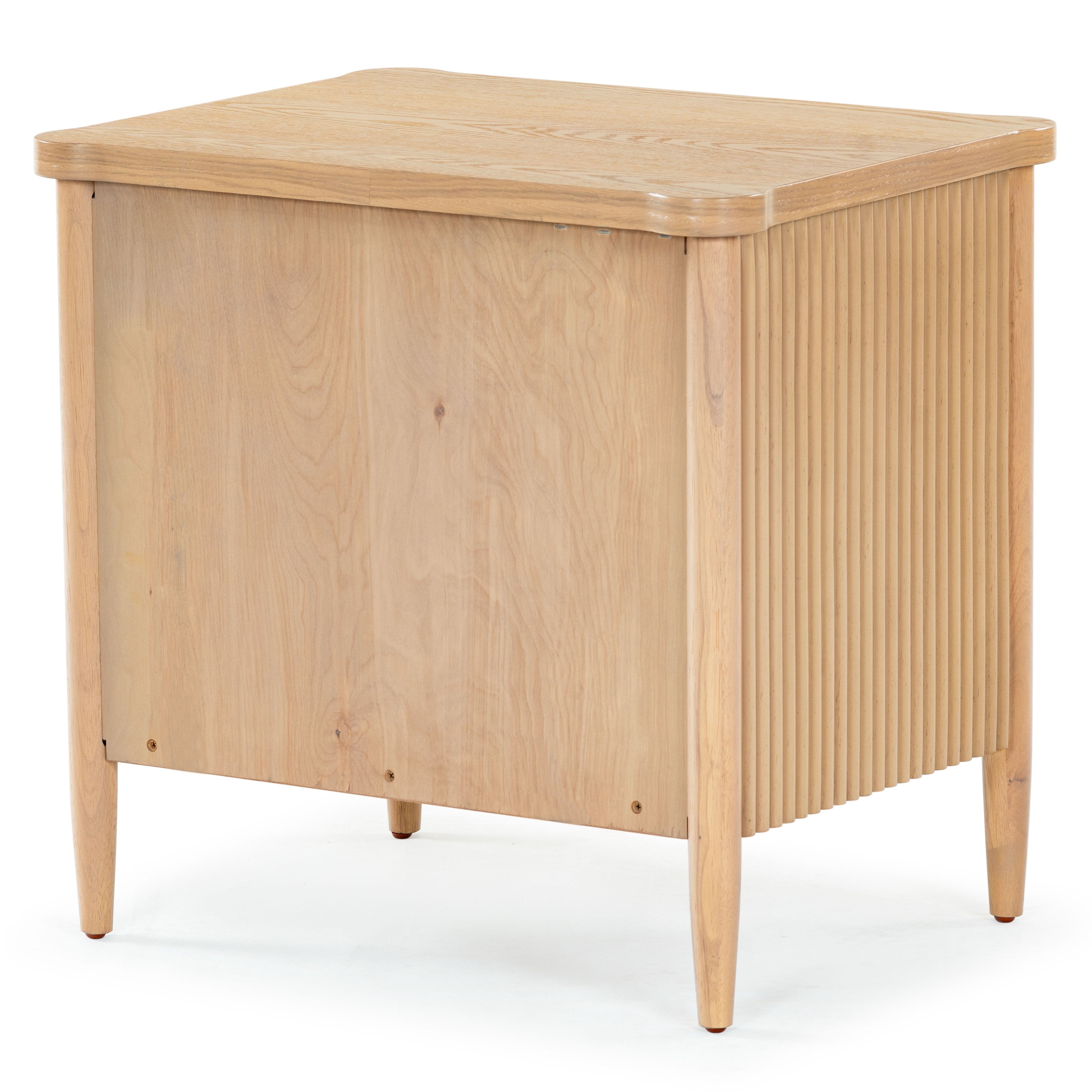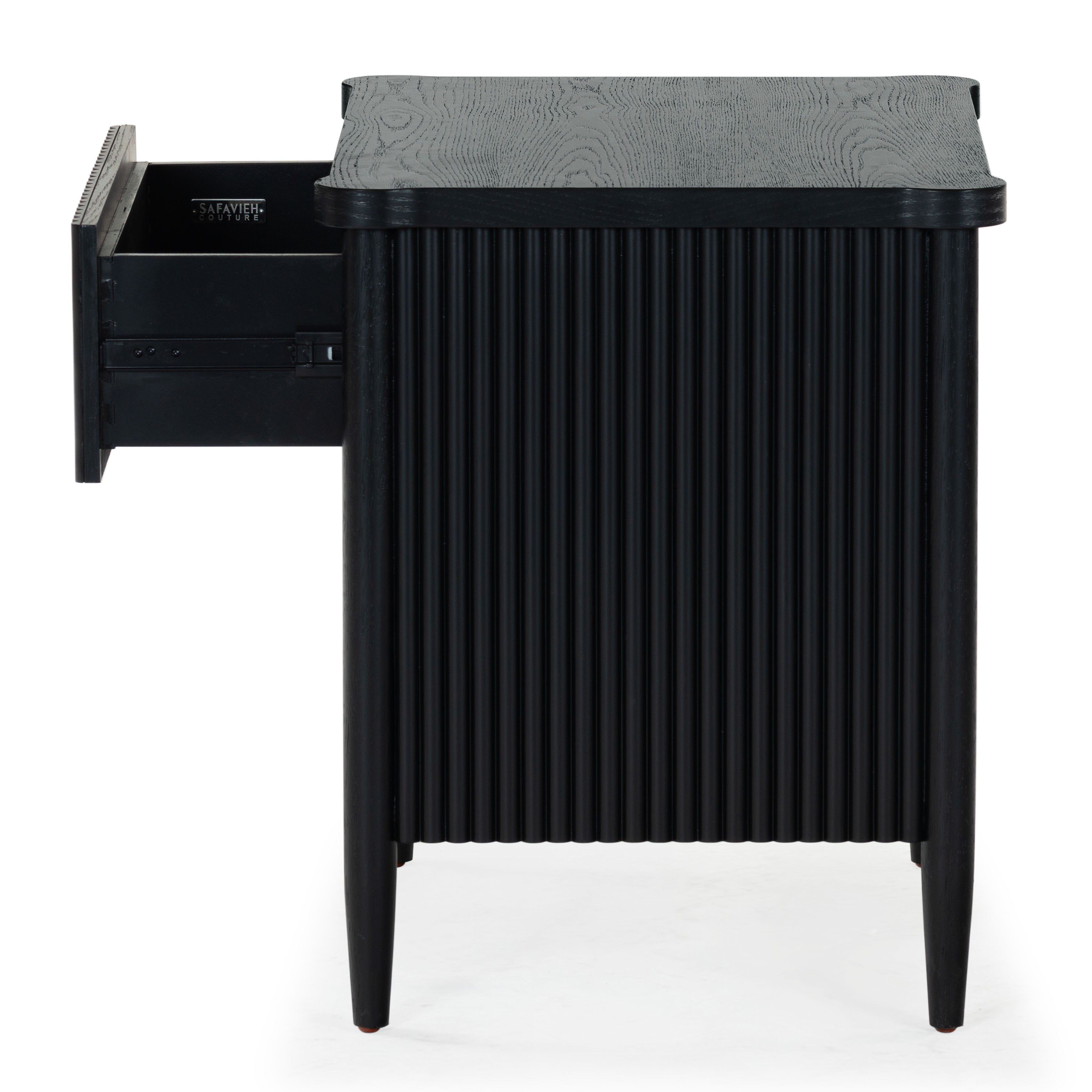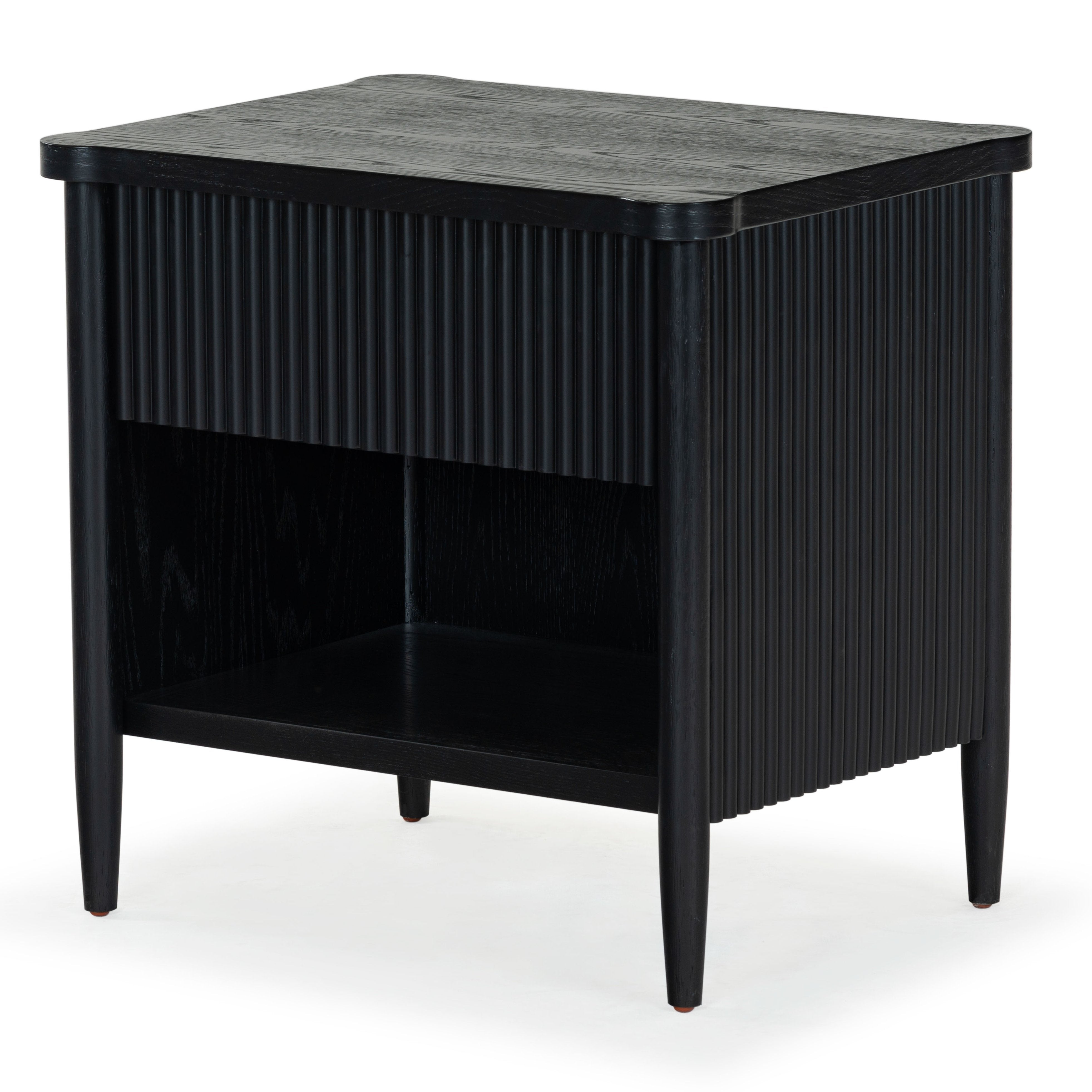 - Crafted from wood and featuring polyester resin drawer fronts, the Shelbie nightstand provides a durable and stylish storage solution for your bedside essentials. The reeded design adds an element of texture and interest, turning an ordinary nightstand into a statement piece.