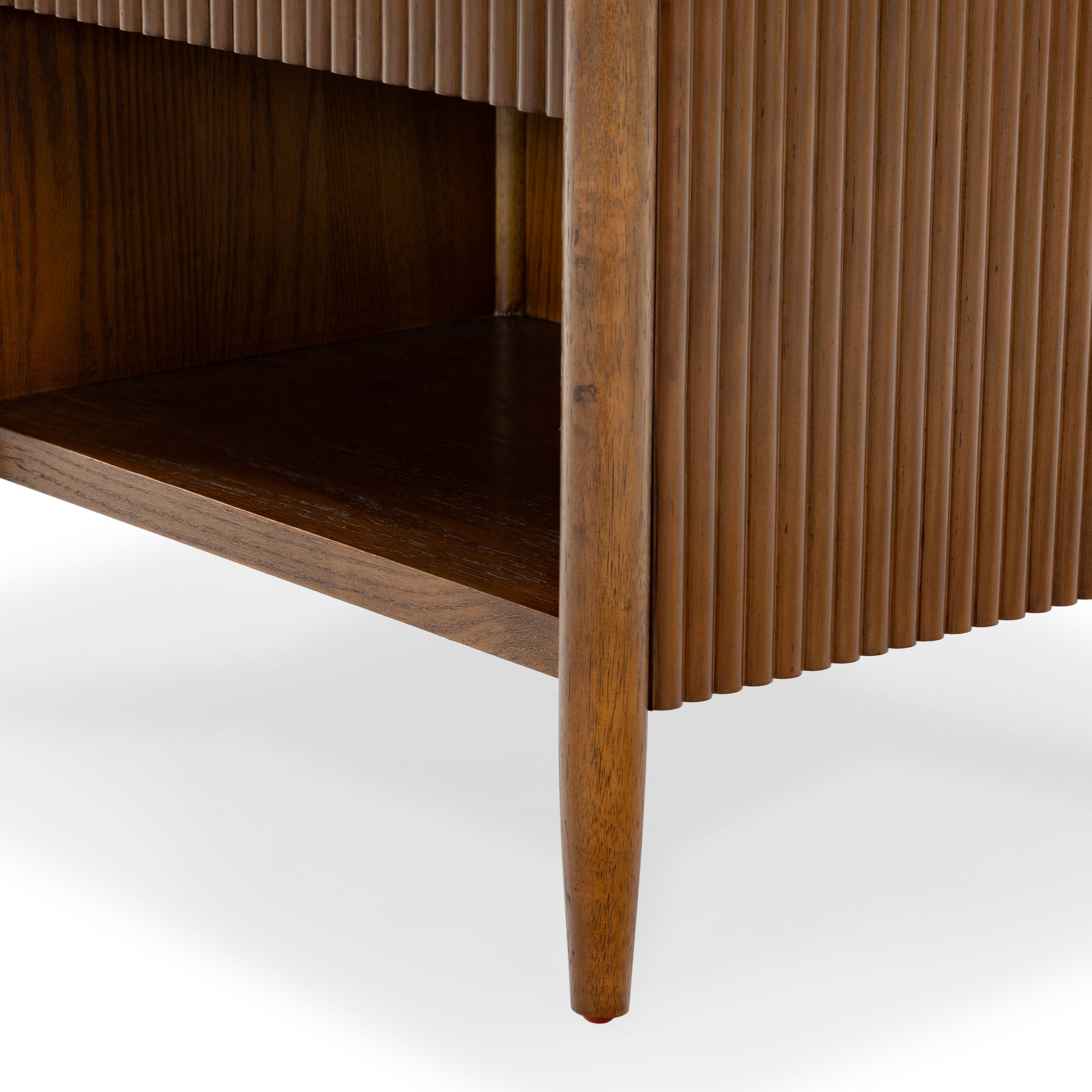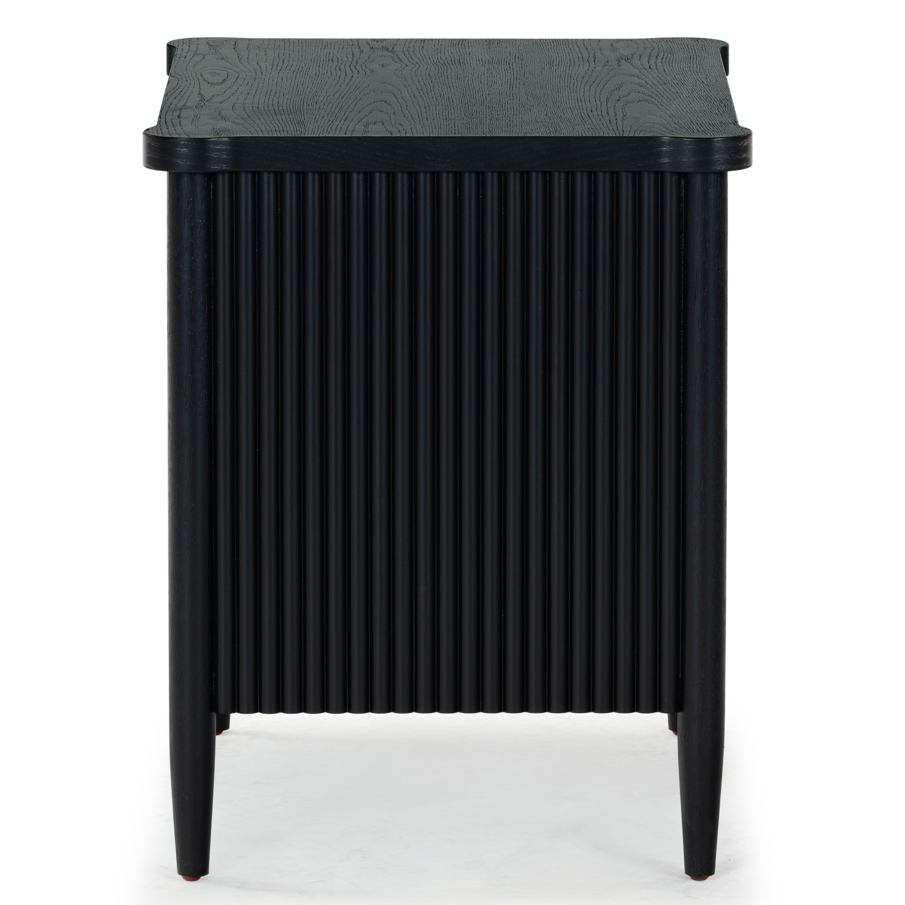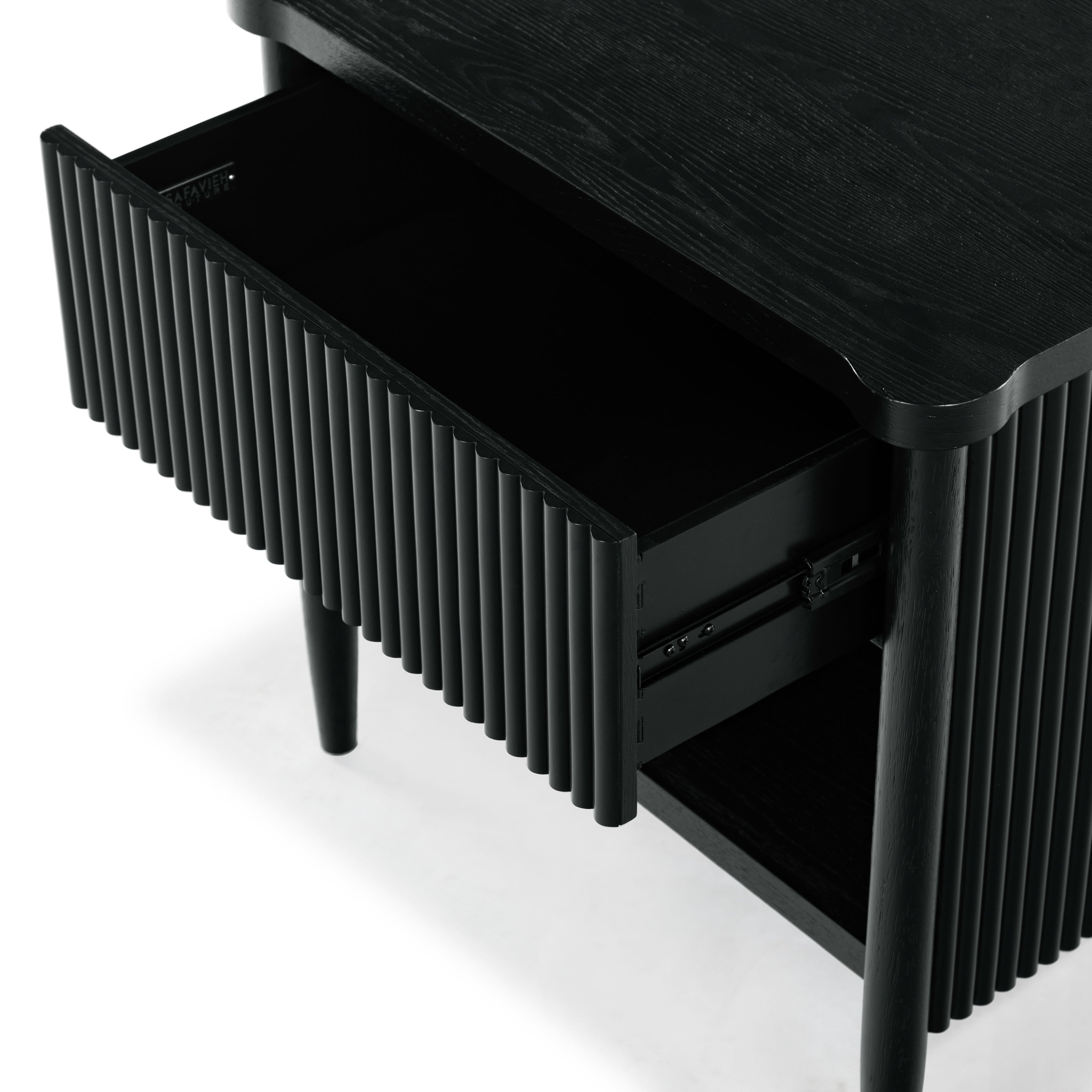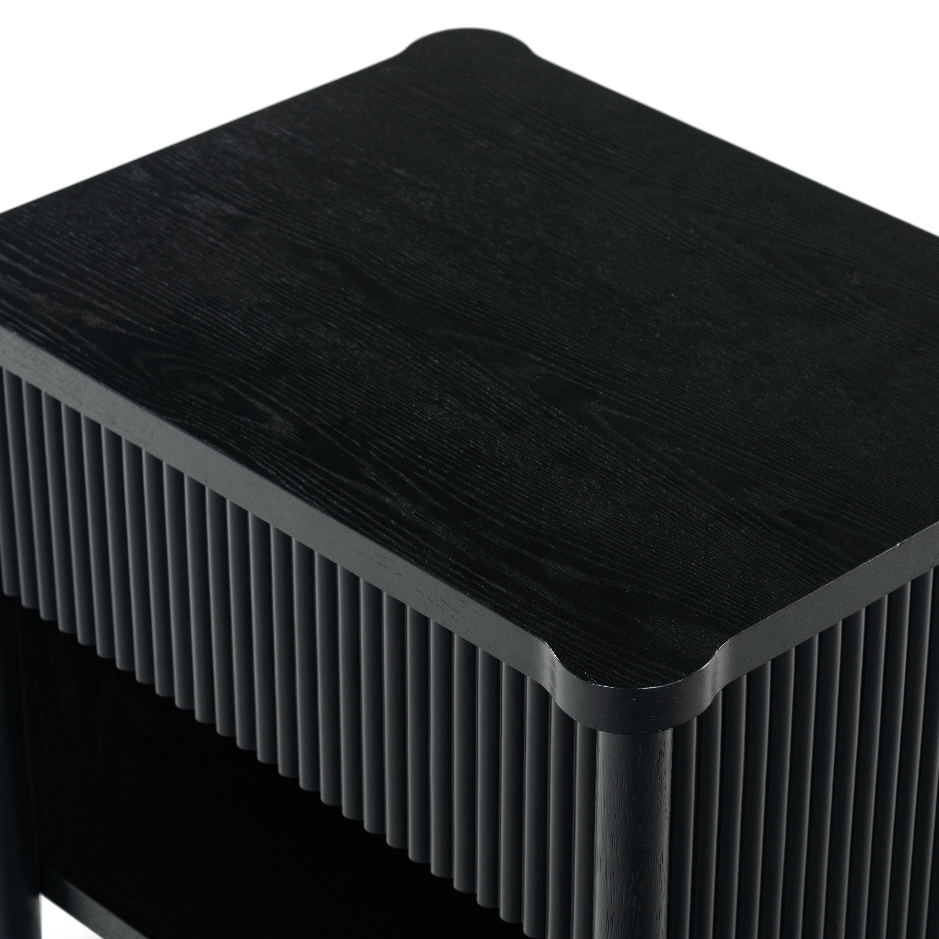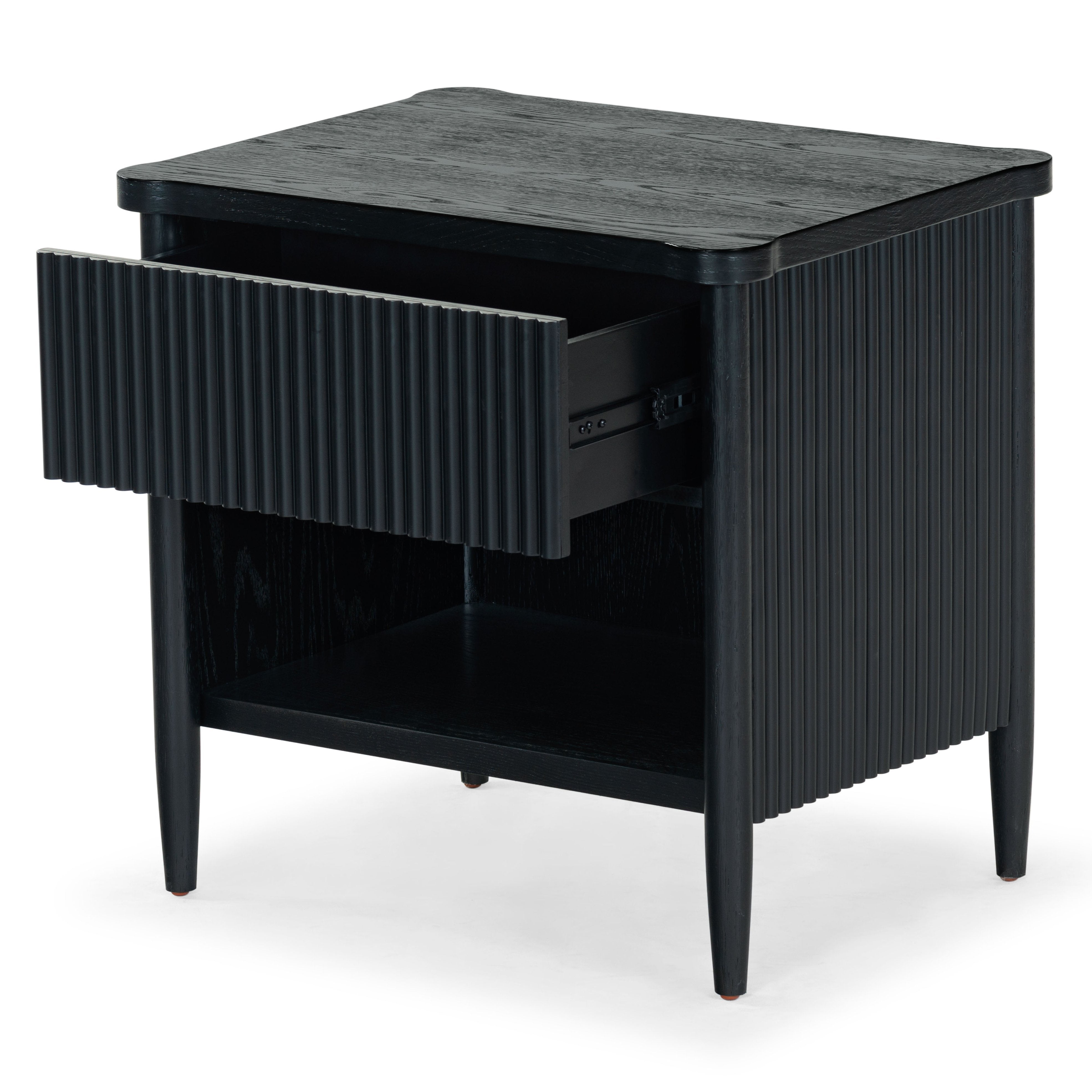 - Crafted from wood and featuring polyester resin drawer fronts, the Shelbie nightstand provides a durable and stylish storage solution for your bedside essentials. The reeded design adds an element of texture and interest, turning an ordinary nightstand into a statement piece.
